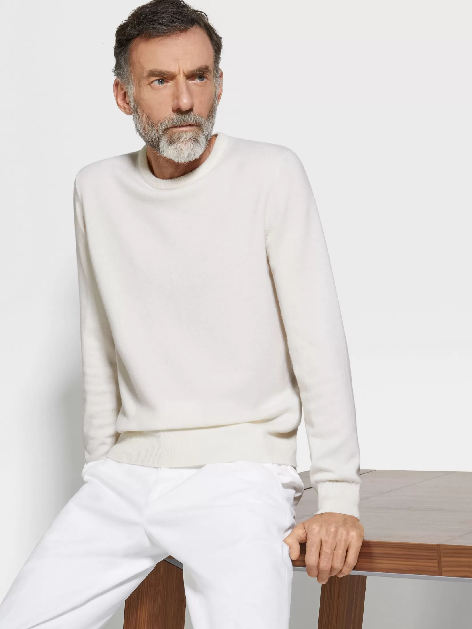 Este jersey de cuello redondo, blanco mixto, está confeccionado con uno de los tejidos más exclusivos de Zegna, Oasi Cashmere, el cual le aporta un estilo lujoso. Sus líneas básicas hacen que su elaboración en punto brille por sí sola. Este jersey está acabado con el clásico cuello redondo y el borde acanalados.