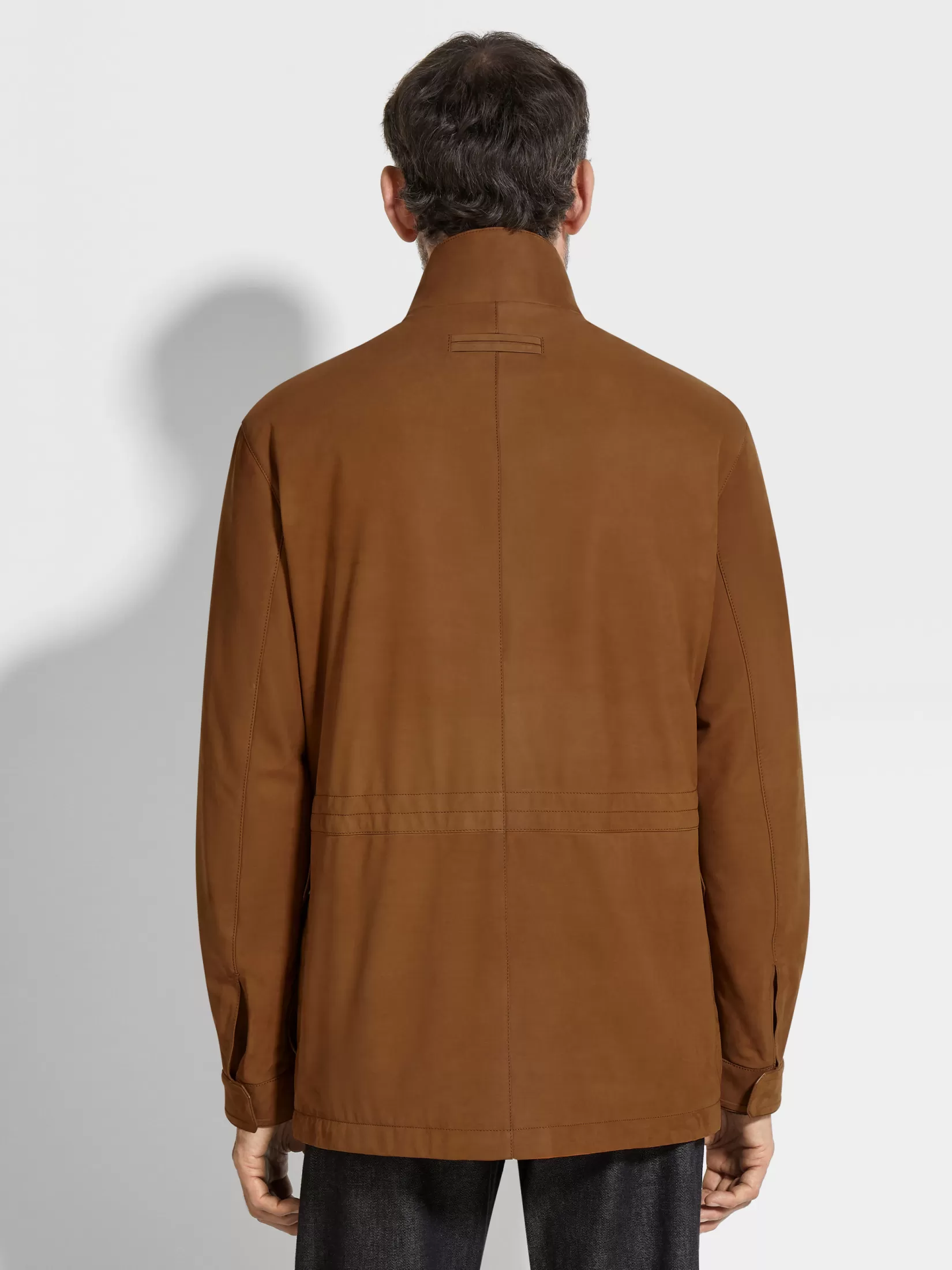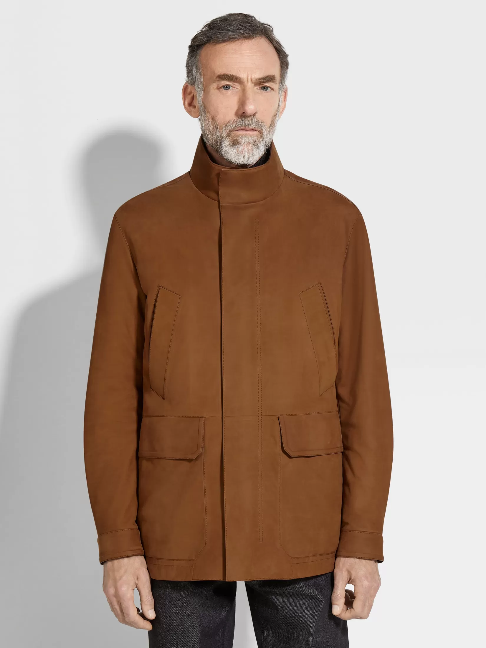 Confeccionado en nobuk de piel de becerro pura, el abrigo de tres cuartos en Foliage oscuro aporta un toque diferente a un clásico de la ropa de hombre. Esta prenda de abrigo está forrada con una mezcla suave de lana y está acolchado para que abrigue más. Está dotado de una capucha plegable, el cuello mao y varios bolsillos.