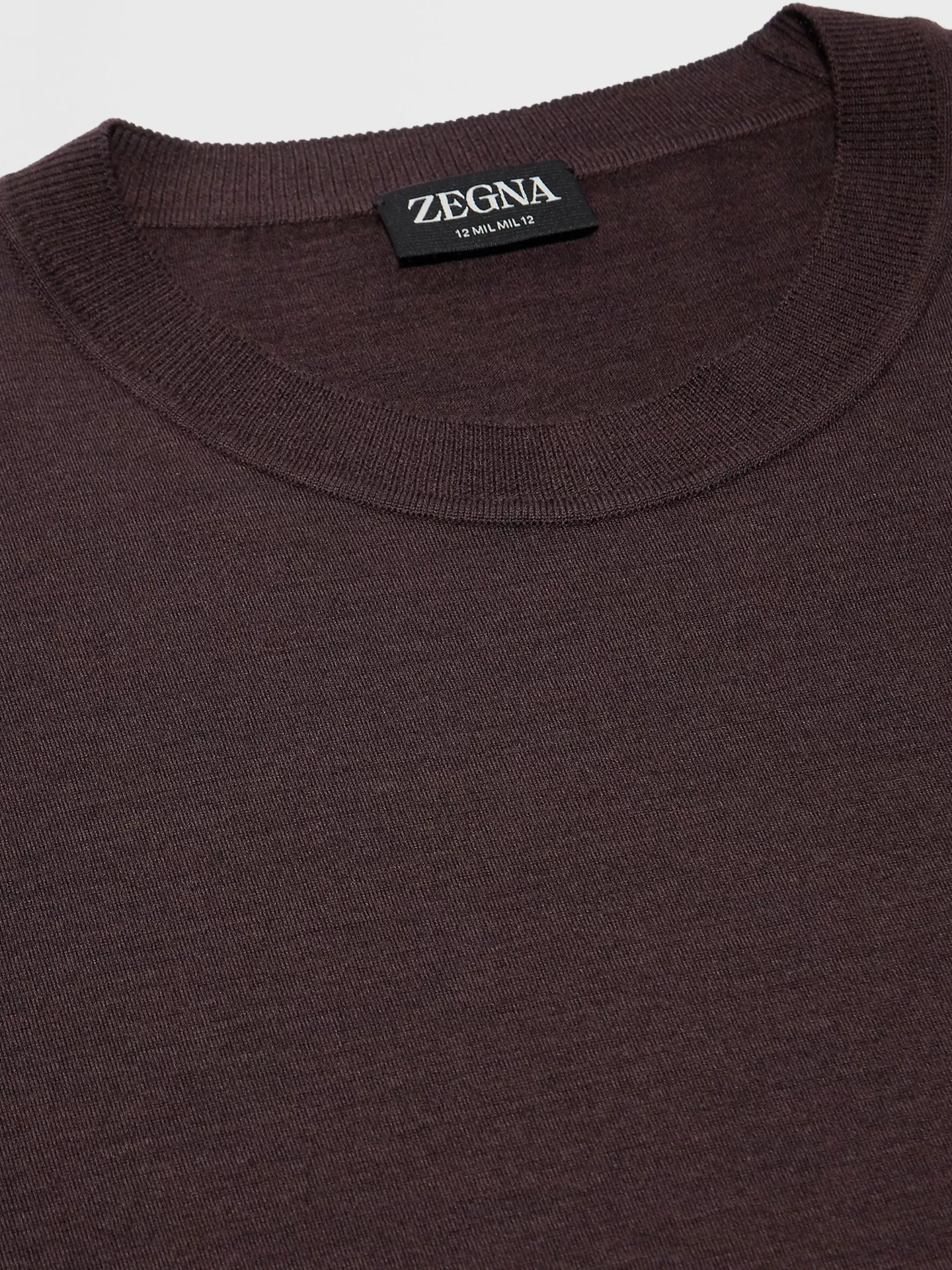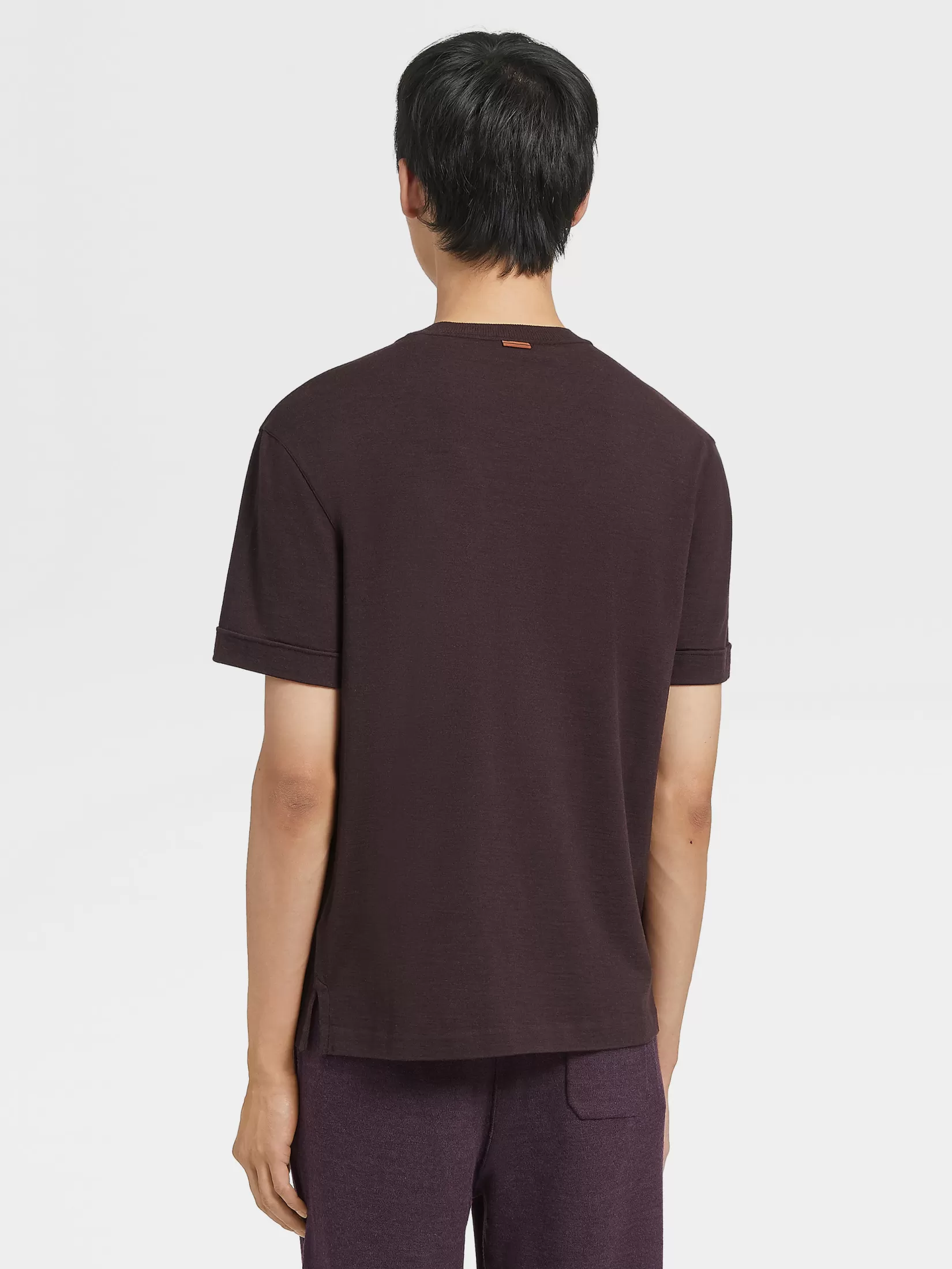La lana 12milmil12, producida en cantidades limitadas cada año, regala a esta camiseta de manga corta color vino mixto un acabado excepcionalmente suave y ligero. La doblez en las bocamangas hace resaltar su lujosa confección. El clásico cuello redondo de punto acaba su diseño básico.