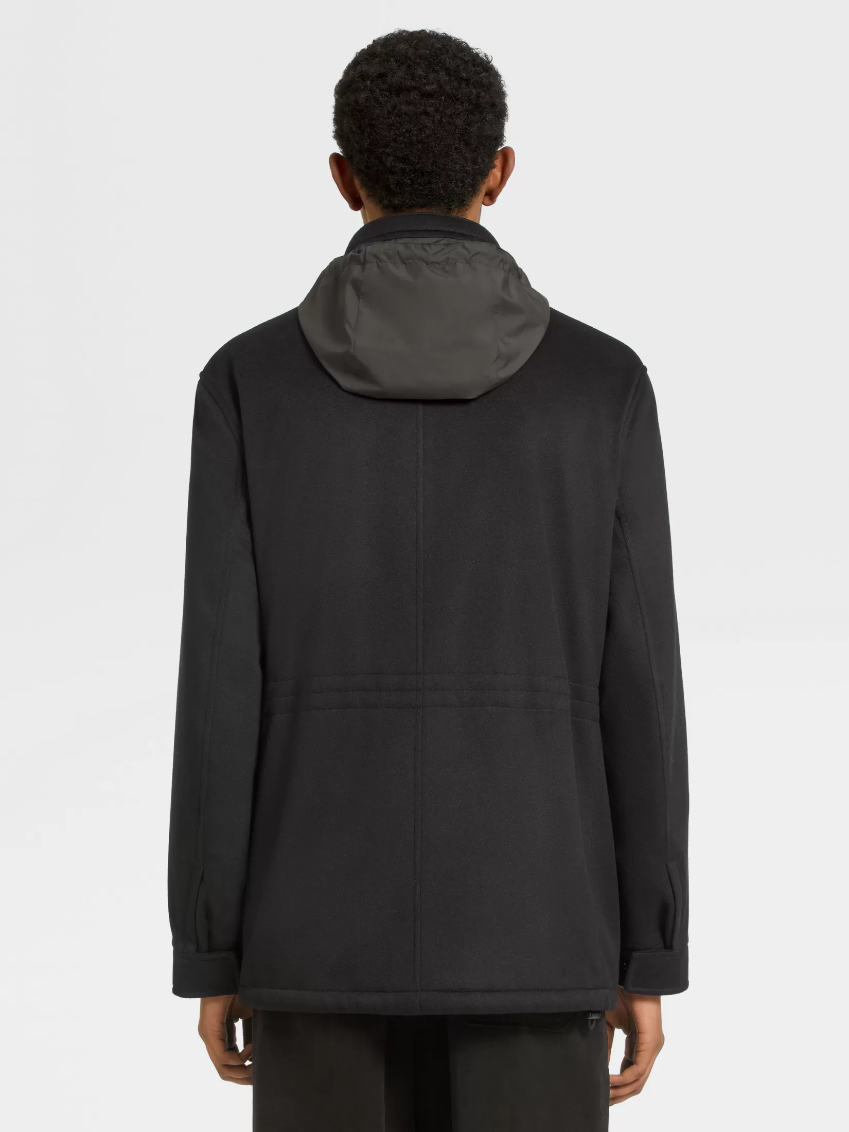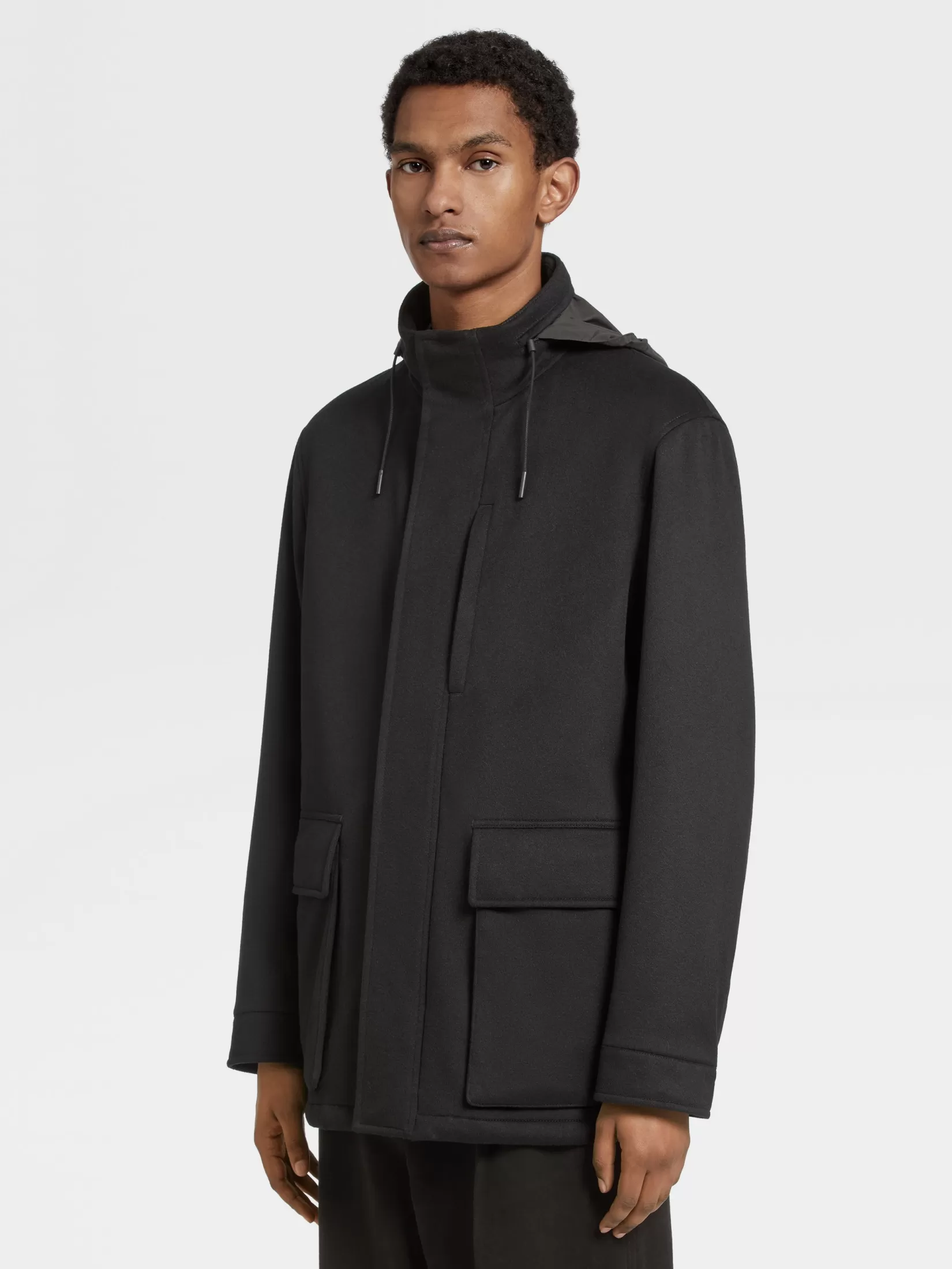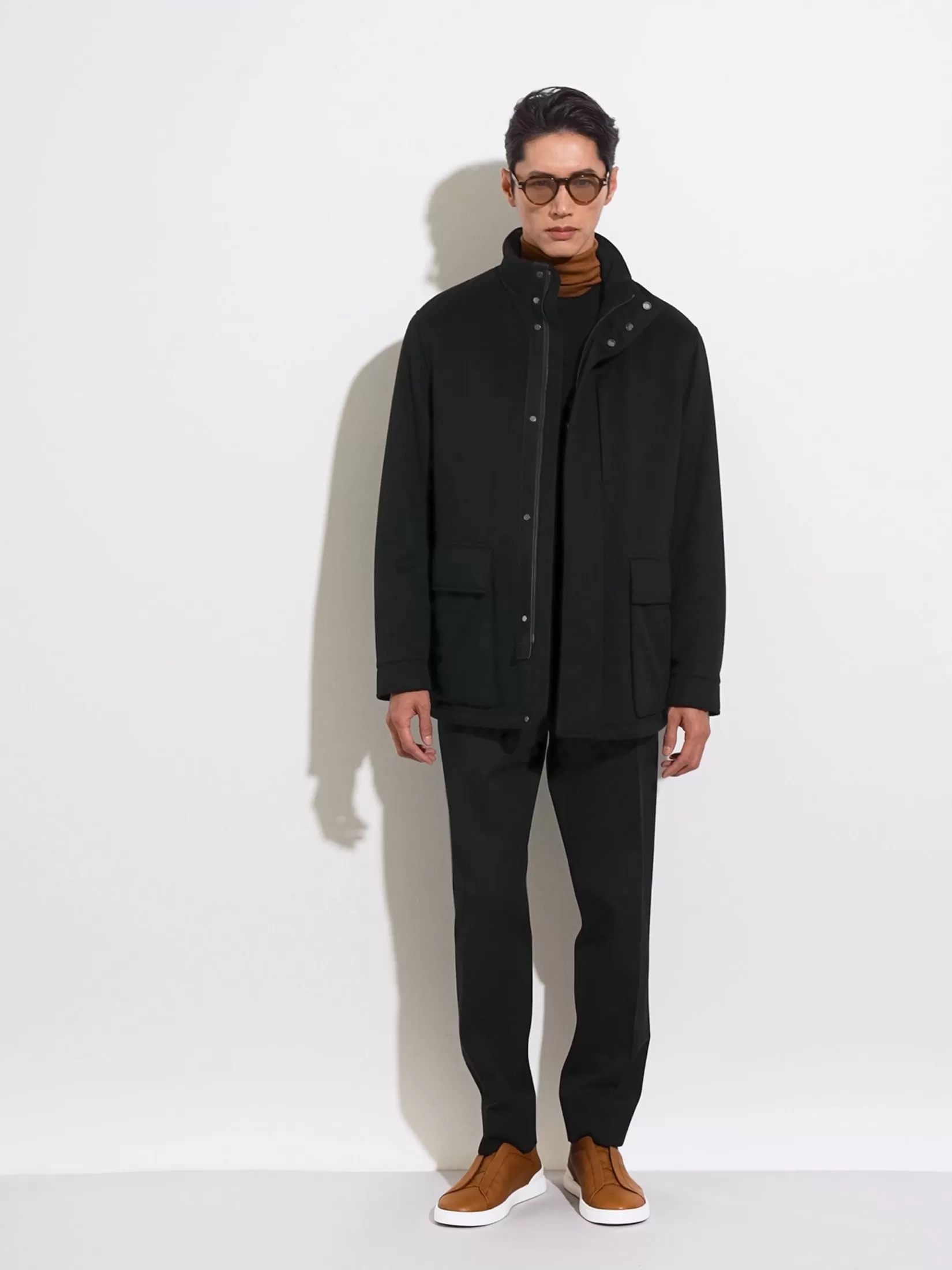 La chaqueta acolchada Vetta, color negro, está confeccionada con uno de los tejidos más finos de Zegna, Oasi Cashmere Elements, que combina la cachemira con unas líneas esbeltas y modernas. Las características prácticas del sobretodo Vetta le protegen del clima y su corte estructurado le regala un estilo elegante. Los detalles de piel acaban este modelo.