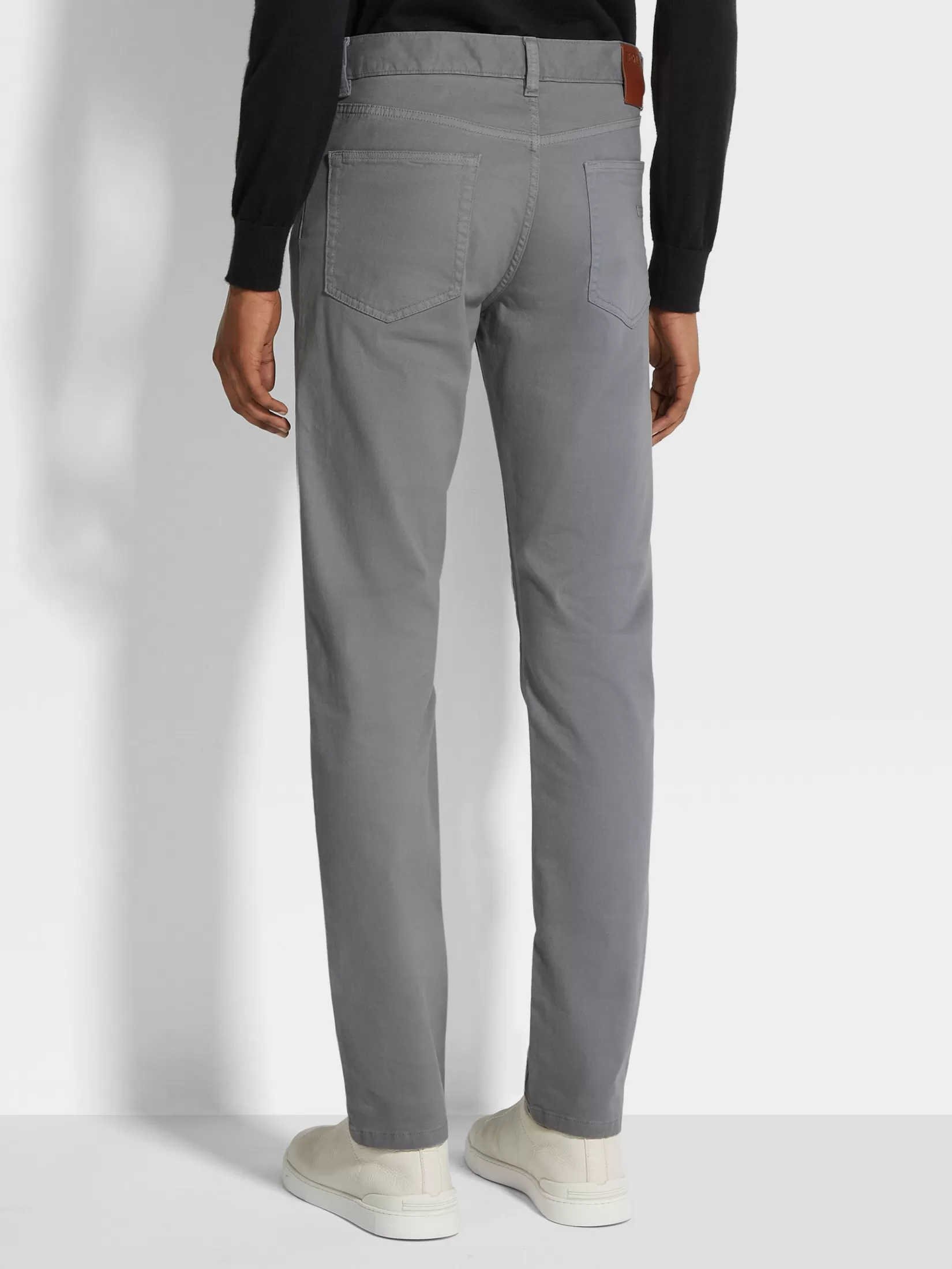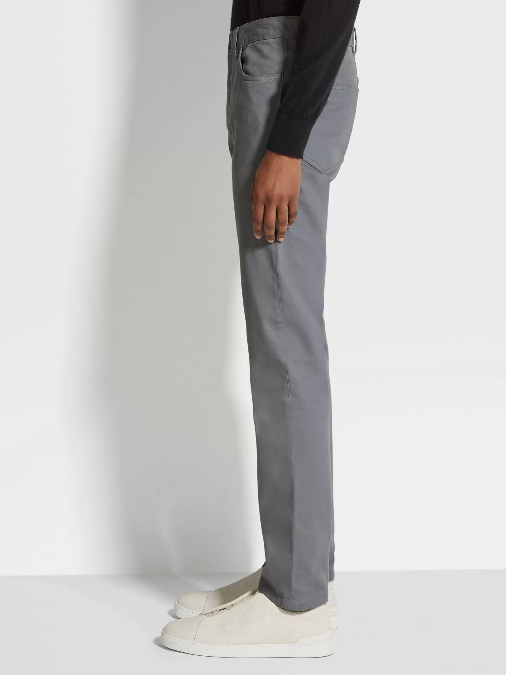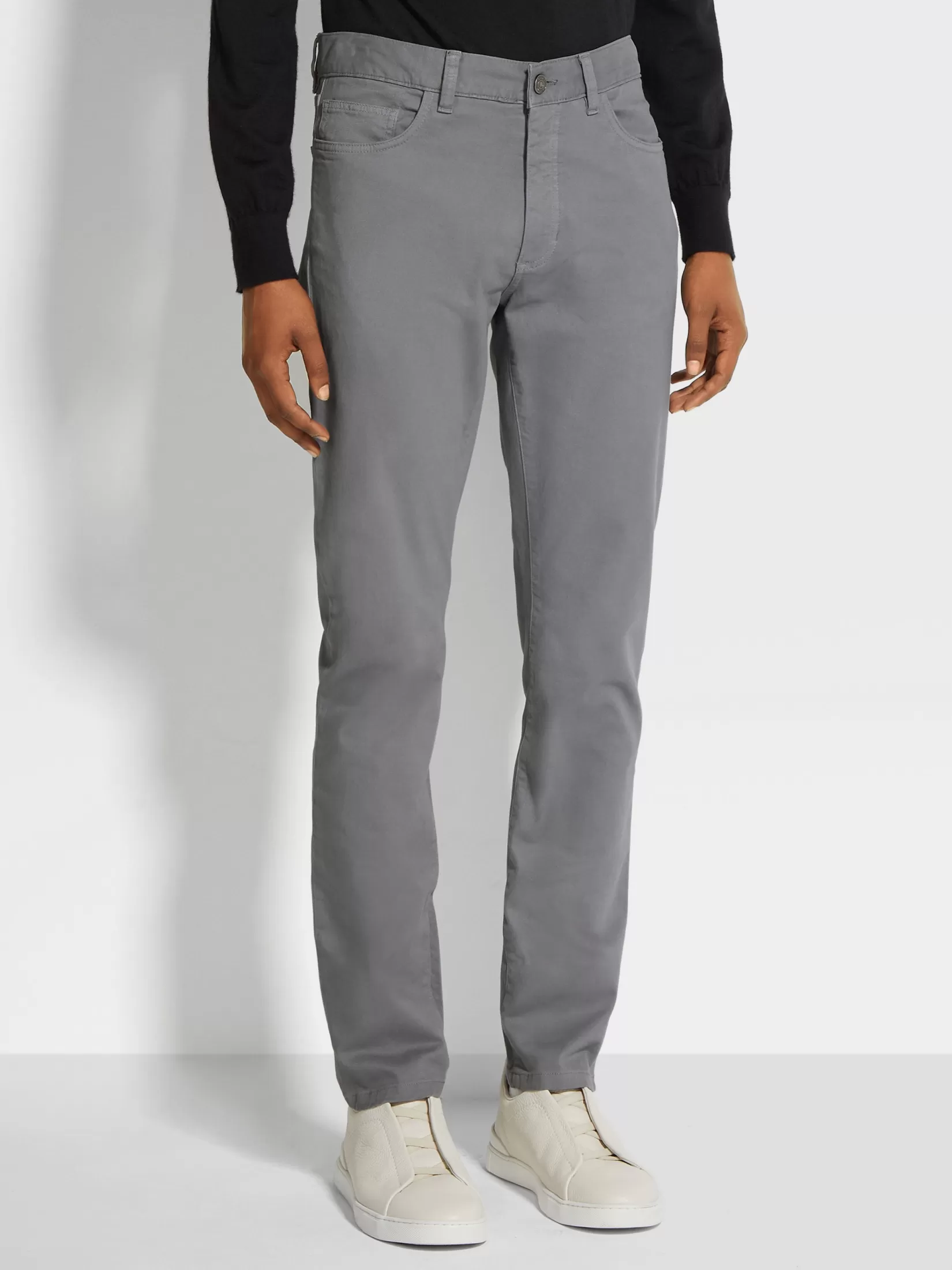 Los vaqueros Roccia gris claro en algodón se adaptan al estilo actual elegante y son cómodos y versátiles. El corte entallado alarga las piernas; un estilo acorde con la visión dinámica de Zegna de la ropa actual para hombre.