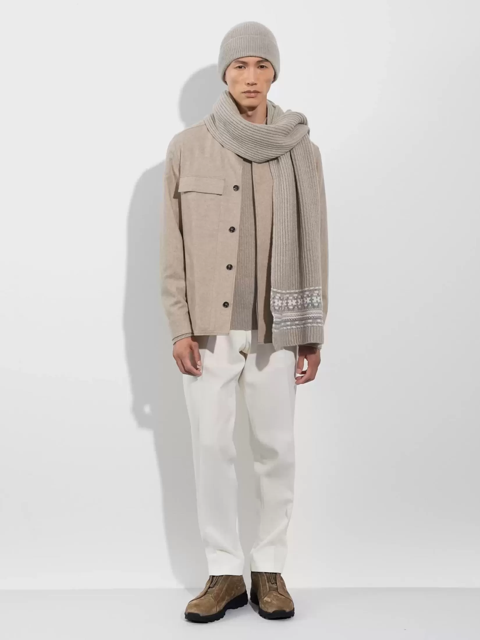 Los altos estándares de calidad de Zegna se extienden hasta a los accesorios más sencillos como esta bufanda gris pardo claro en Oasi Cashmere, confeccionada con uno de los tejidos más suaves y exclusivos de la marca. Esta lujosa bufanda de cachemira se realza por su elaboración en canalé ancho y está adornada con un bonito diseño en el lado corto. Este modelo está firmado con Zegna 232 Road Brand Mark a juego.