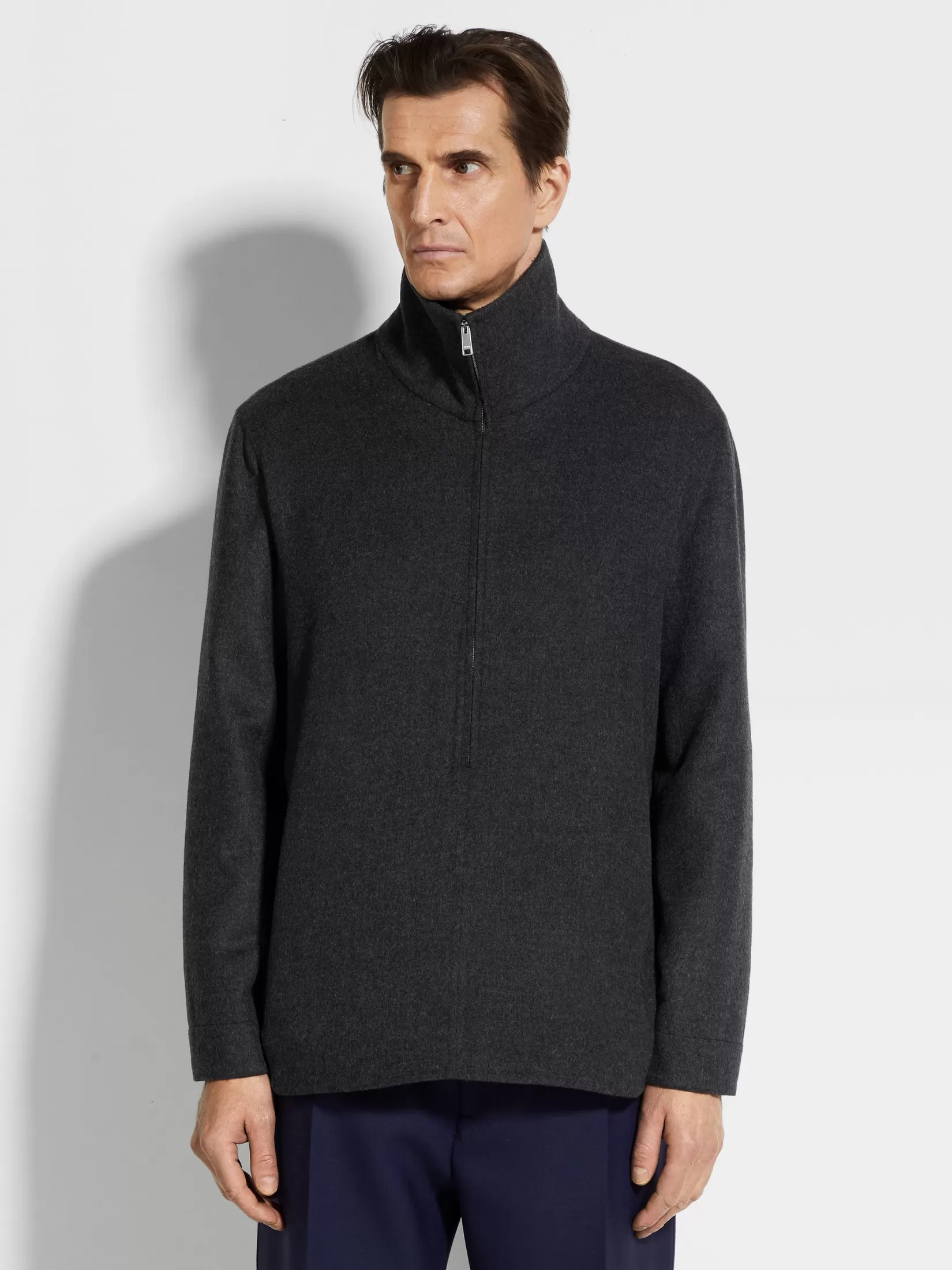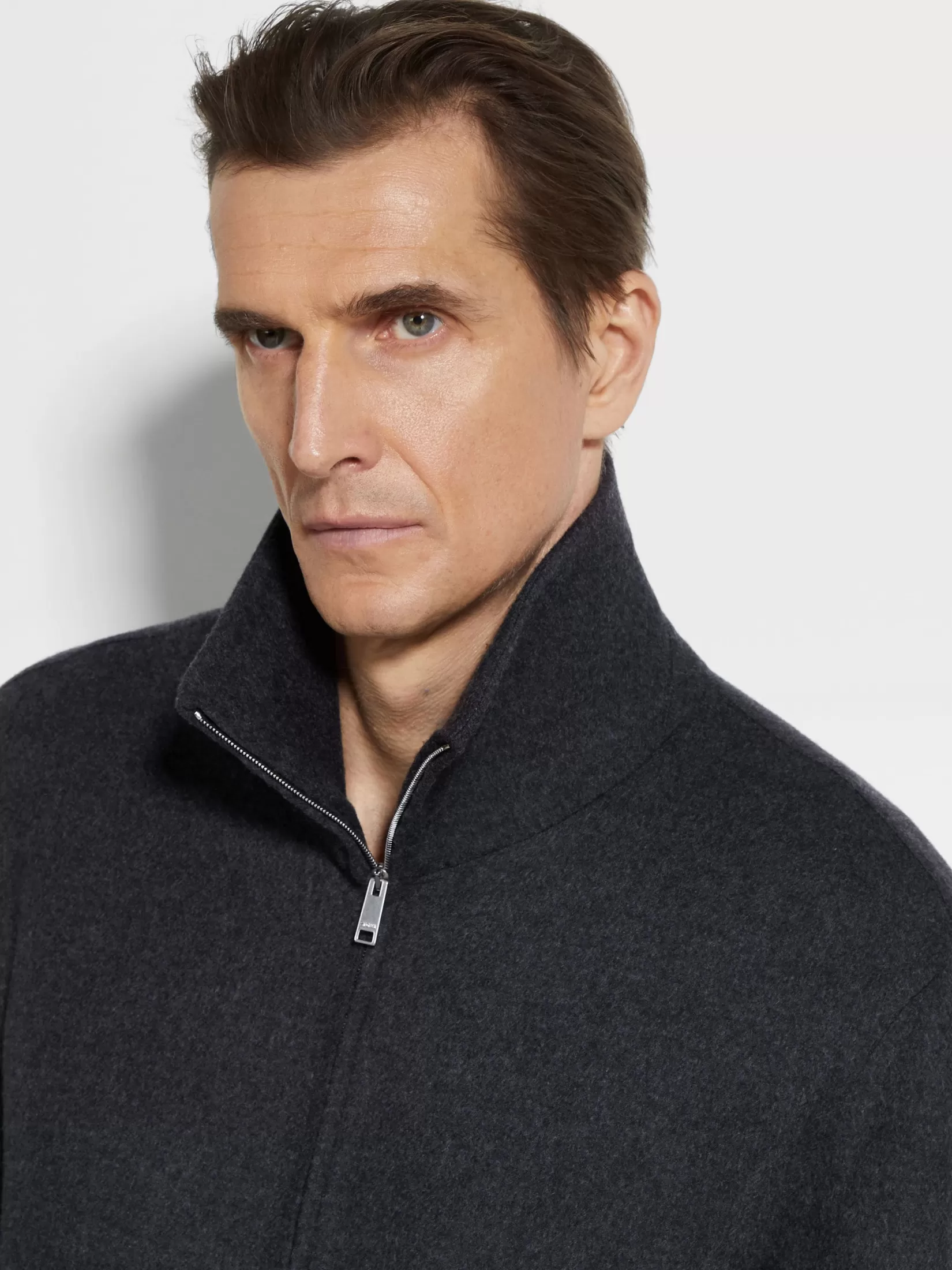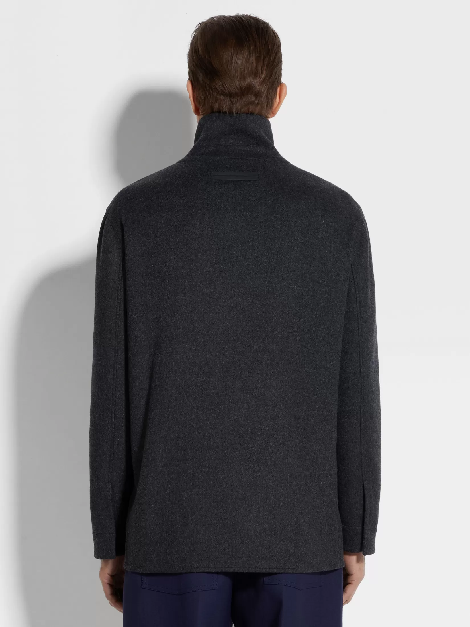 Una confección de lujo convierte esta sobrecamisa gris oscuro mixto en Trofeo™ Cashmere en un básico elegante de la ropa informal. La sobrecamisa está acabada con un cuello mao alto que se complementa con el cierre de cremallera y su diseño esbelto. Esta sobrecamisa se presentó en el desfile de Zegna y luce la insignia Zegna 232 Road Brand Mark en forma de parche de piel por detrás.
