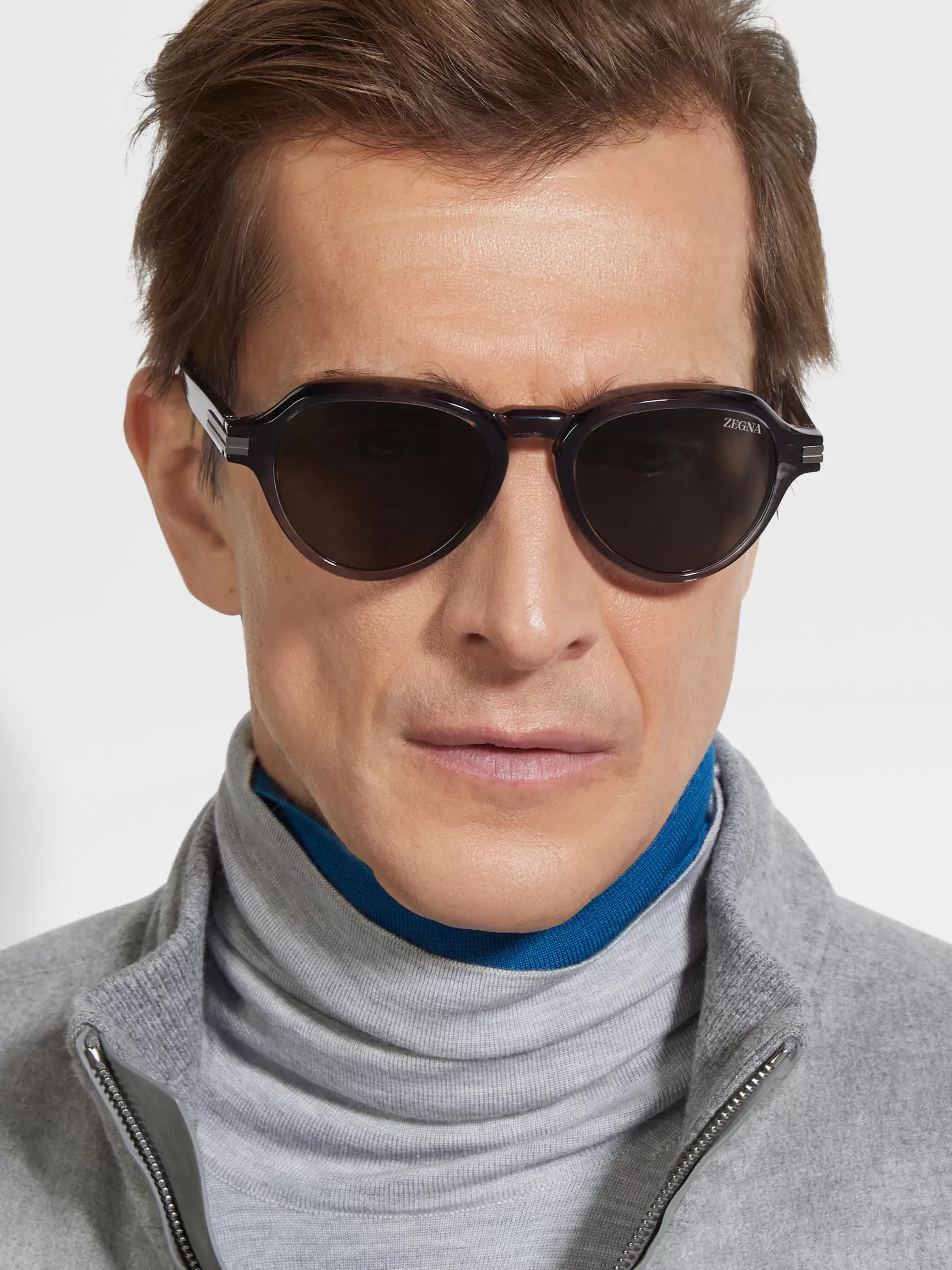 Un diseño atrevido con un acabado brillante: así se presentan las gafas de sol en acetato, gris habana transparente, caracterizadas por una montura con puente simple y volúmenes redondos prominentes. Las almohadillas adherentes en los terminales mejoran su ajuste y el asombroso logo Zegna 232 Road Brand Mark adorna las esquinas. Las formas geométricas y su distinguido biselado brindan un estilo espectacular que transforma estas gafas de sol en un accesorio estiloso y de tendencia.