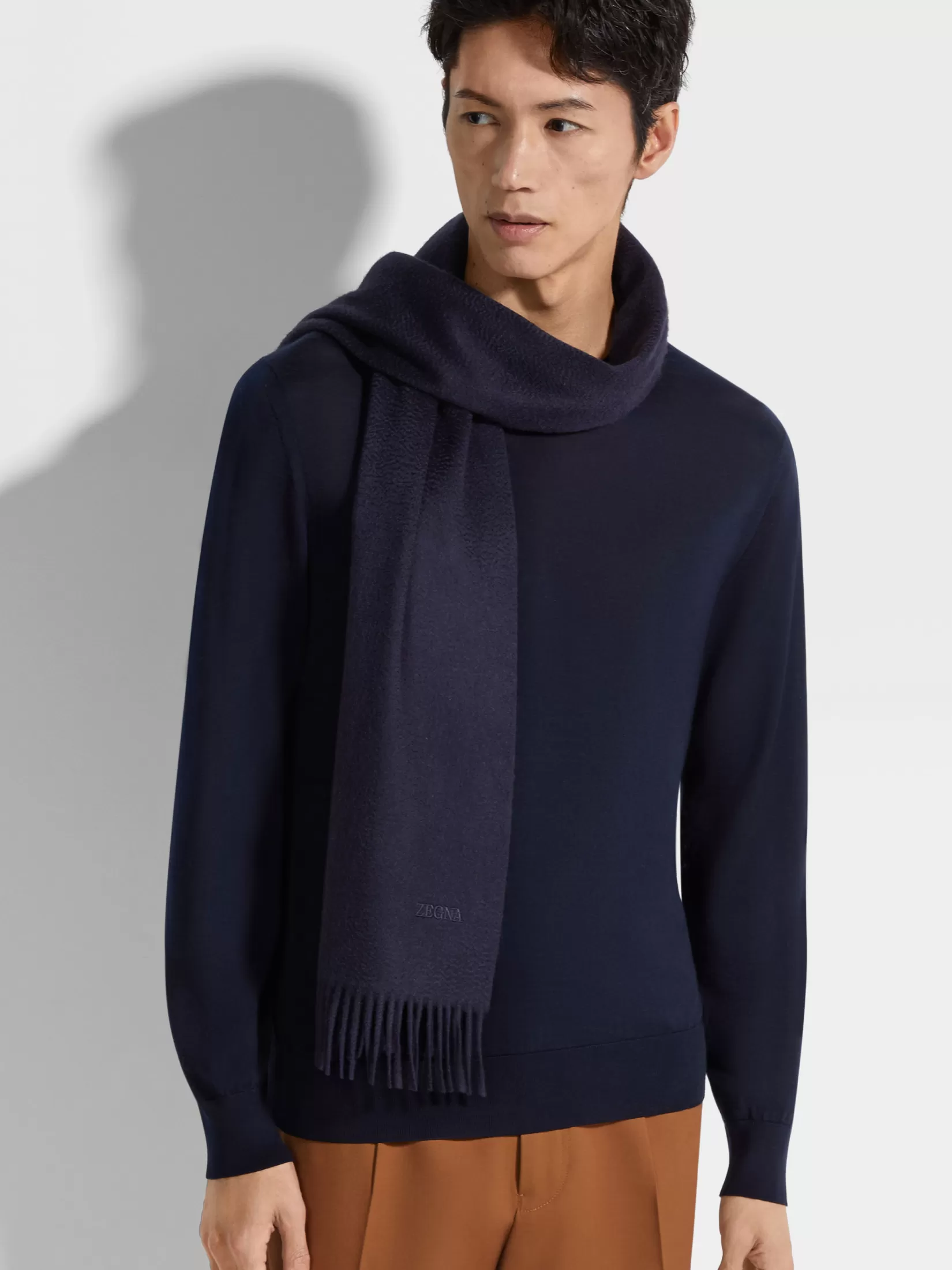 Disfruta de la calidad de Zegna en cualquier temporada: esta bufanda azul marino en Oasi Cashmere le protege del frío gracias a uno de los tejidos más suaves y exclusivos de la marca. Esta suave bufanda de cachemira se presenta en un color sólido y con un borde ribeteado con flecos. Este modelo está firmado con Zegna 232 Road Brand Mark a juego en piel.