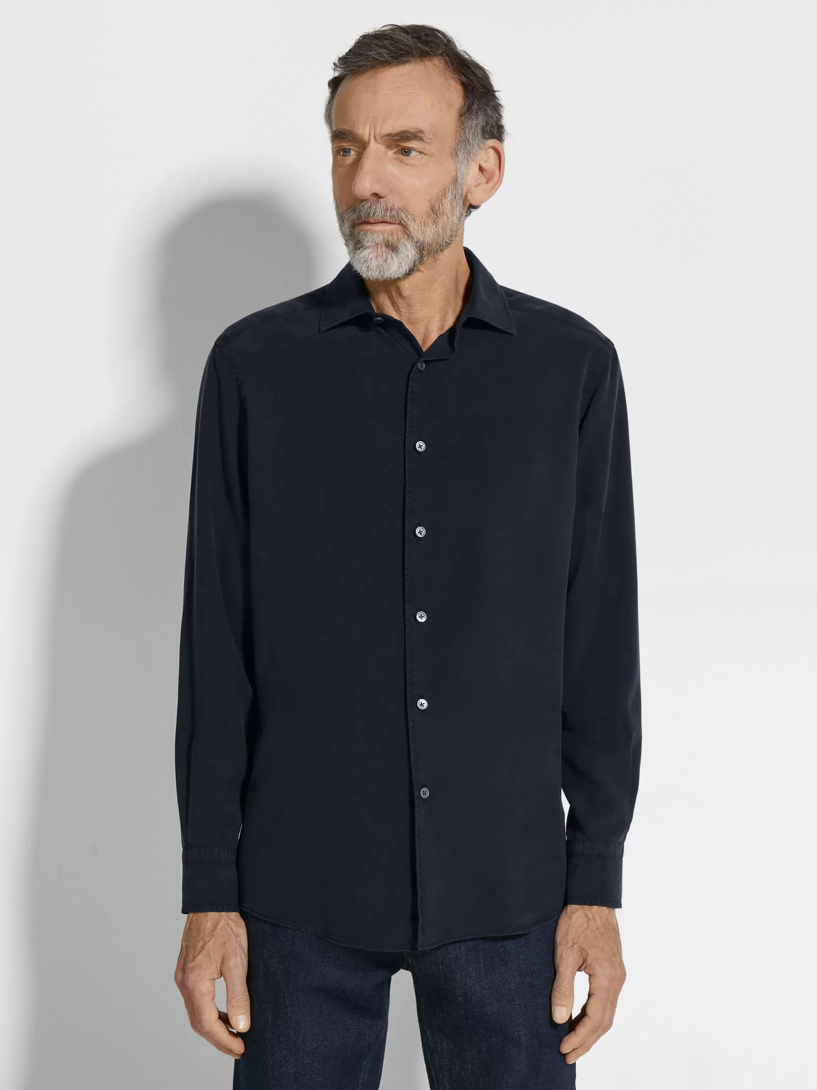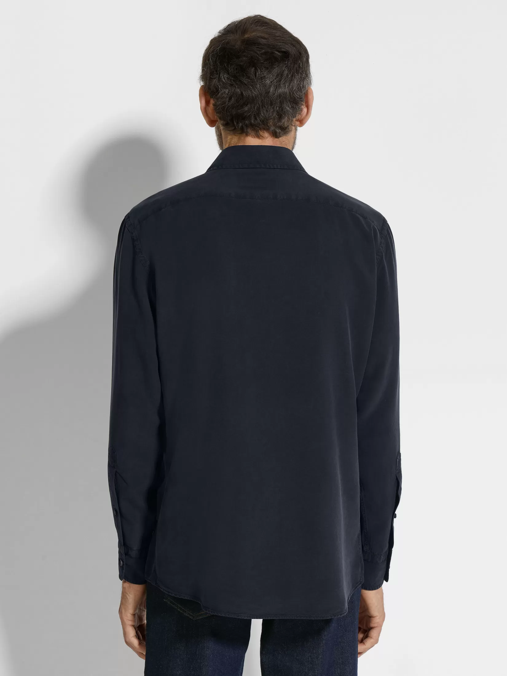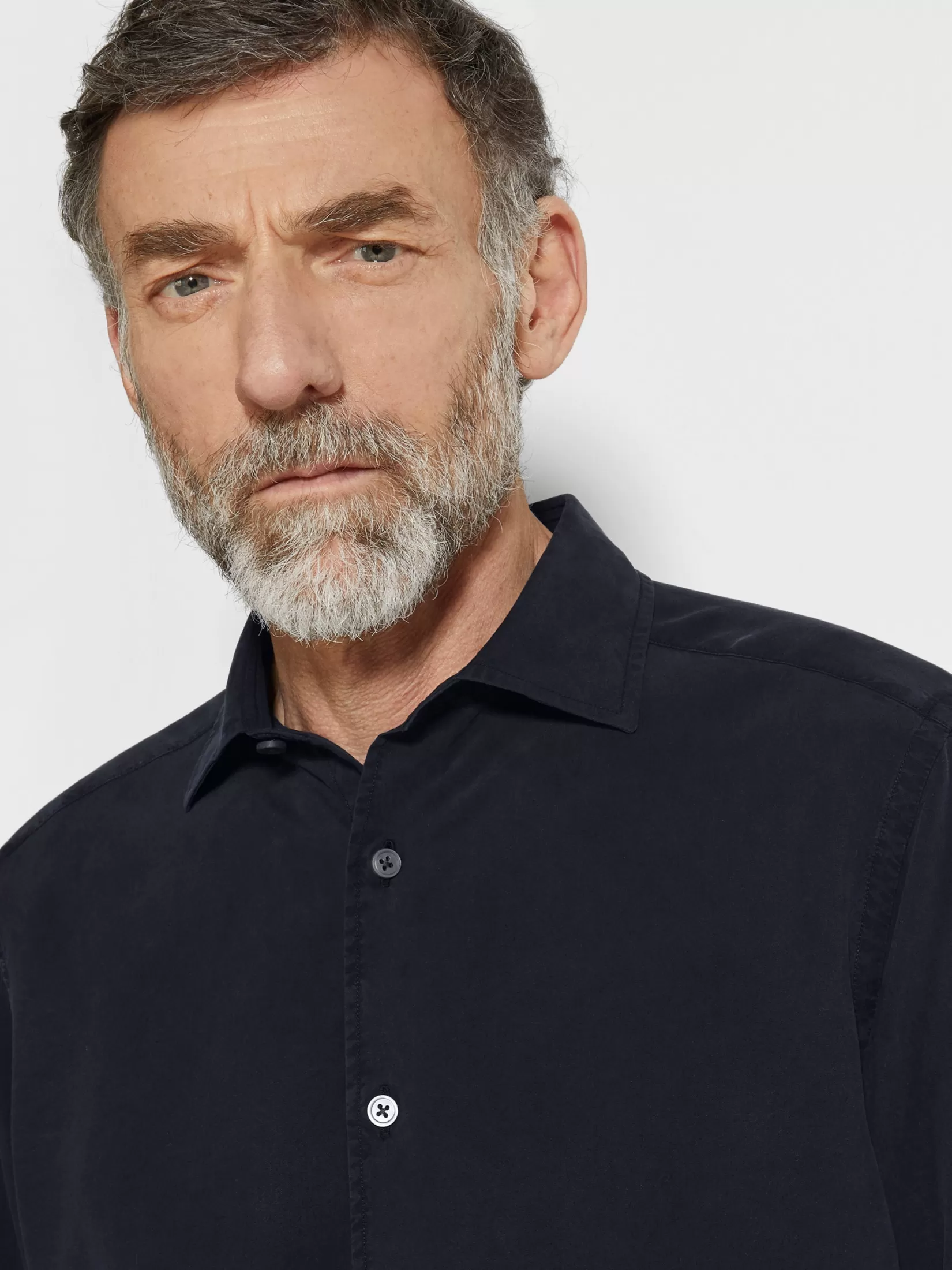 Esta camisa de seda azul marino está confeccionada en pura seda Mulberry y está teñida en prenda para un acabado más intenso. La camisa de seda y de manga larga está acabada con el cuello inglés.