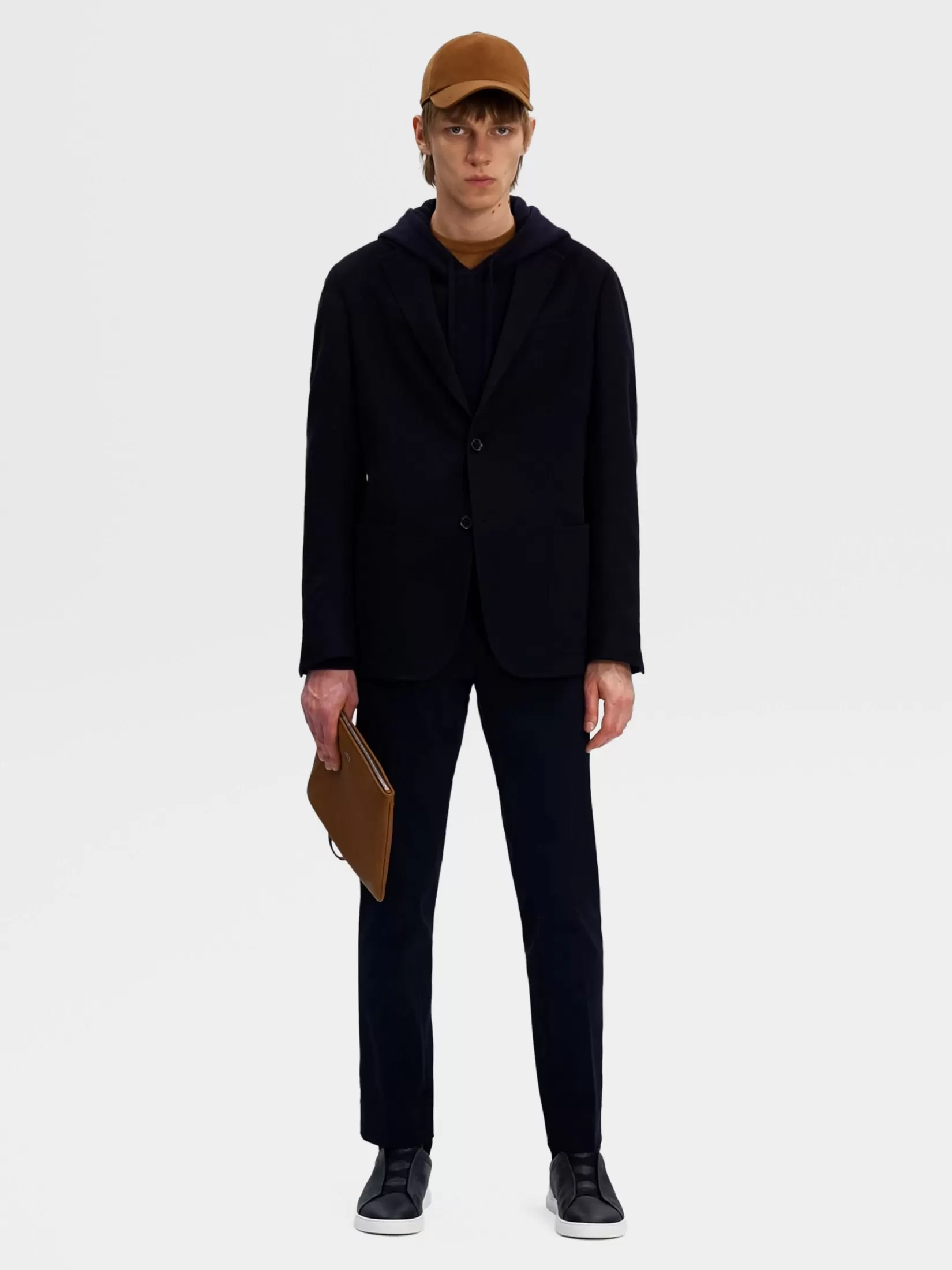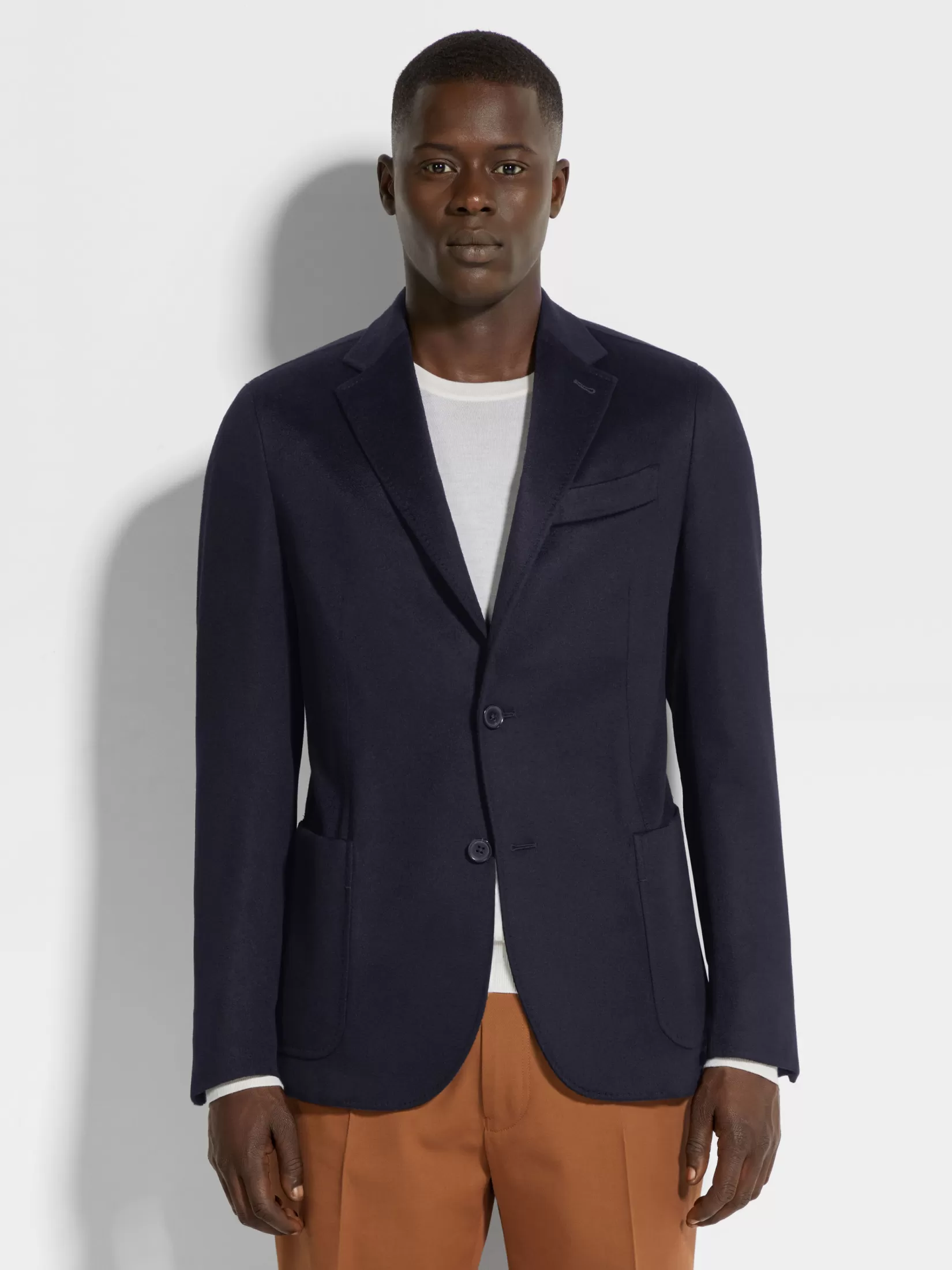 La chaqueta en Oasi Cashmere azul marino es la última creación de la amplia gama de ropa elegante para hombre. El corte entallado de esta chaqueta le brinda unas líneas esbeltas que se adaptan a un conjunto informal pero elegante. Los detalles de piel y los bolsillos de parche completan este modelo.