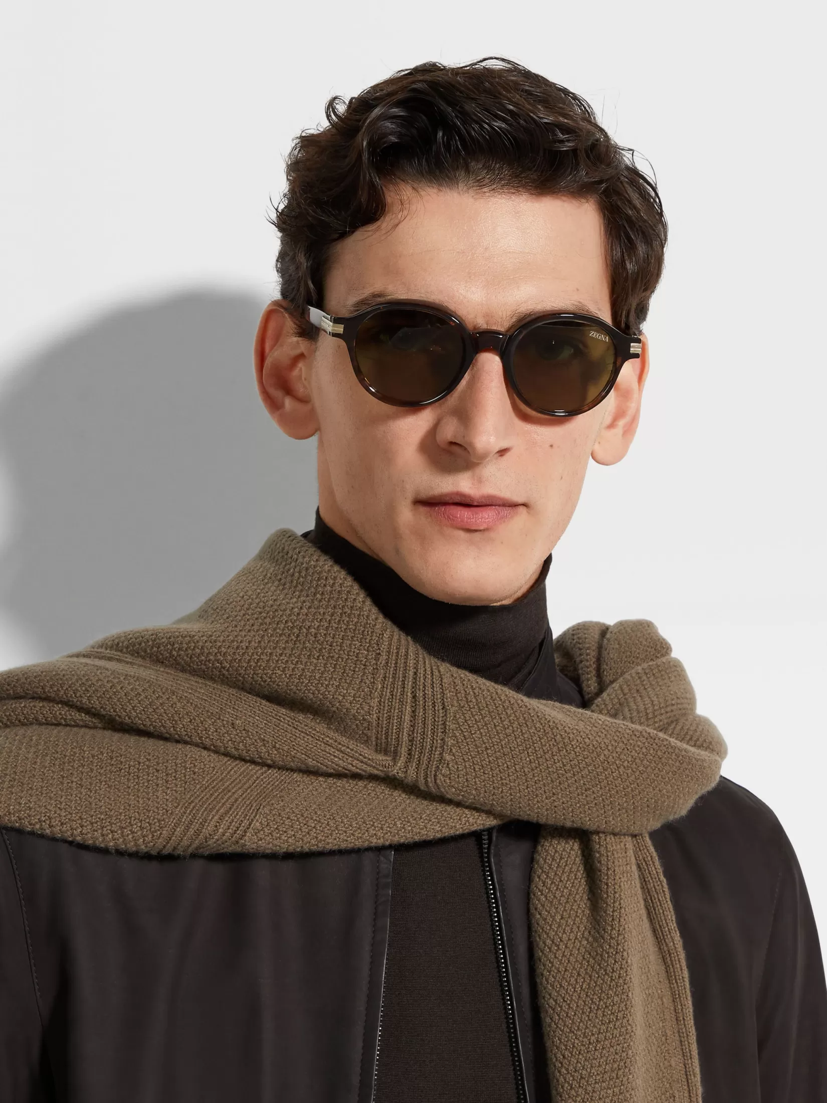 Las gafas de sol en acetato marrón oscuro habana transparente exhiben una montura brillante con puente simple. Los volúmenes redondeados en el frente añaden profundidad y las almohadillas adherentes en los terminales le proporcionan un ajuste firme. El logo Zegna 232 Road Brand Mark en las esquinas regala un toque distinguido, mientras que la combinación de materiales y formas brinda a esta montura un estilo moderno y espectacular.
