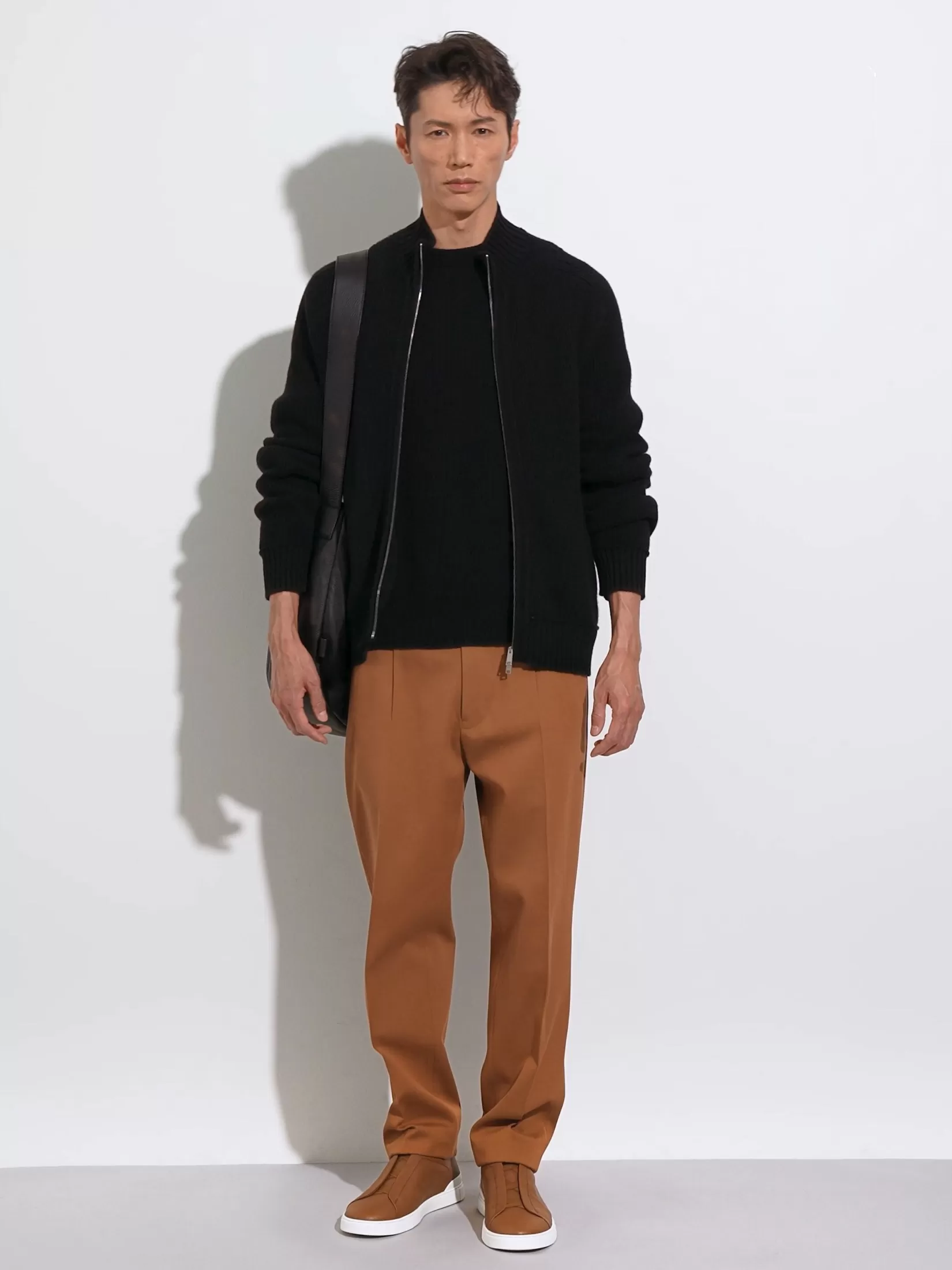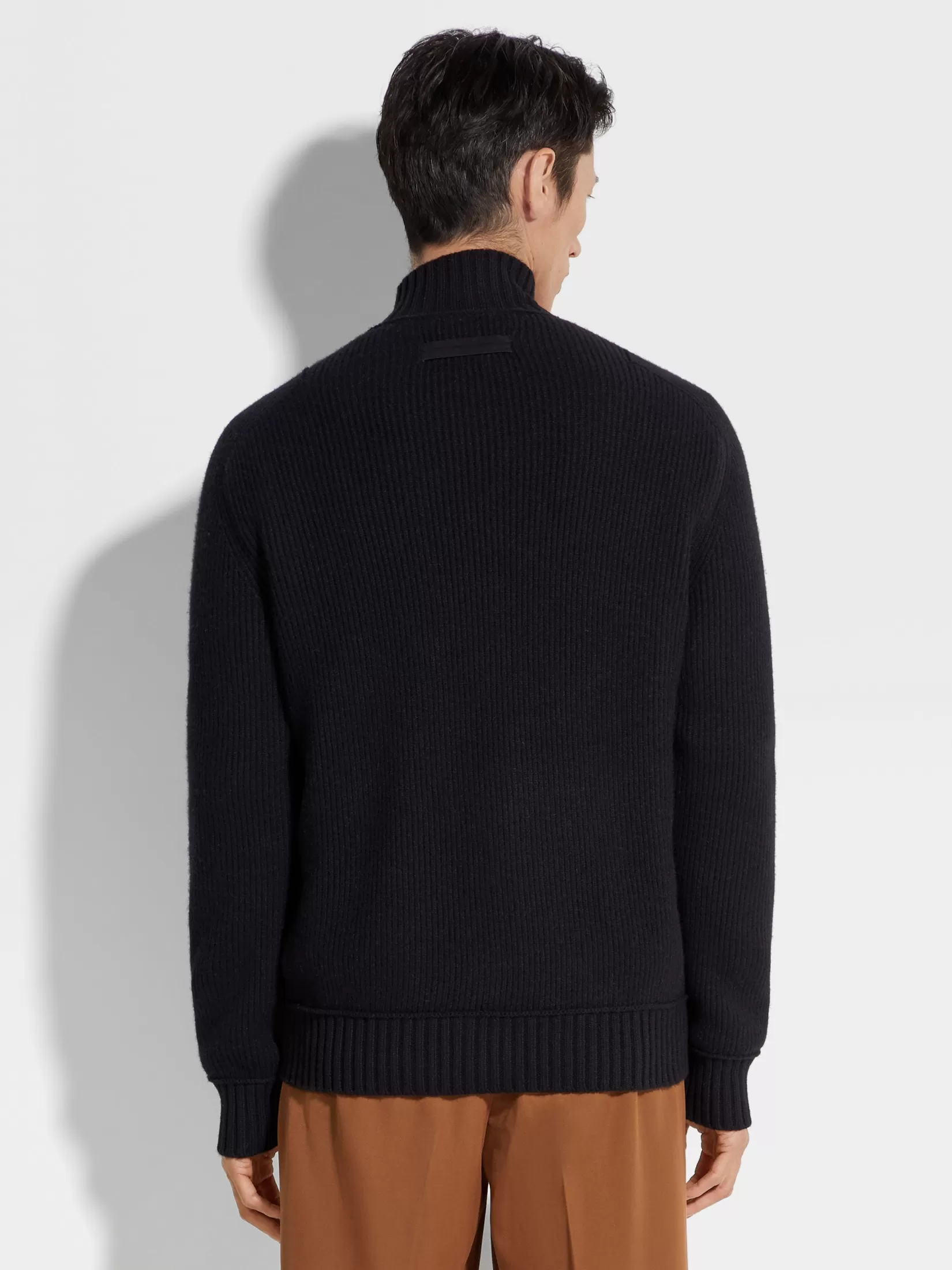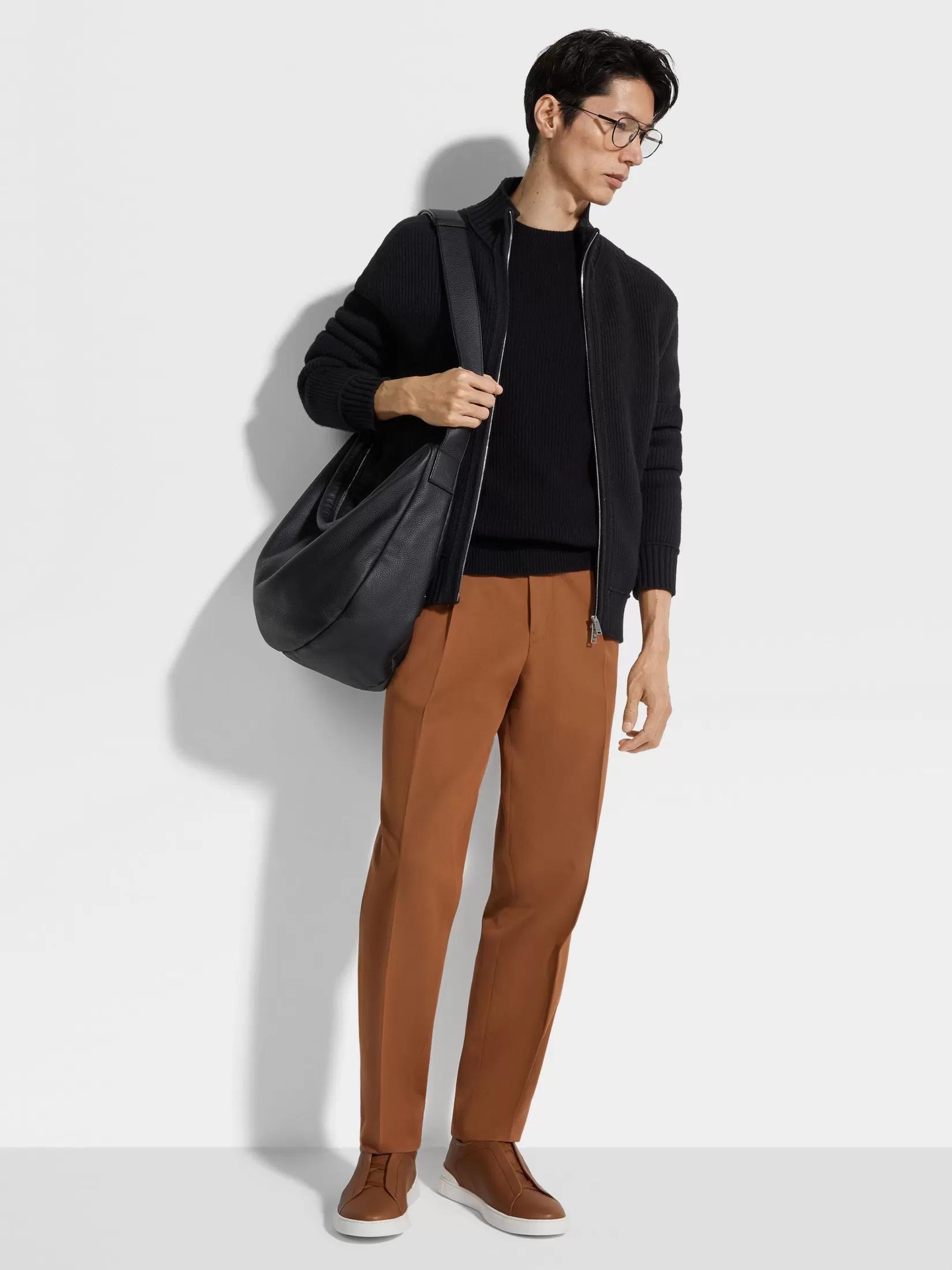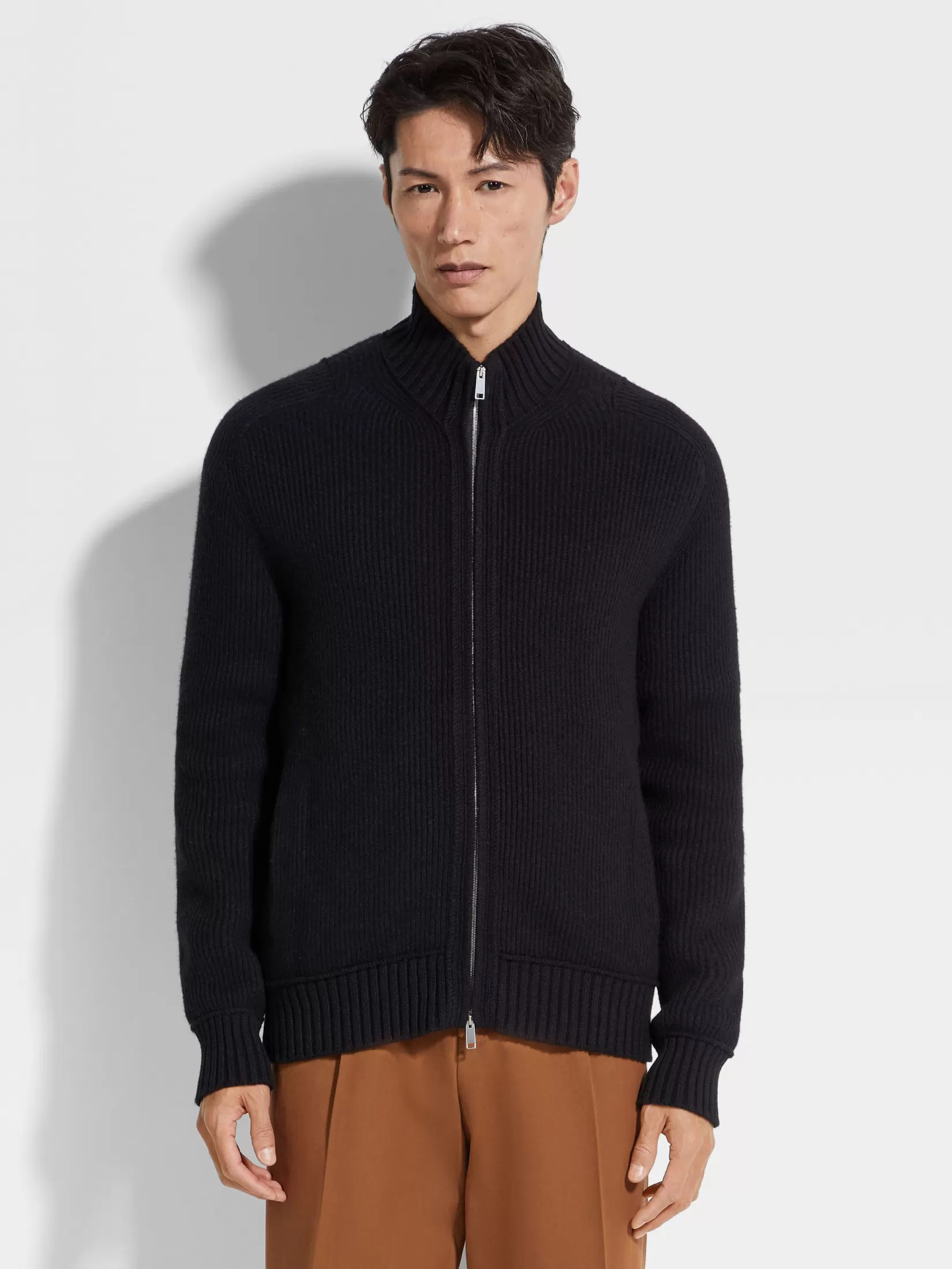 Una elegante elaboración en punto canalé ancho destaca la confección superfina y natural de este cárdigan negro mixto con cremallera en Oasi Cashmere. Este cárdigan con cierre de cremallera completo está acabado con un cuello mao acanalado y el dobladillo a juego. Los detalles en piel firman este diseño.