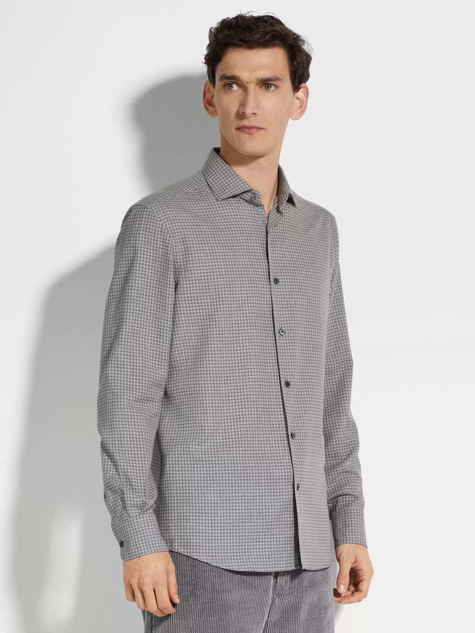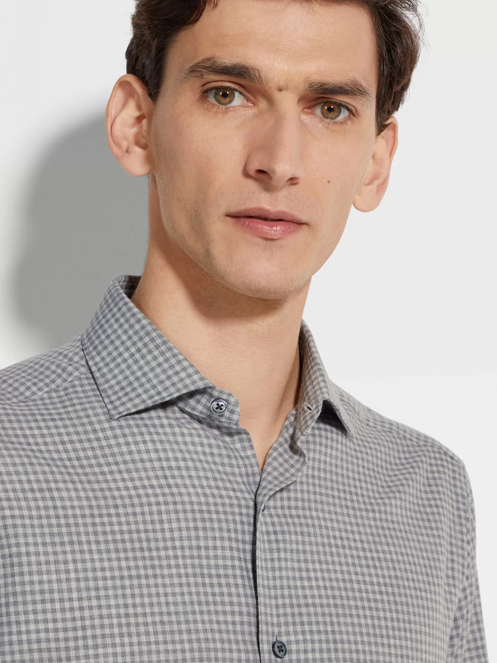 Esta camisa en Cashco, gris oscuro y azul marino con cuadros pequeños, está confeccionada con uno de los hilos más finos de Zegna. Destaca por el clásico patrón a cuadros pequeños en una elegante paleta de colores. Esta camisa de manga larga presenta cuello inglés y puños clásicos.