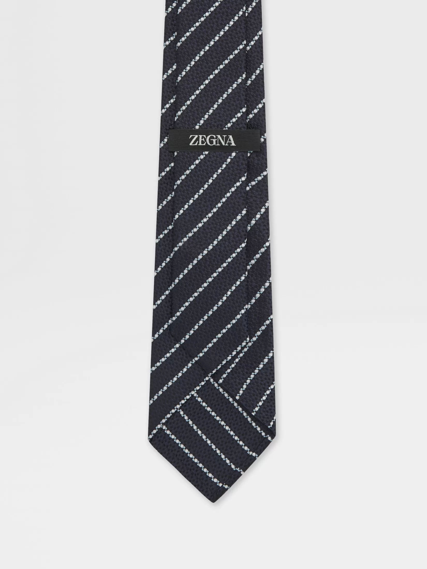 La corbata de seda azul oscuro está confeccionada en seda Mulberry pura. El brillo natural de este tejido hace resalta el clásico patrón.