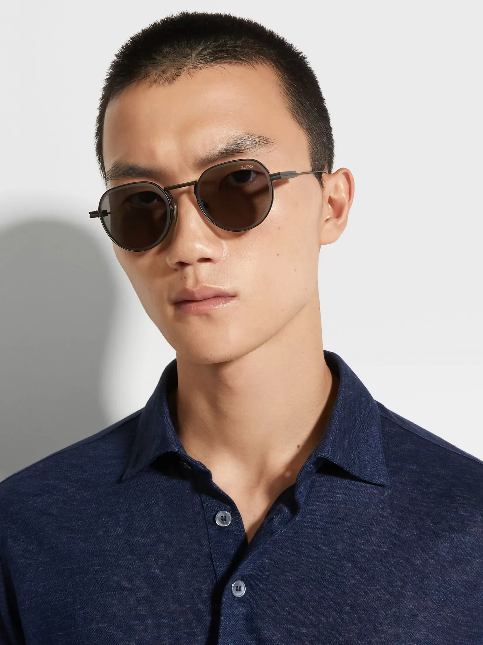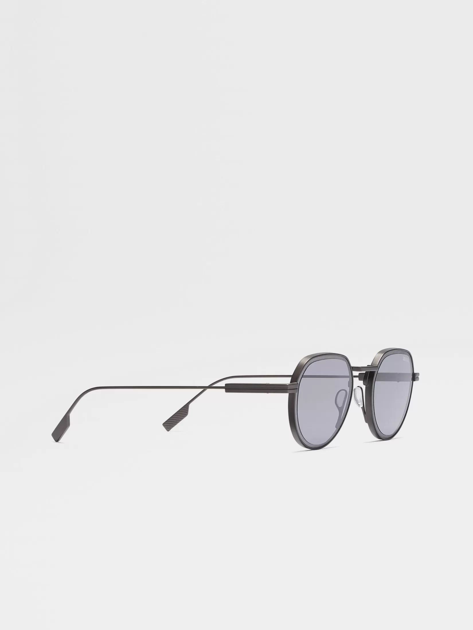 Las gafas de sol gris plomizo combinan unas varillas ultrafinas con un frente más pesado y redondo. Las lentes gris claro destacan por encima del puente recto y las almohadillas nasales. En los talones, la insignia Zegna 232 Road Brand Mark resalta sobre las varillas que están dotadas de unas aplicaciones adherentes para un agarre seguro.