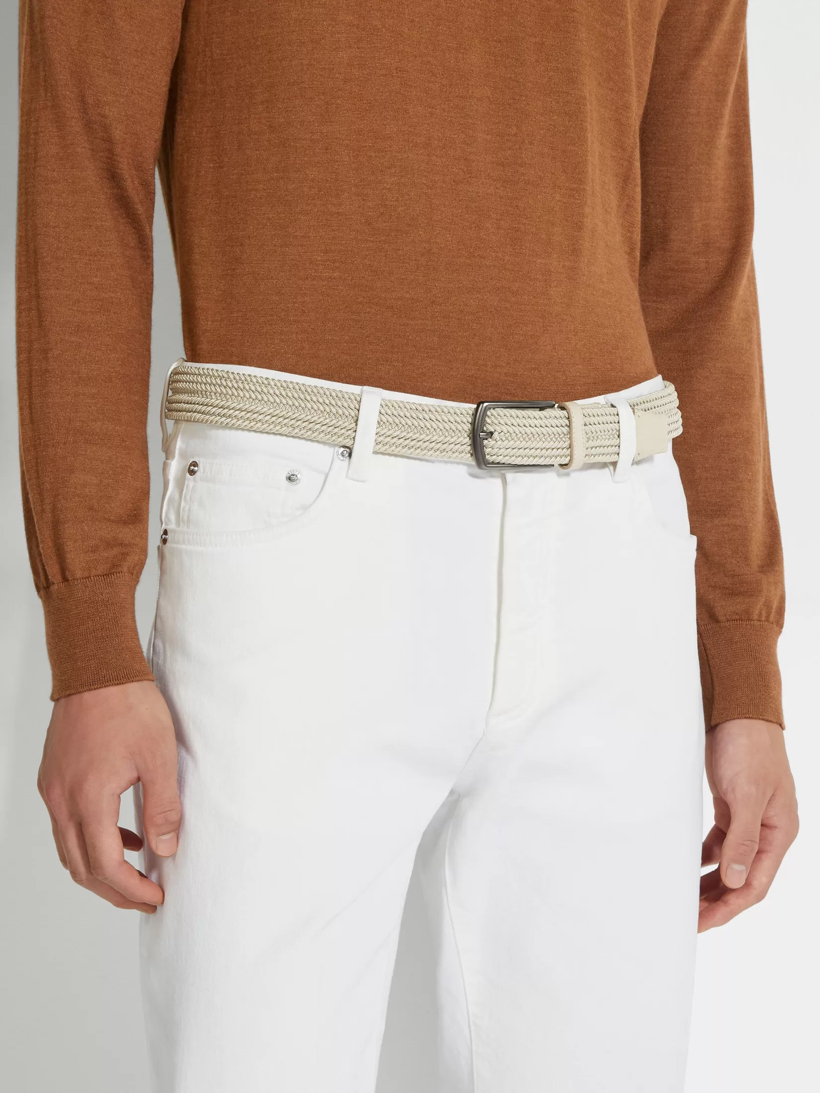 Este cinturón elástico, en rayón trenzado beige claro, reinterpreta un diseño clásico con materiales y detalles modernos. La emblemática hebilla Triple Stitch™, acabada con esmalte ultranegro, añade el punto final a sus conjuntos refinados e informales.