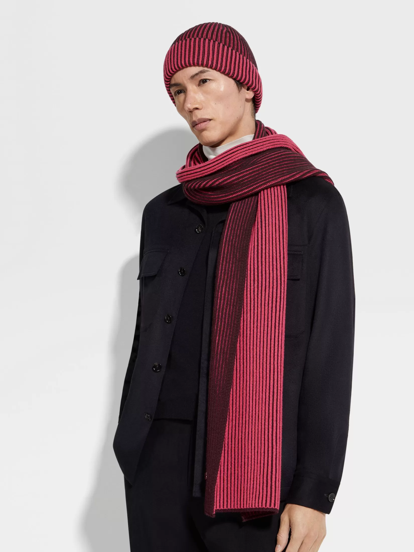 Los altos estándares de calidad de Zegna se extienden hasta a los accesorios más sencillos como esta bufanda fucsia y violeta oscuro en Oasi Cashmere, confeccionada con uno de los tejidos más suaves y exclusivos de la marca. Esta lujosa bufanda de cachemira se elegantiza con su elaboración en punto de cable de dos colores. El parche en piel nobuk con el logo Zegna 232 Road Brand Mark acaba su diseño.