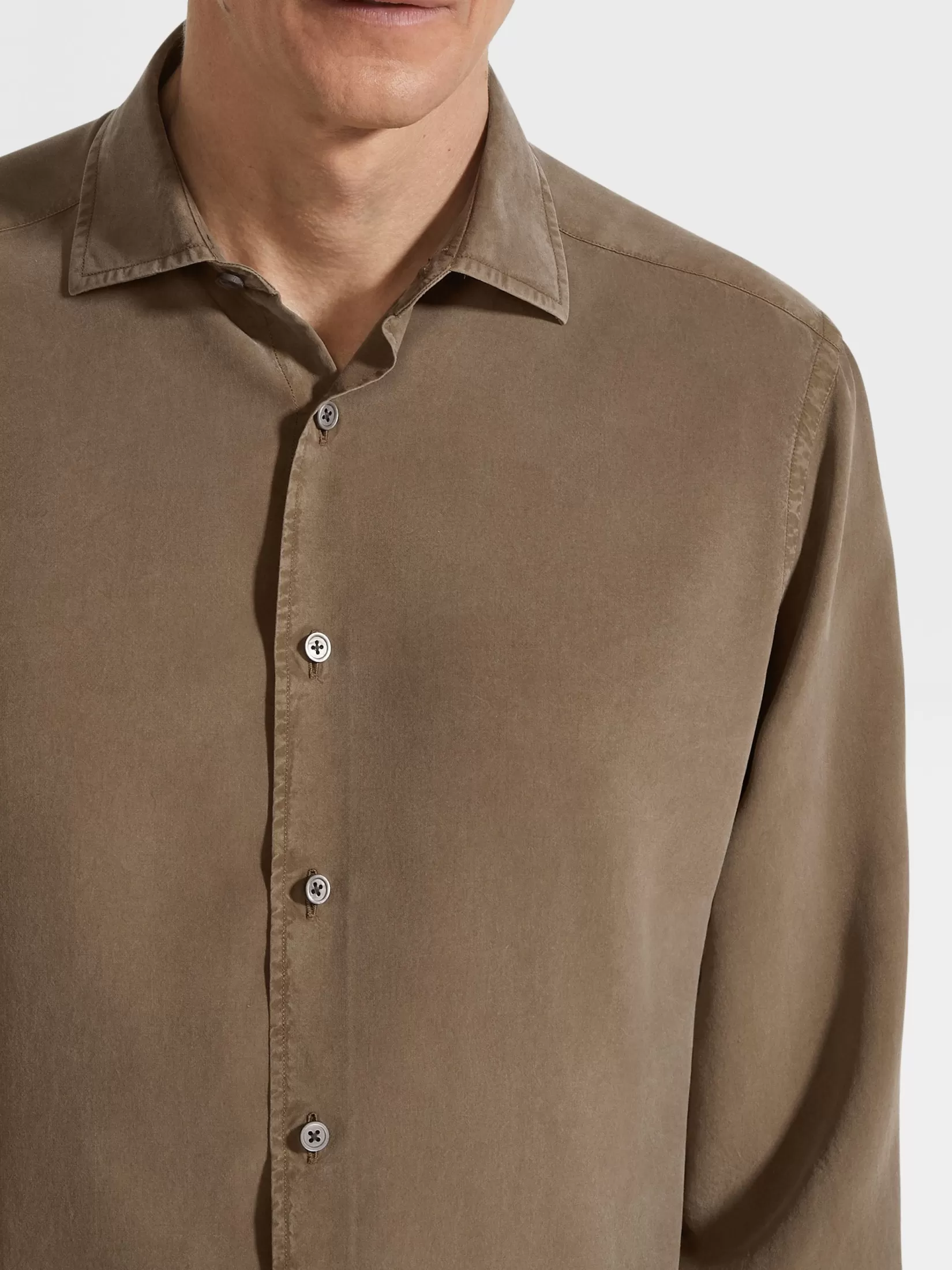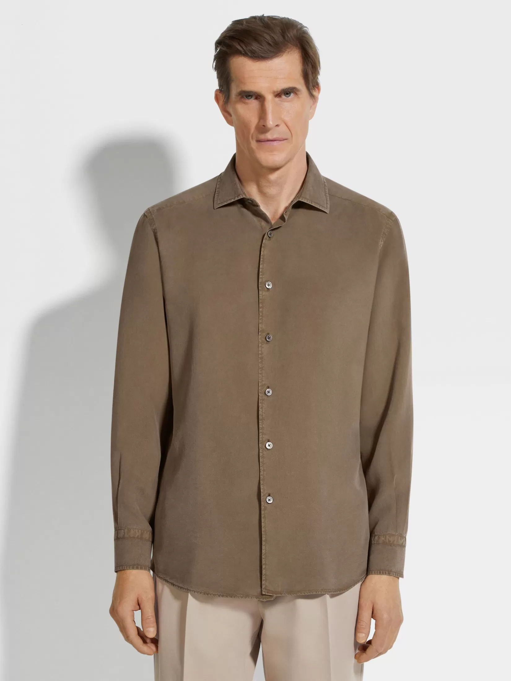 Esta camisa de seda caqui está confeccionada en pura seda Mulberry y está teñida en prenda para un acabado más intenso. La camisa de seda y de manga larga está acabada con el cuello inglés.