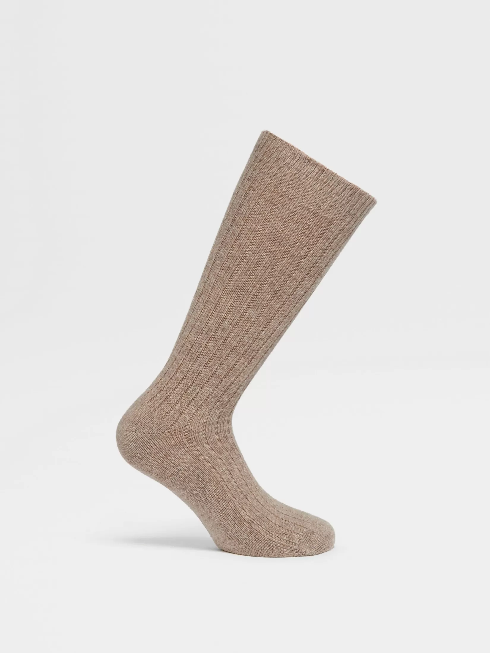 Estos calcetines beige oscuro en mezcla de cachemira están diseñados para ser cómodos, pues son supersuaves y ligeramente elásticos. Estos elegantes calcetines de media pierna están decorados con un patrón acanalado.
