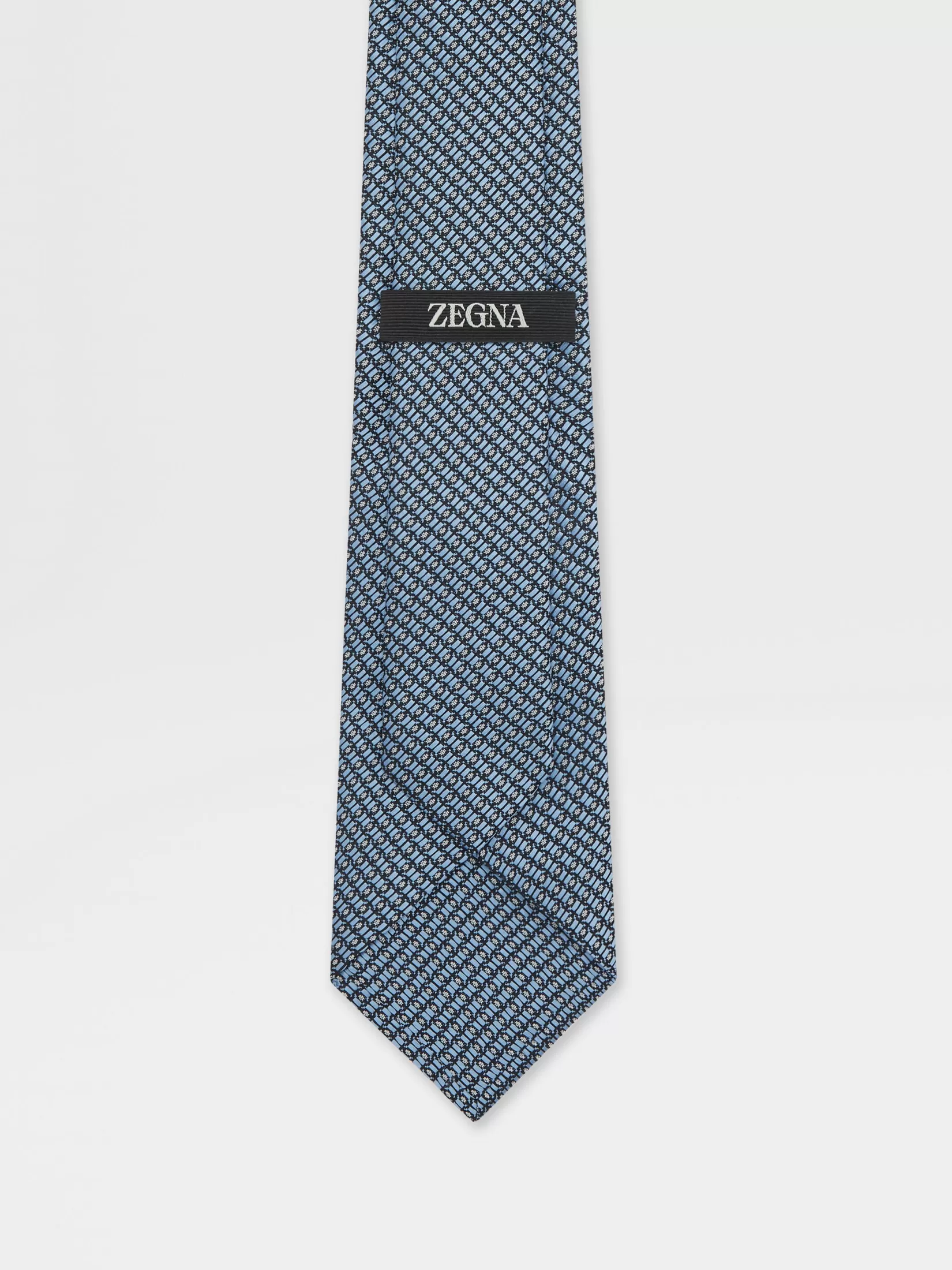 La corbata de seda azul claro está confeccionada en seda Mulberry pura. El brillo natural de este tejido hace resalta el patrón intricado.