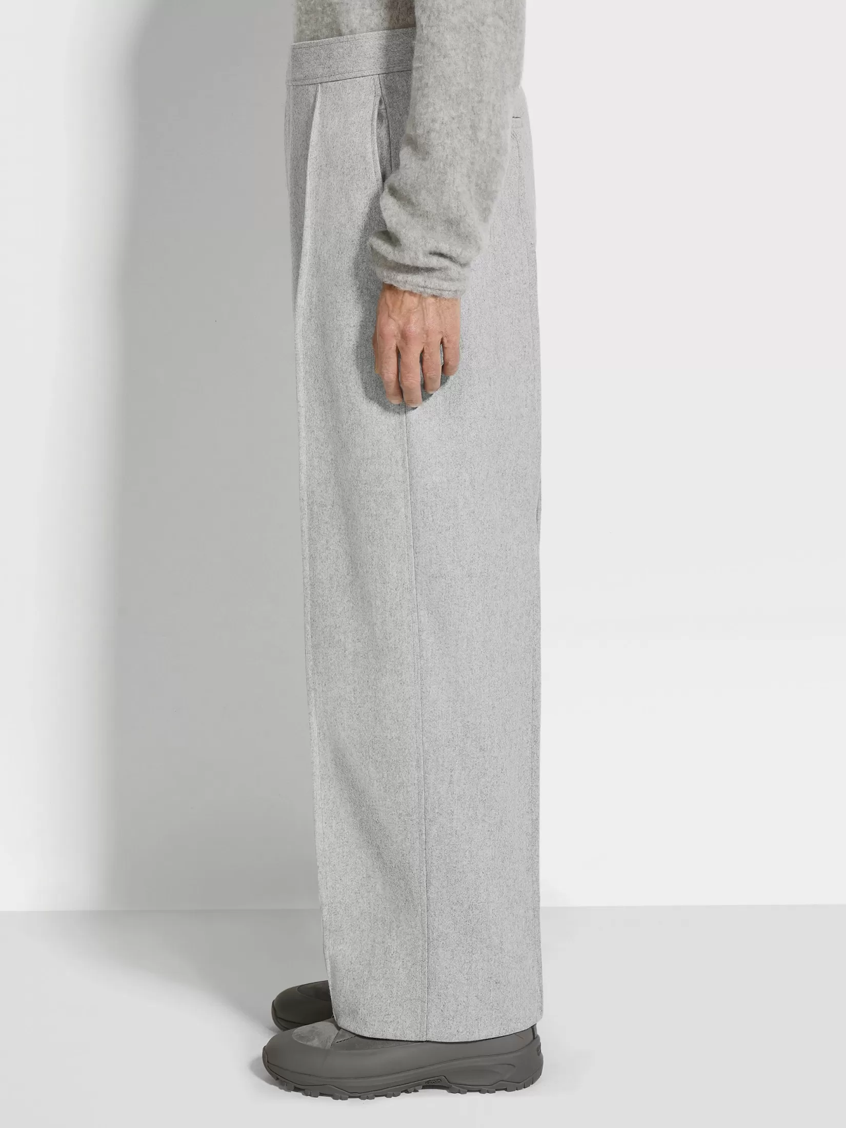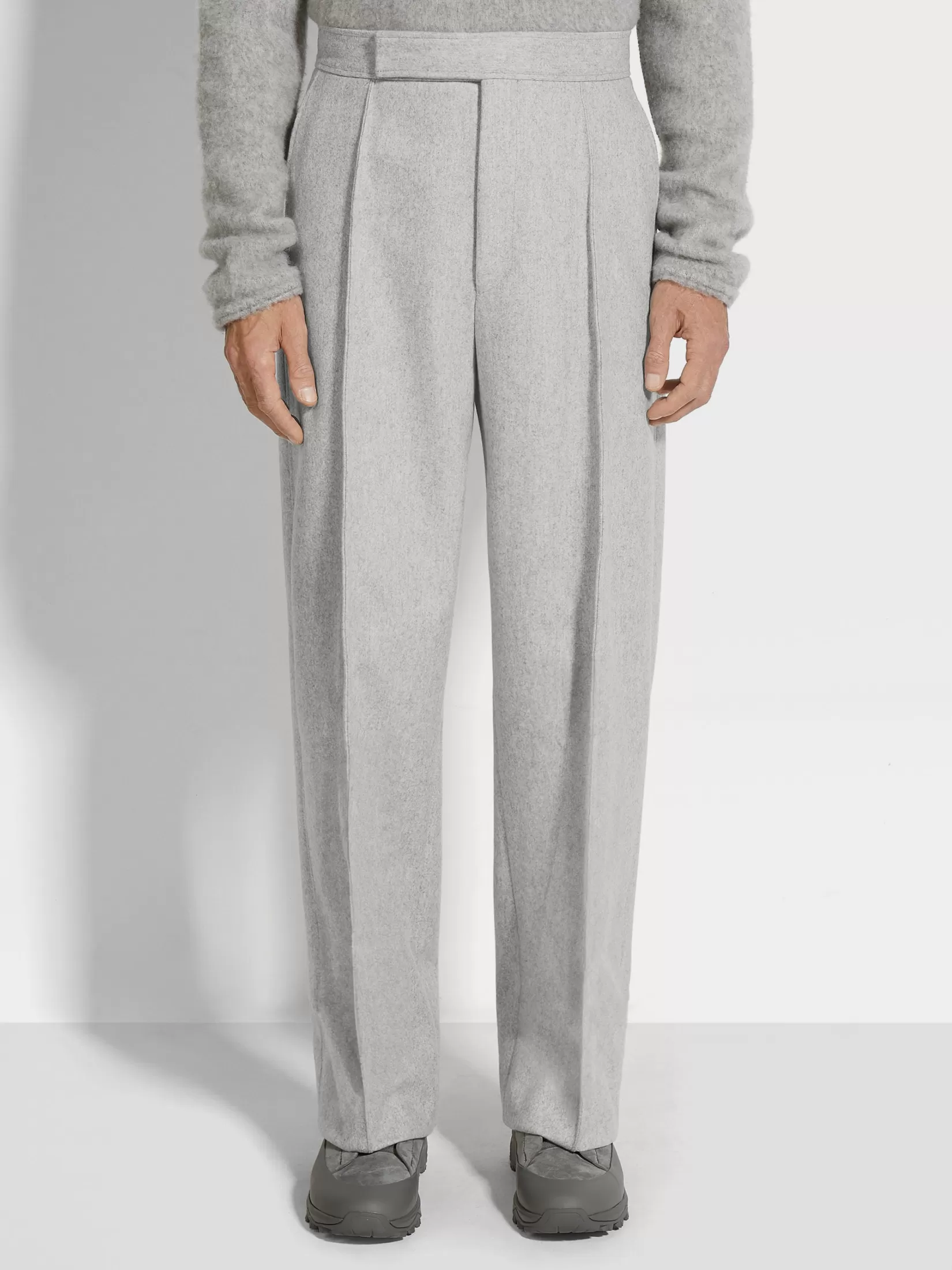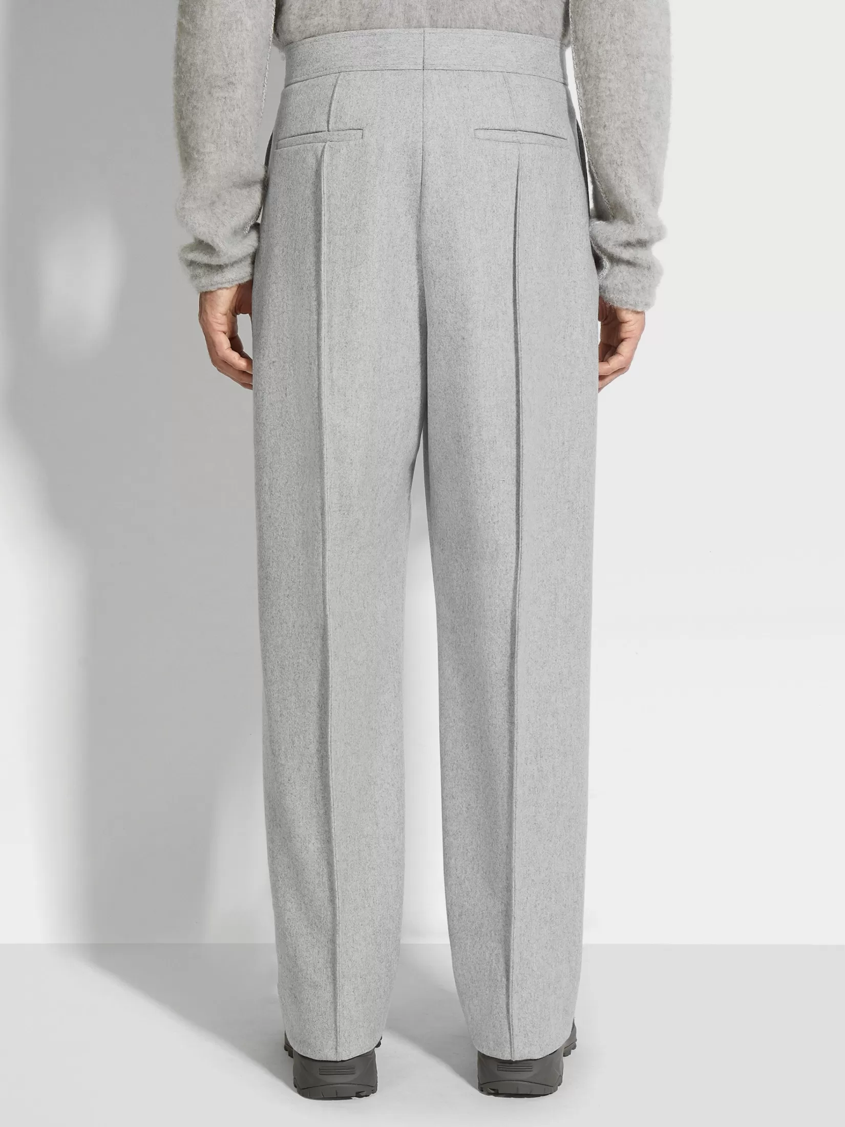 Las fibras de lana extralargas y la cachemira superfina dan a estos pantalones en Trofeo™ Cashmere gris claro un acabado lujosamente suave y ligero. Estos pantalones sartoriales de pierna ancha son la última tendencia para los más vanguardistas. Se presentan semiforrados en tejido gris claro mixto y con la parte frontal lisa.