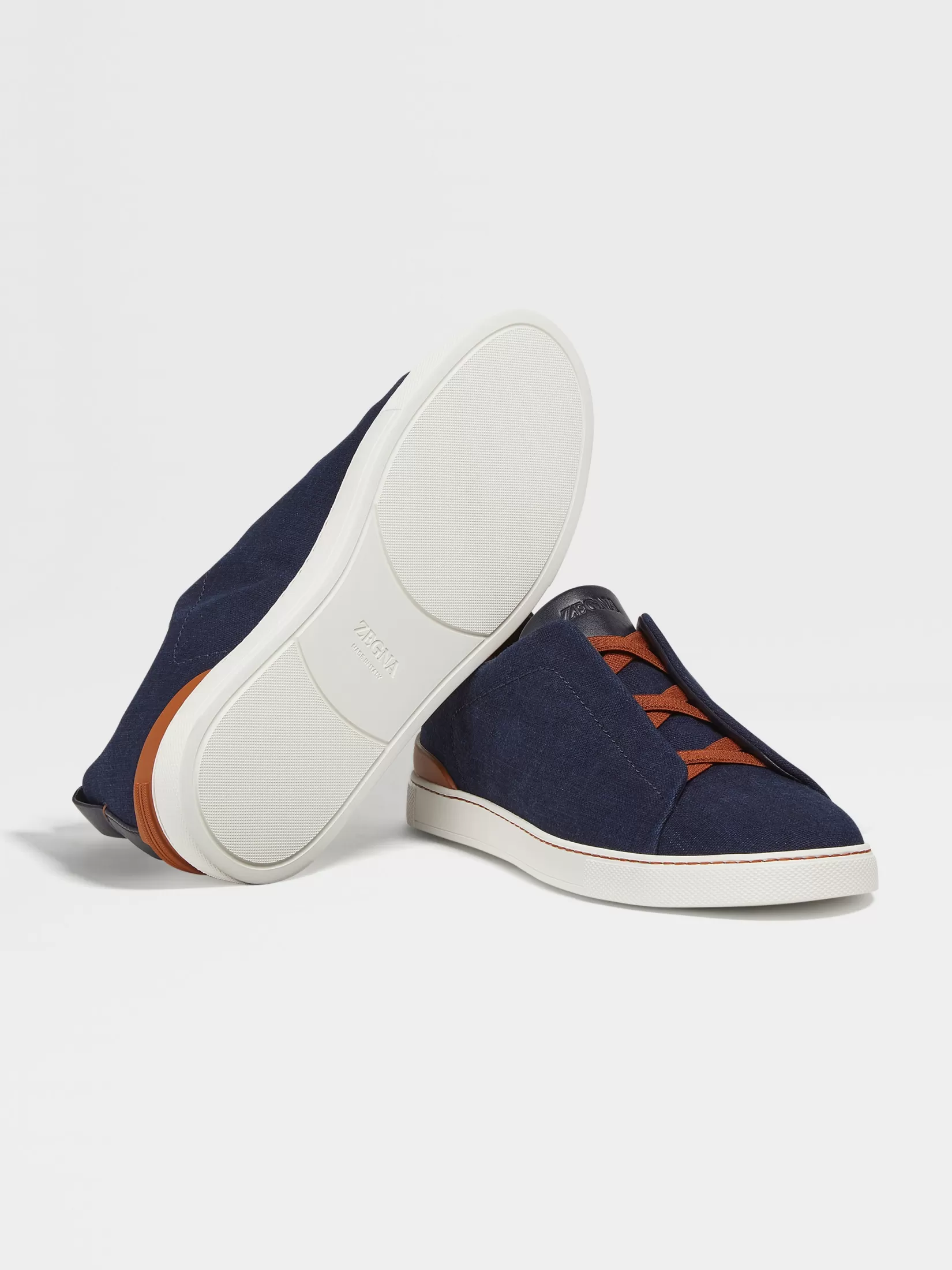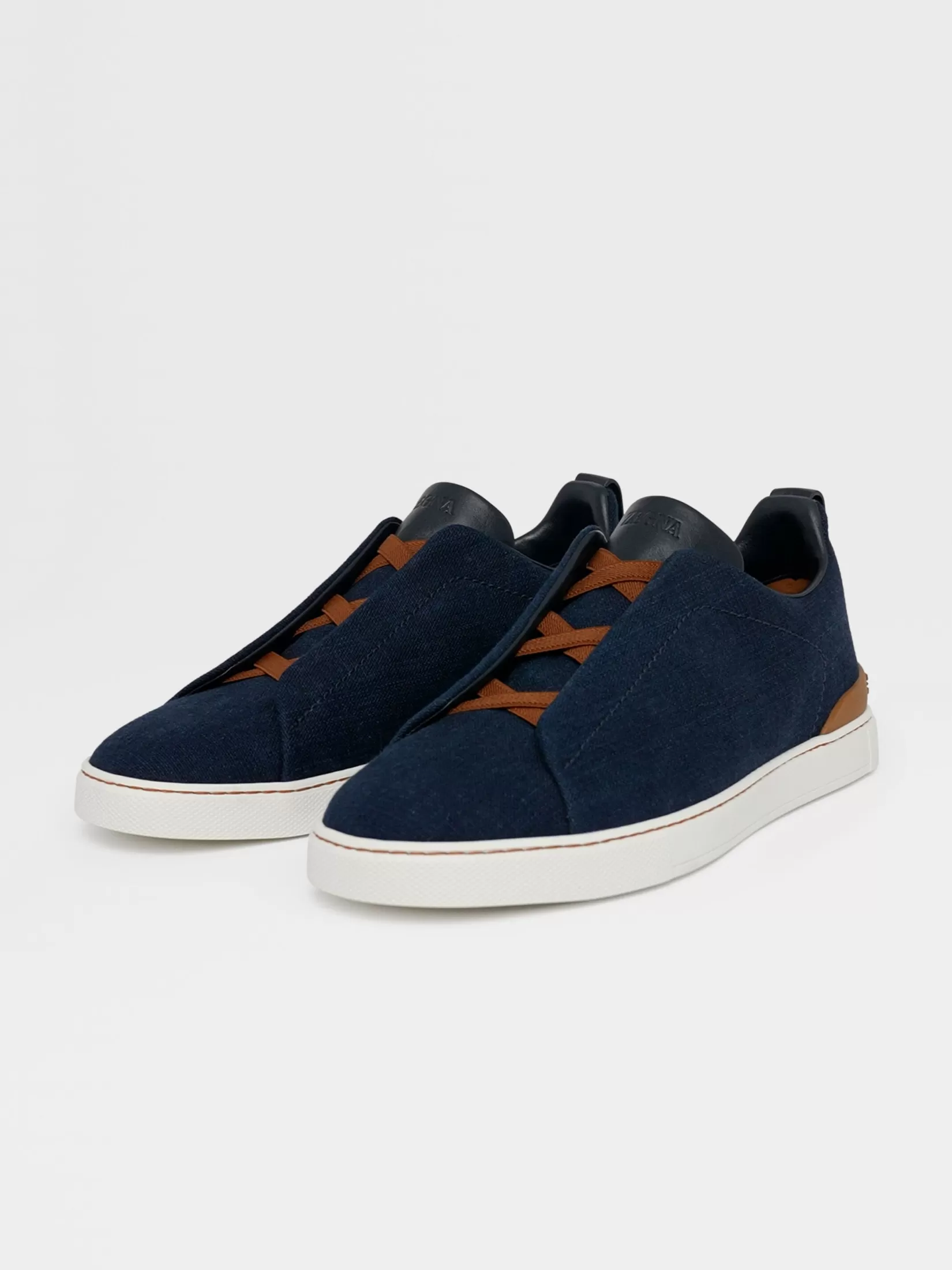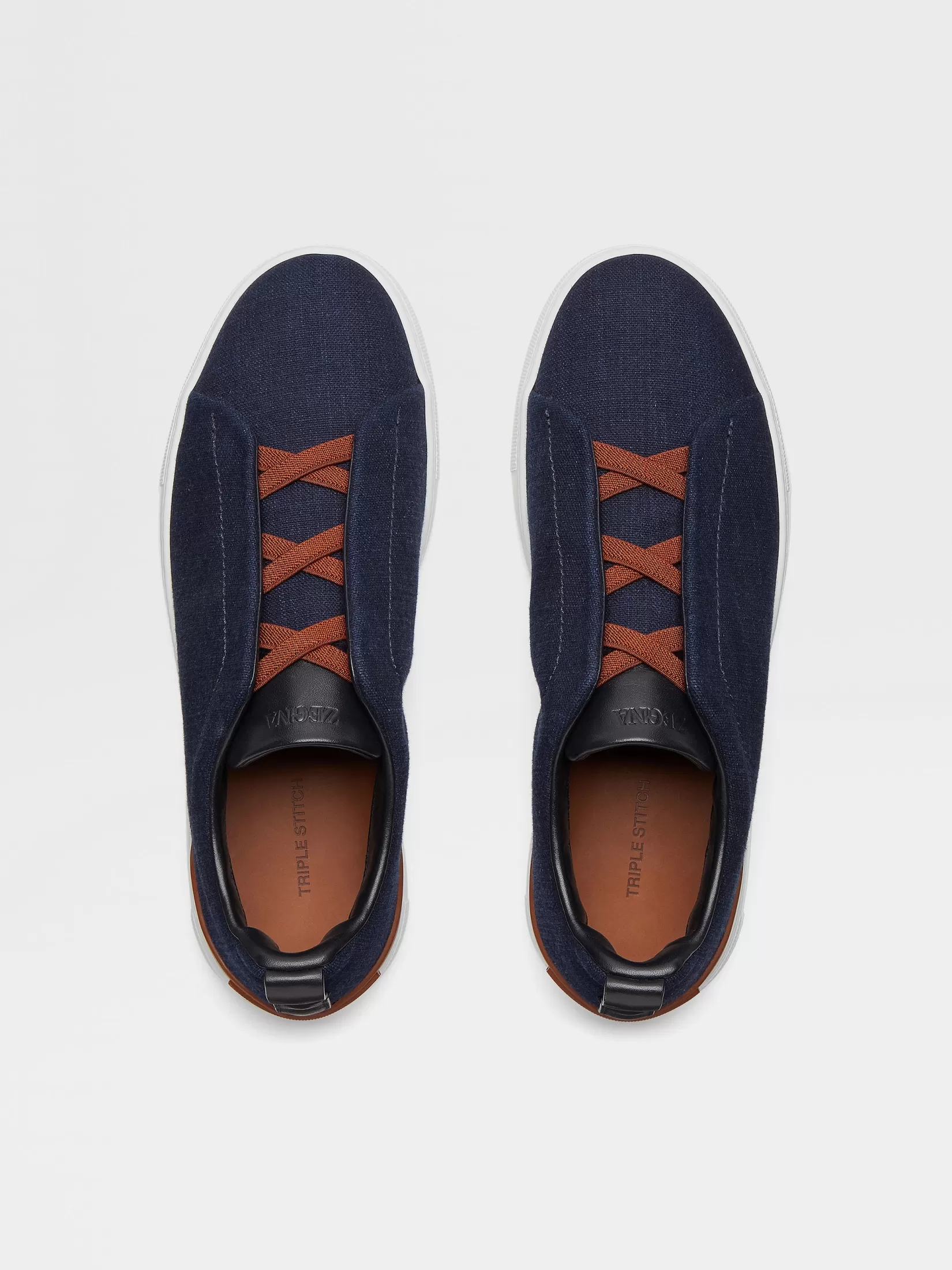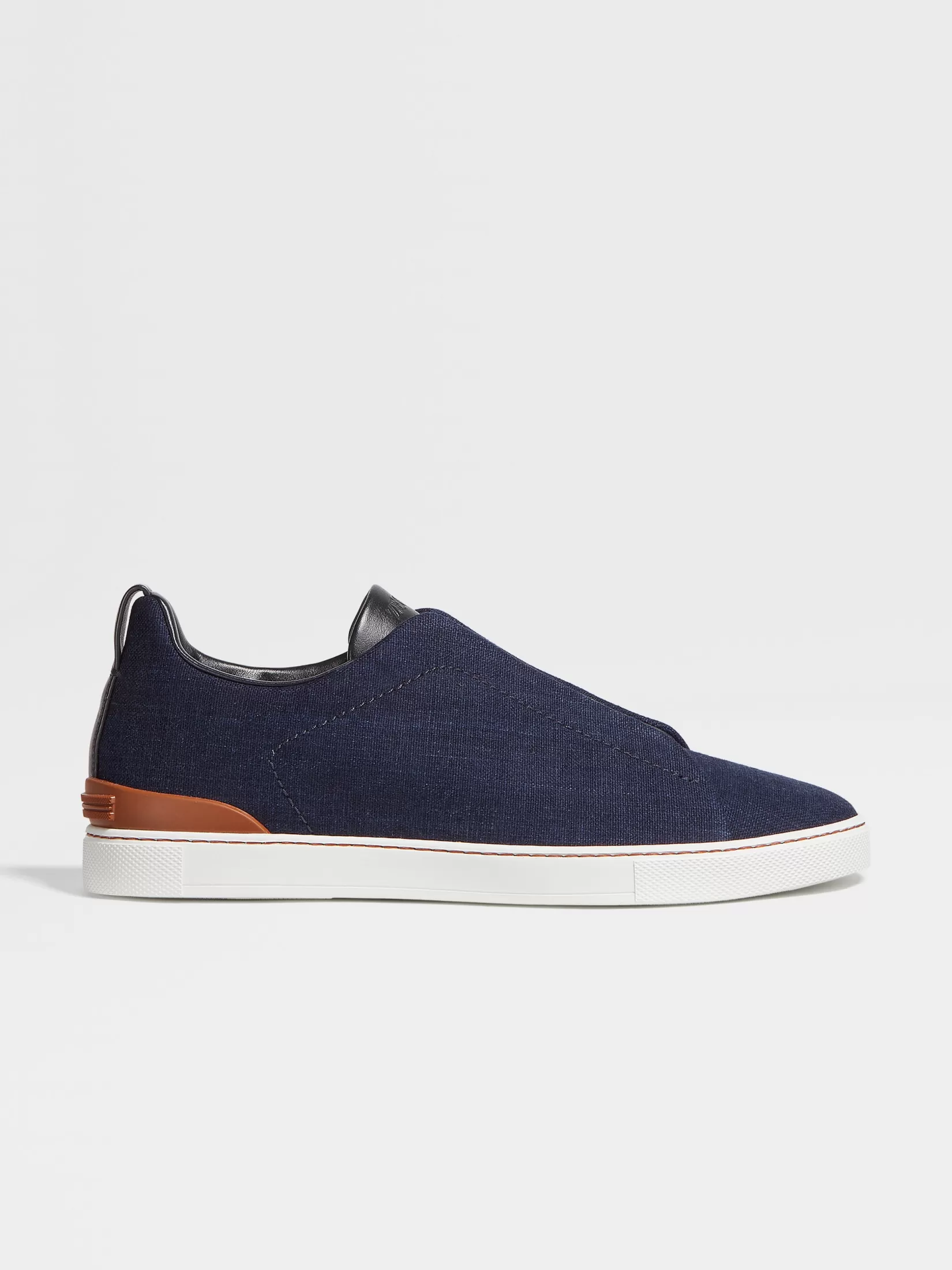 Los tejidos informales aportan frescura al diseño emblemático de Zegna: las zapatillas Triple Stitch™ azul marino, en tejido vaquero de algodón, son perfectas para los días de relax en la ciudad. El detalle de la marca, las tres cruces elásticas, evoca el pespunteado a mano de nuestras chaquetas sartoriales. La suela de goma, ligera pero duradera, contrasta en color blanco.