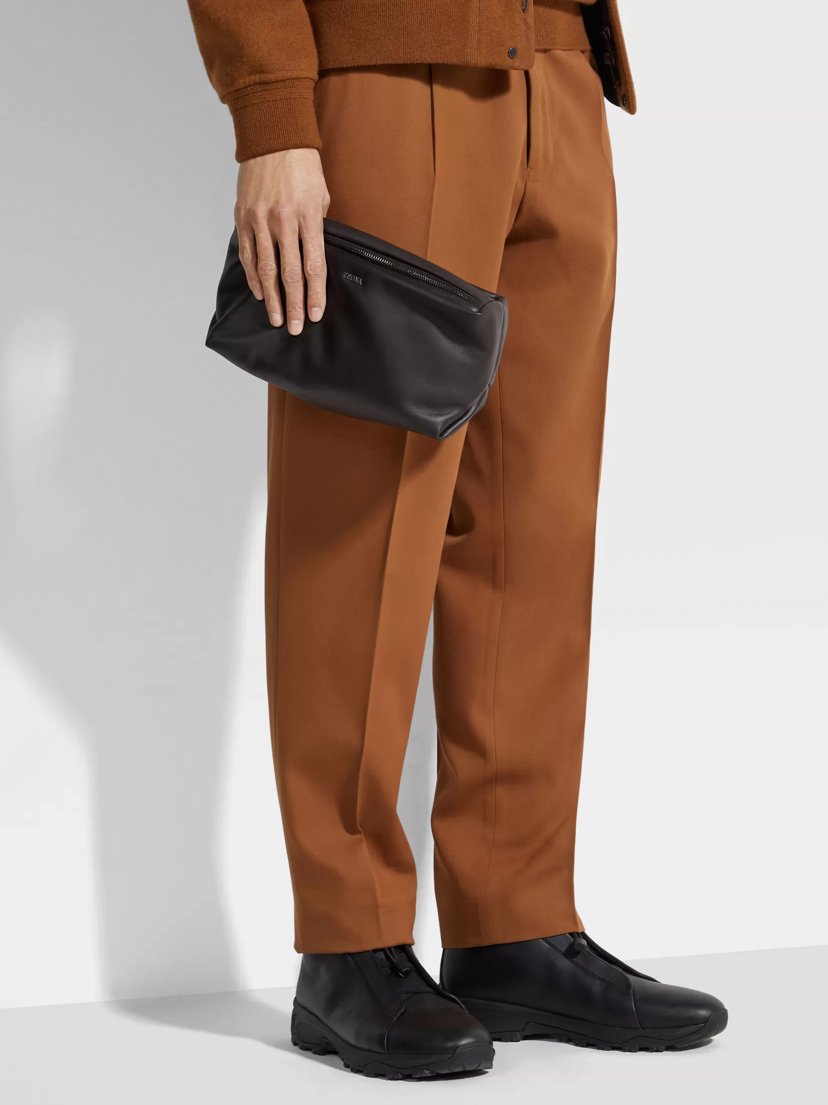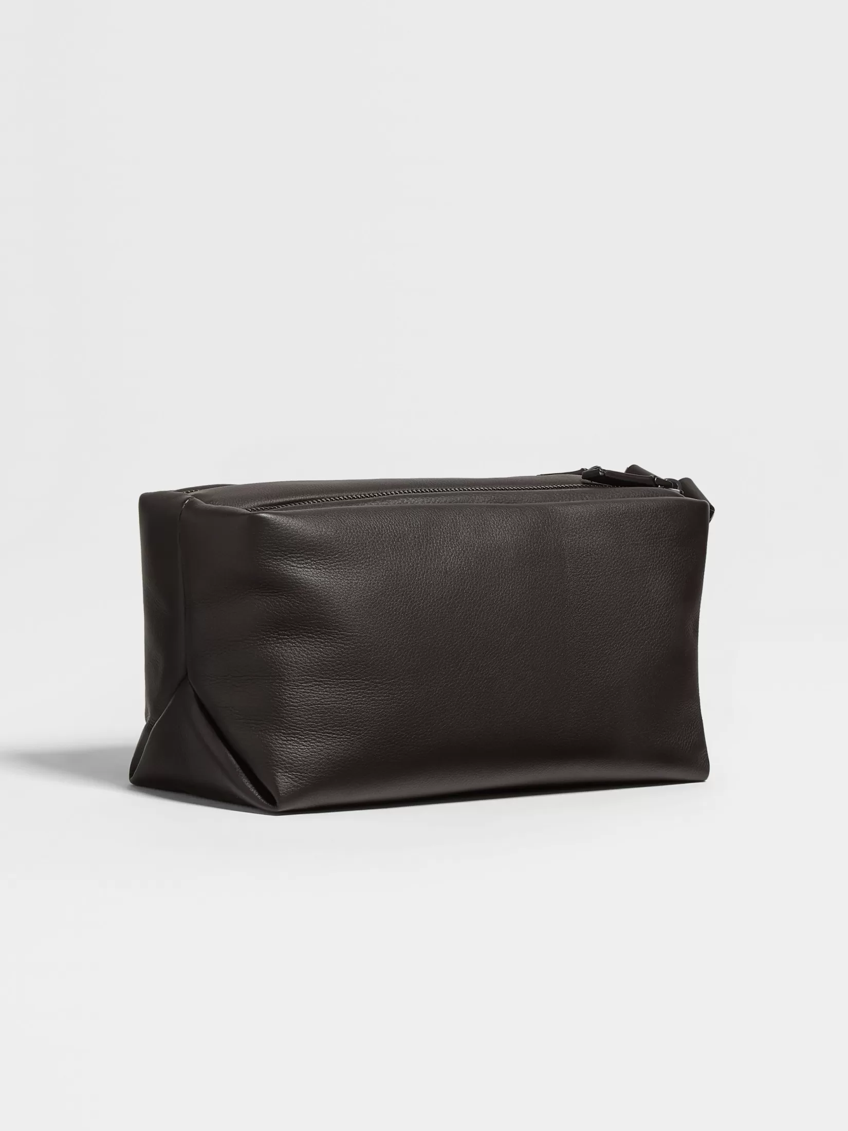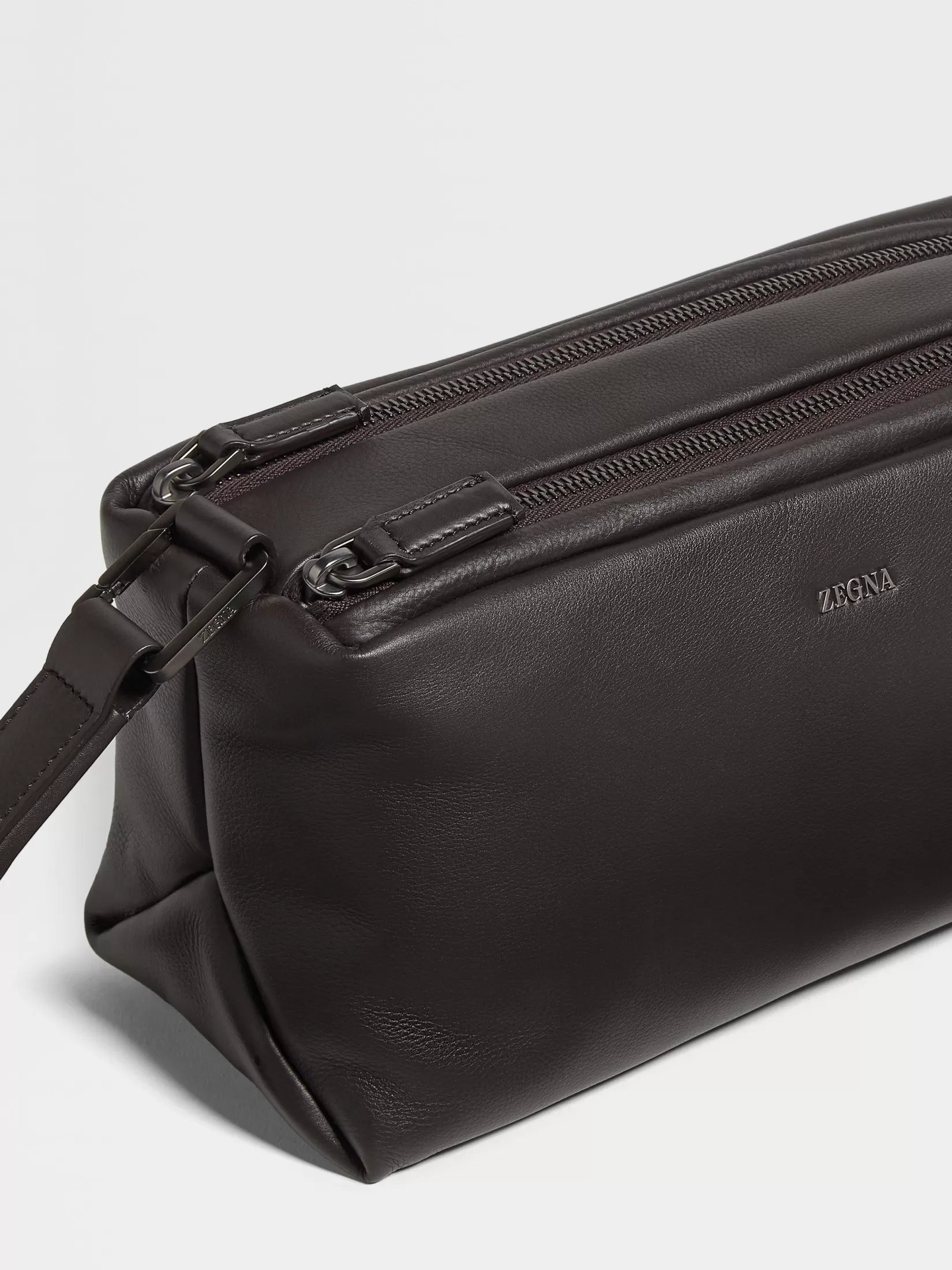 Flexible y resistente, el bolso de mano Softy marrón oscuro combina una confección lujosa en SECONDSKIN con un diseño maleable. Está forrado en poliéster resistente y su confección en piel de becerro suave está acabada con los detalles pulidos en ultranegro y el logo Zegna; un accesorio perfecto para viajar.