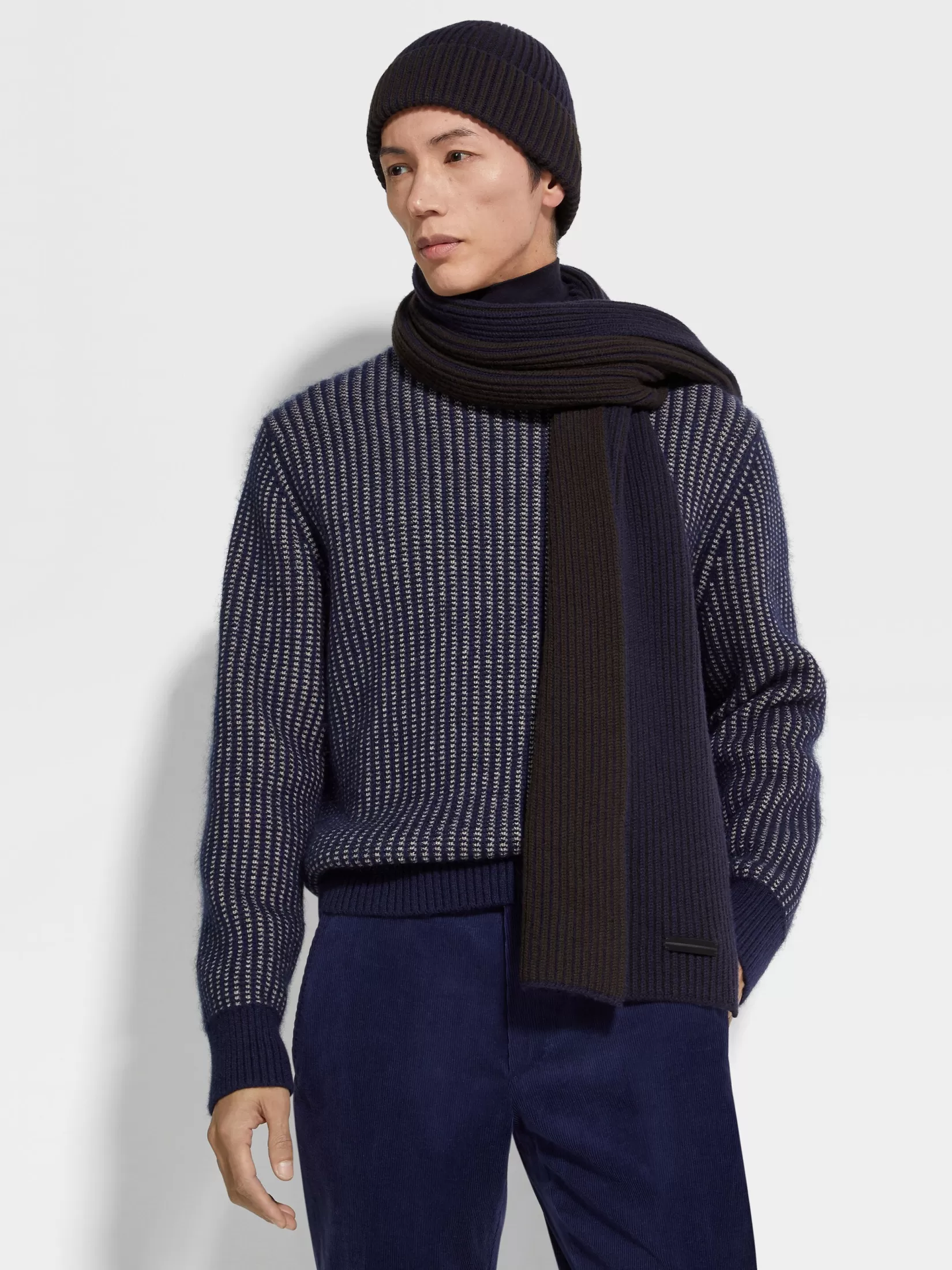 Los altos estándares de calidad de Zegna se extienden hasta a los accesorios más sencillos como esta bufanda azul tinta y marrón oscuro en Oasi Cashmere, confeccionada con uno de los tejidos más suaves y exclusivos de la marca. Esta lujosa bufanda de cachemira se elegantiza con su elaboración en punto de cable de dos colores. El parche en piel nobuk con el logo Zegna 232 Road Brand Mark acaba su diseño.