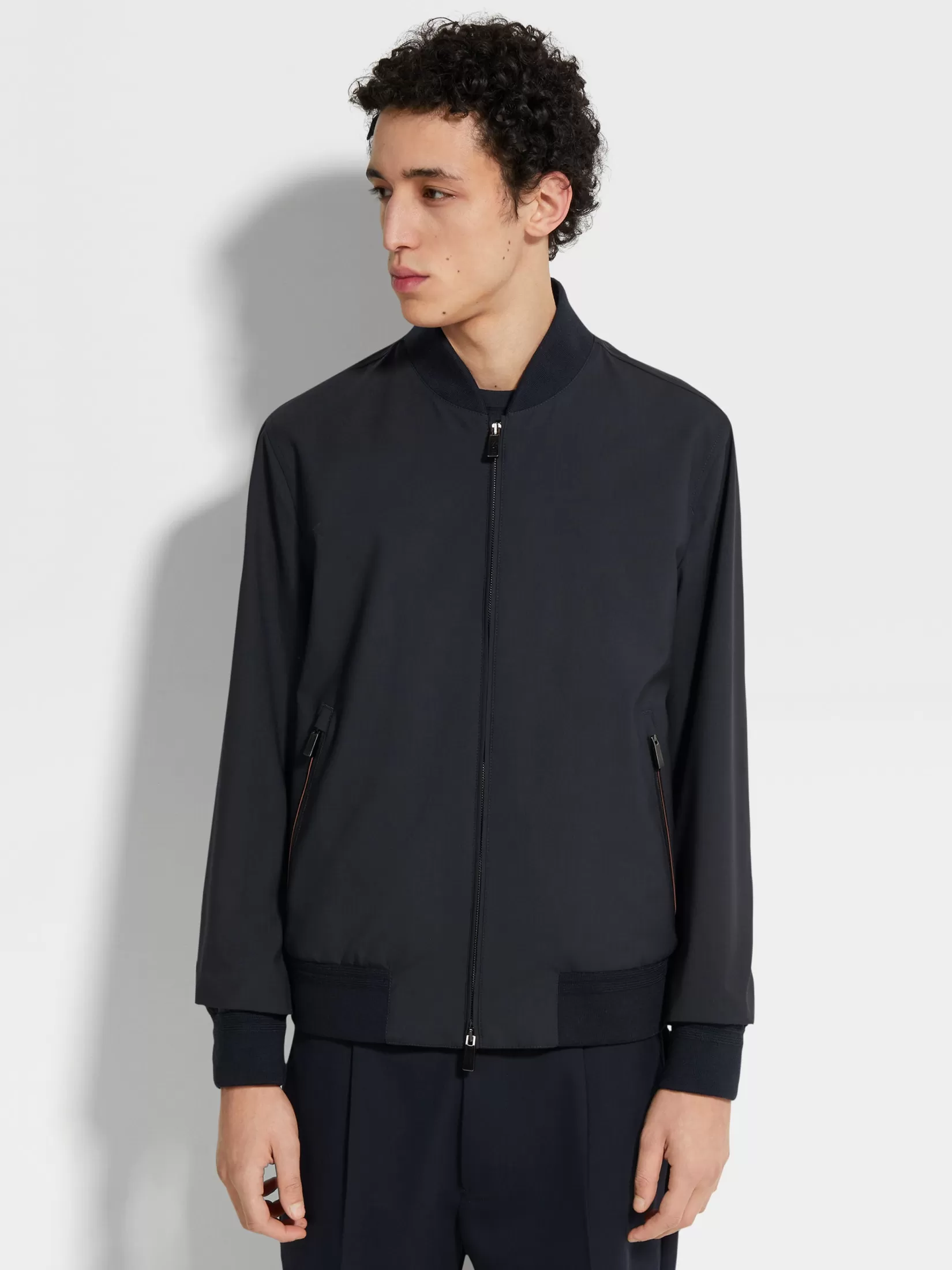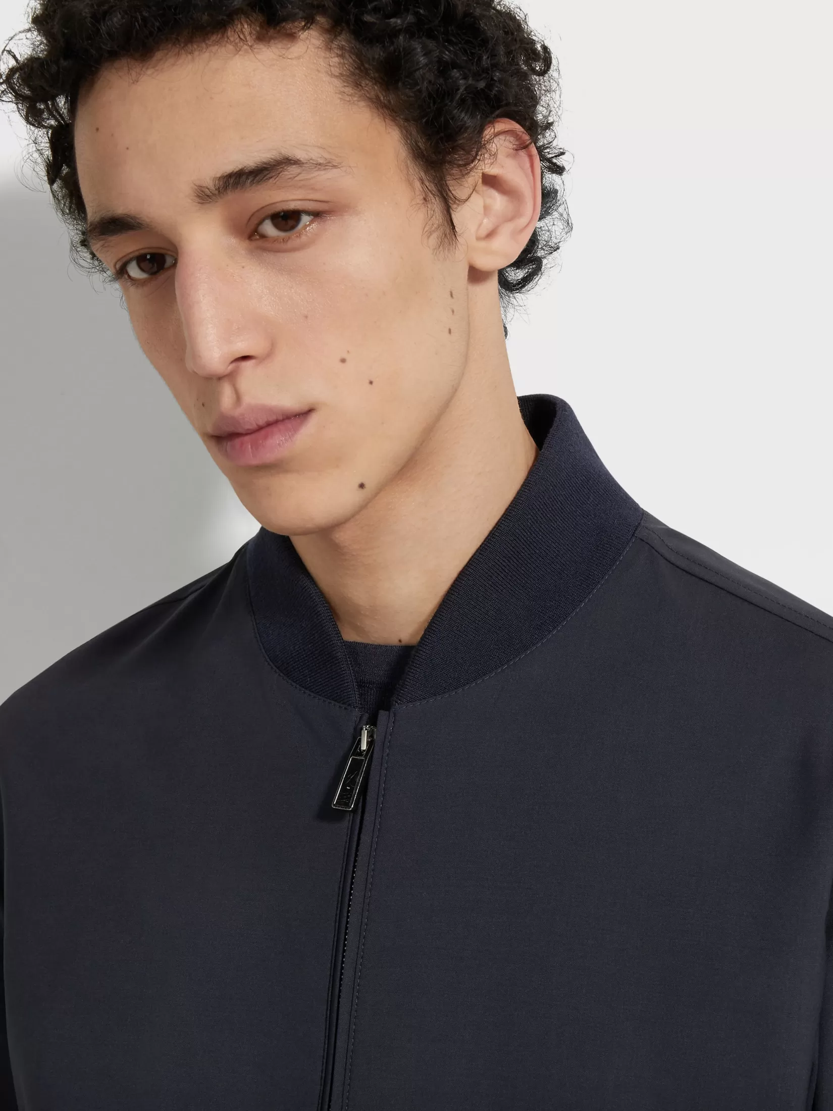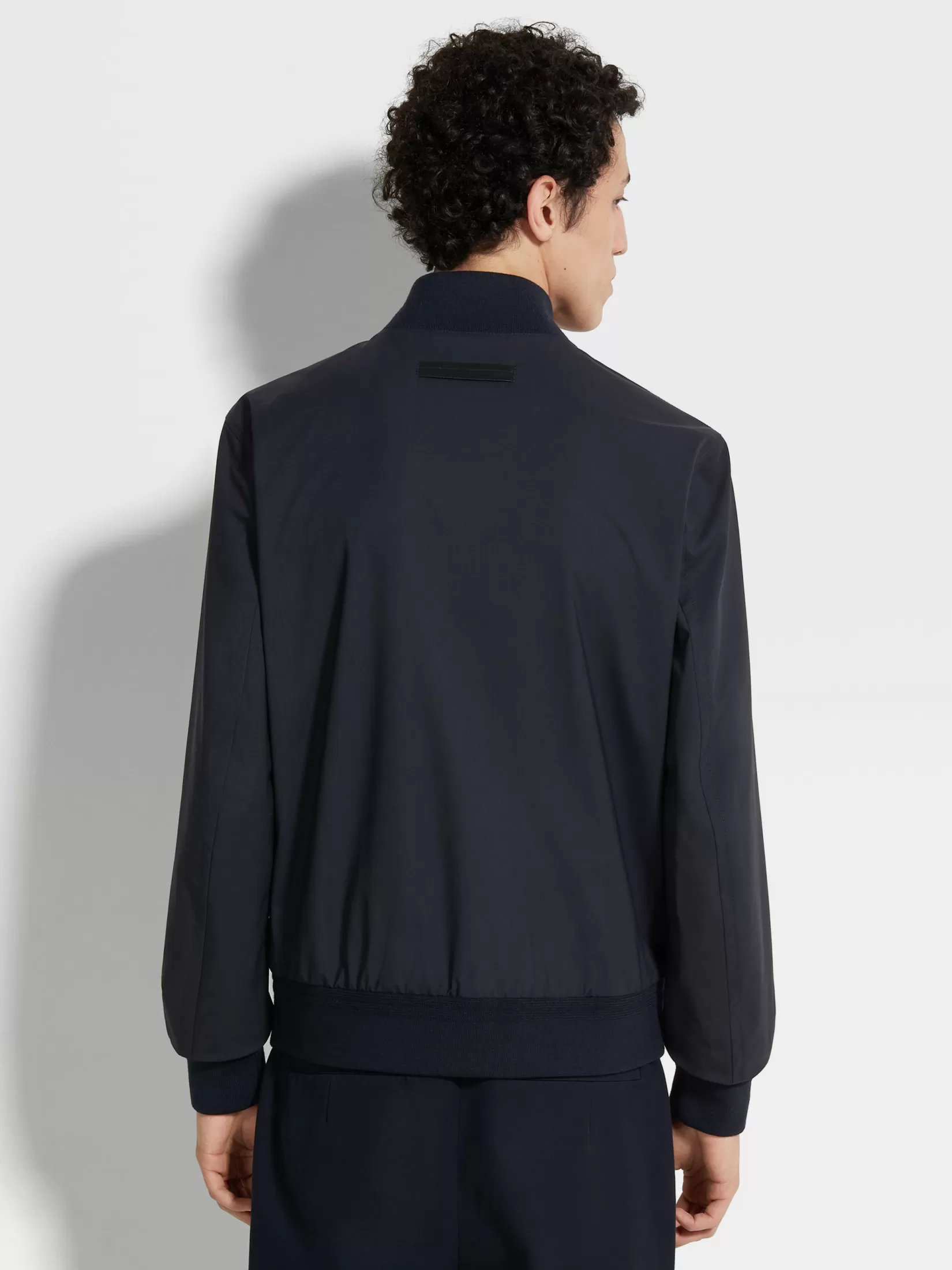 Esta chaqueta bómber azul marino está confeccionada con uno de los tejidos más innovadores de Zegna, Trofeo™ Elements, que se compone de fibras de lana y una membrana resistente al agua para crear una prenda suave, ligera y resistente al clima inclemente. Este modelo deportivo está acabado con un cuello mao, detalles en piel y el dobladillo acanalado.