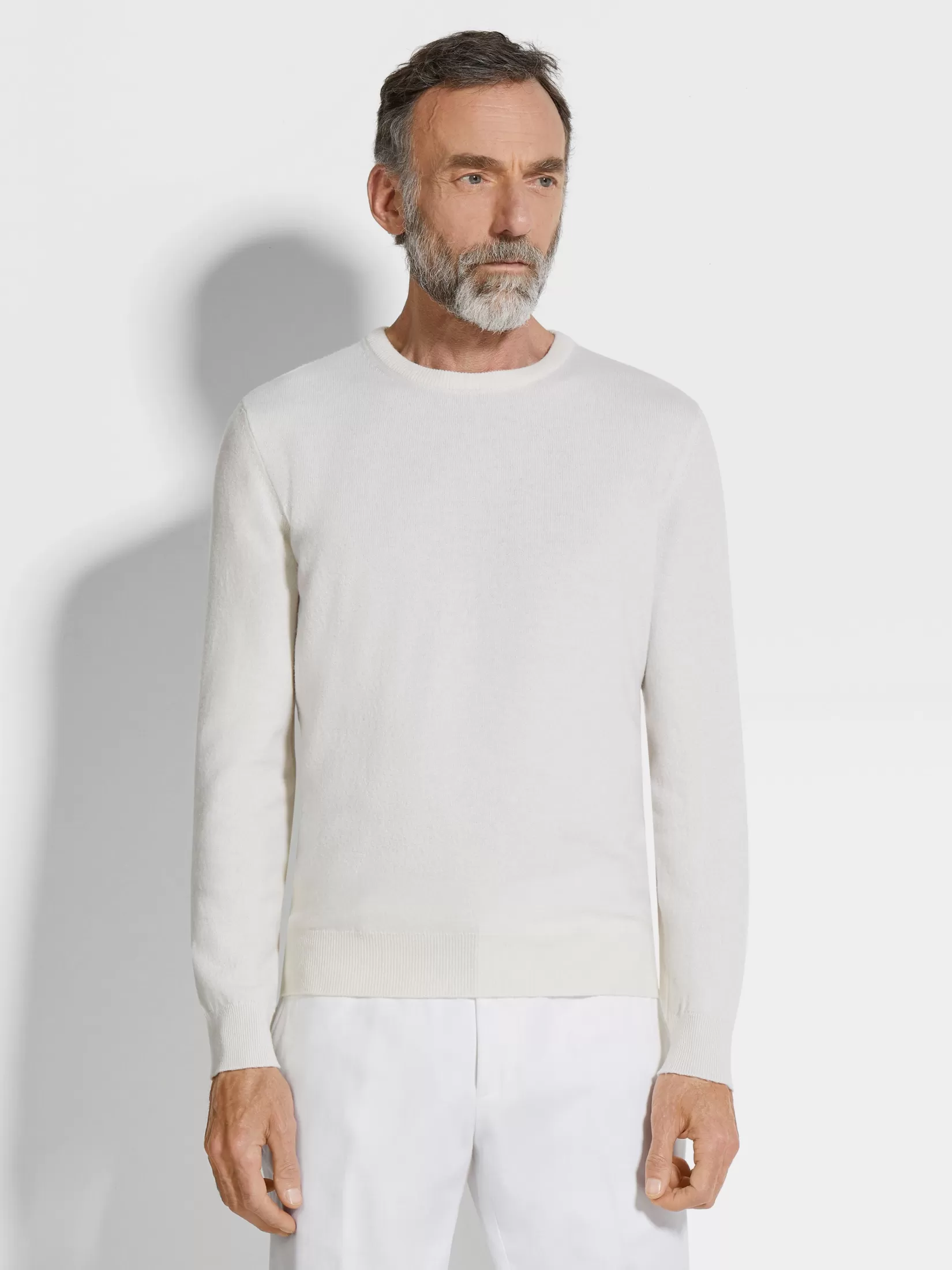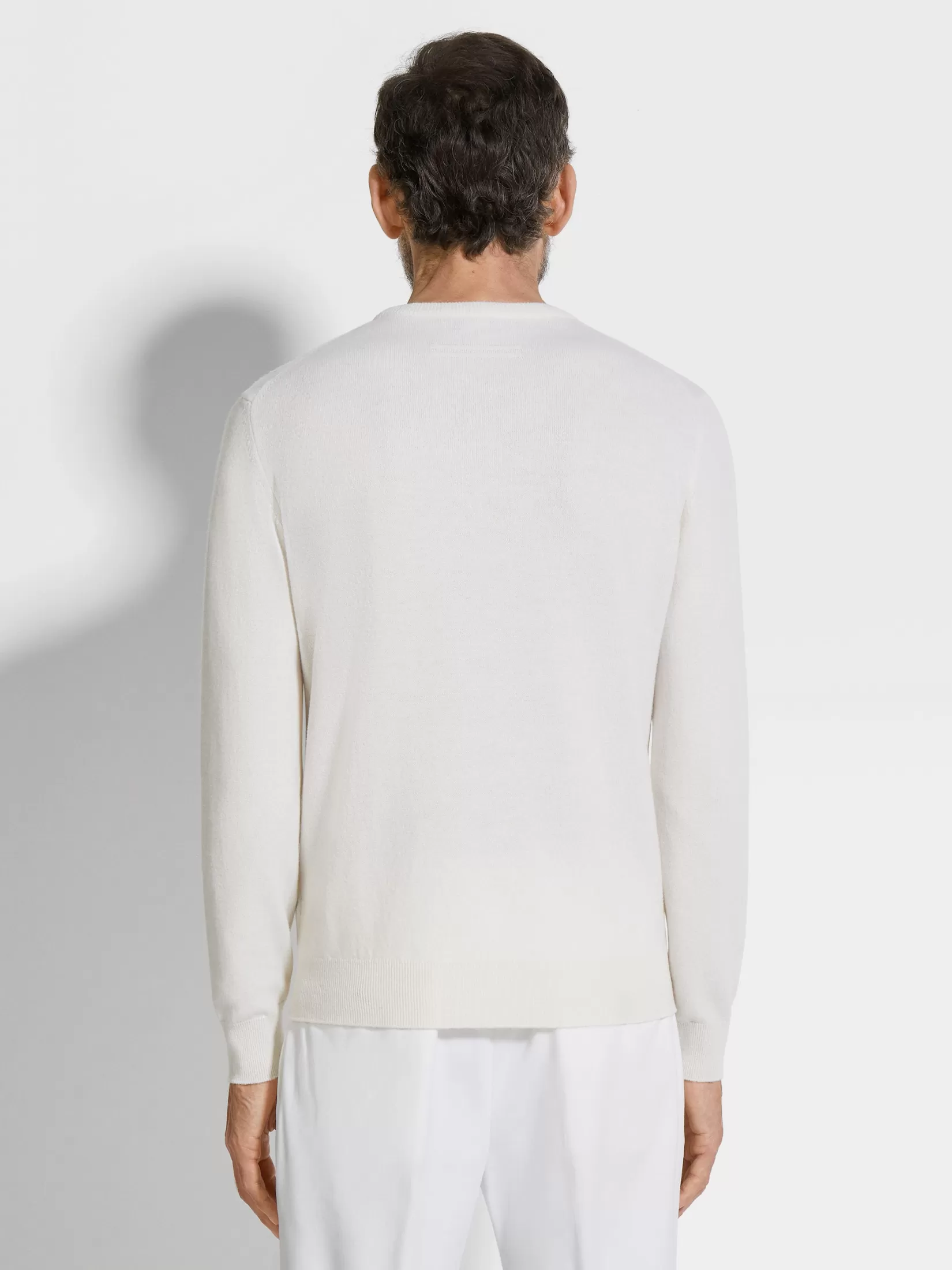Este jersey de cuello redondo, blanco mixto, está confeccionado con uno de los tejidos más exclusivos de Zegna, Oasi Cashmere, el cual le aporta un estilo lujoso. Sus líneas básicas hacen que su elaboración en punto brille por sí sola. Este jersey está acabado con el clásico cuello redondo y el borde acanalados.