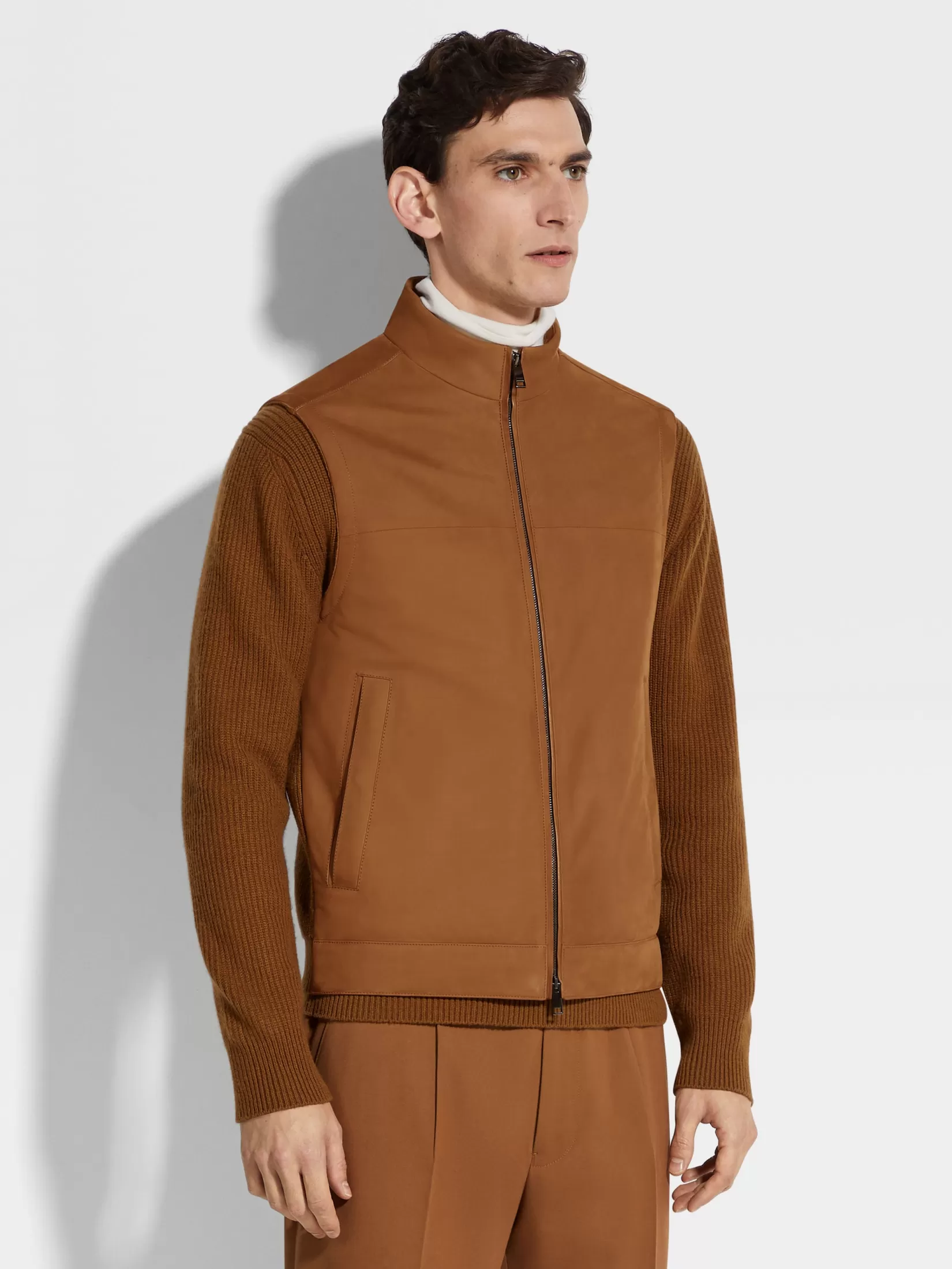 Este chaleco de piel en color Foliage oscuro, con un panel de punto en la espalda, queda bien debajo de chaqueta o por sí solo. El chaleco con cremallera está acolchado y tiene un forro cálido de cachemira. Está acabado con un cuello mao.