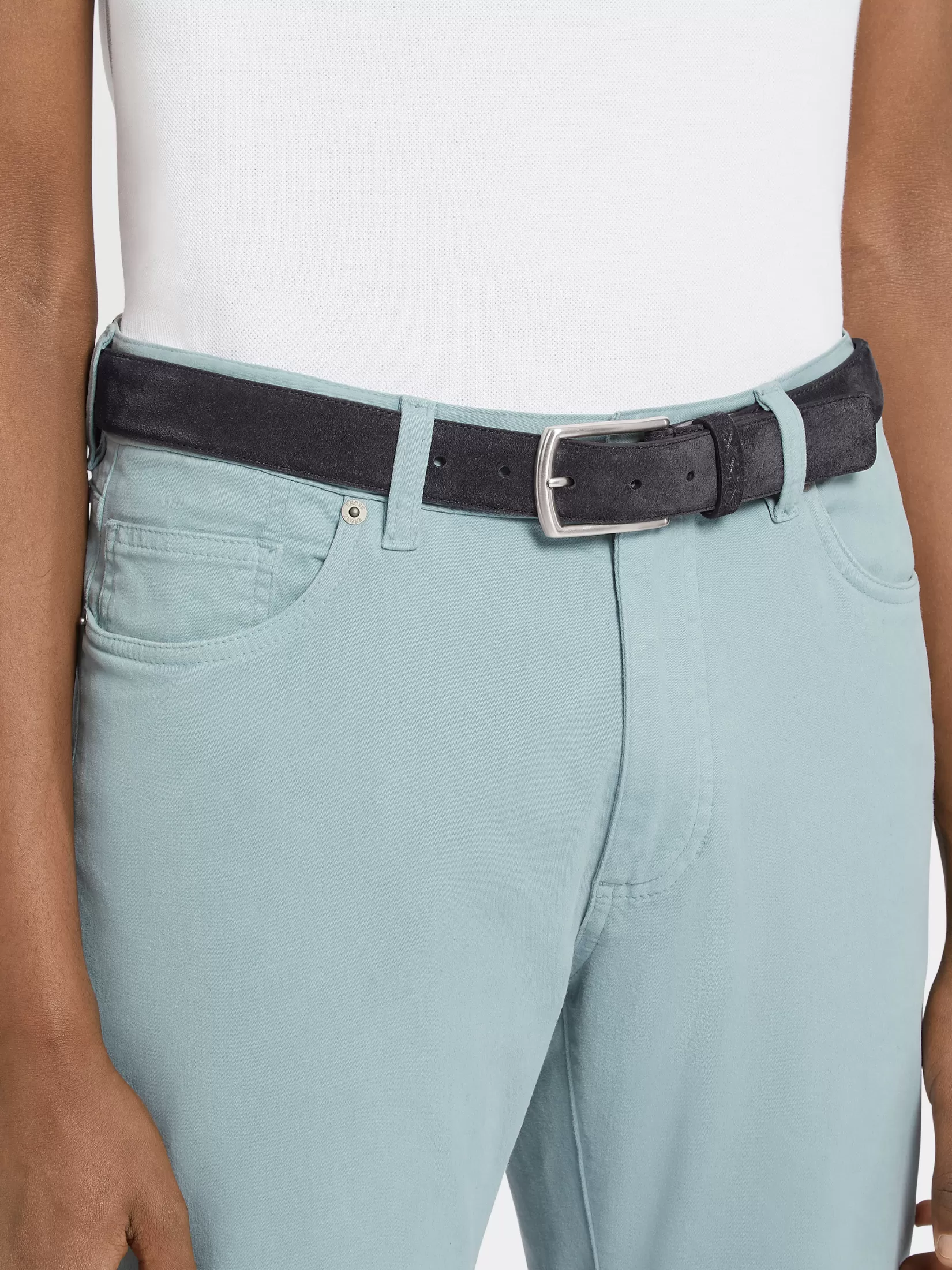 Este suave cinturón de ante azul marino exhibe un contraste de texturas con el forro en nobuk color Foliage. Inspirado en las icónicas zapatillas Triple Stitch™ de Zegna, la hebilla, esmaltada en plateado, destaca por los detalles de costura que firman la colección. El logotipo XXX completa este moderno accesorio.