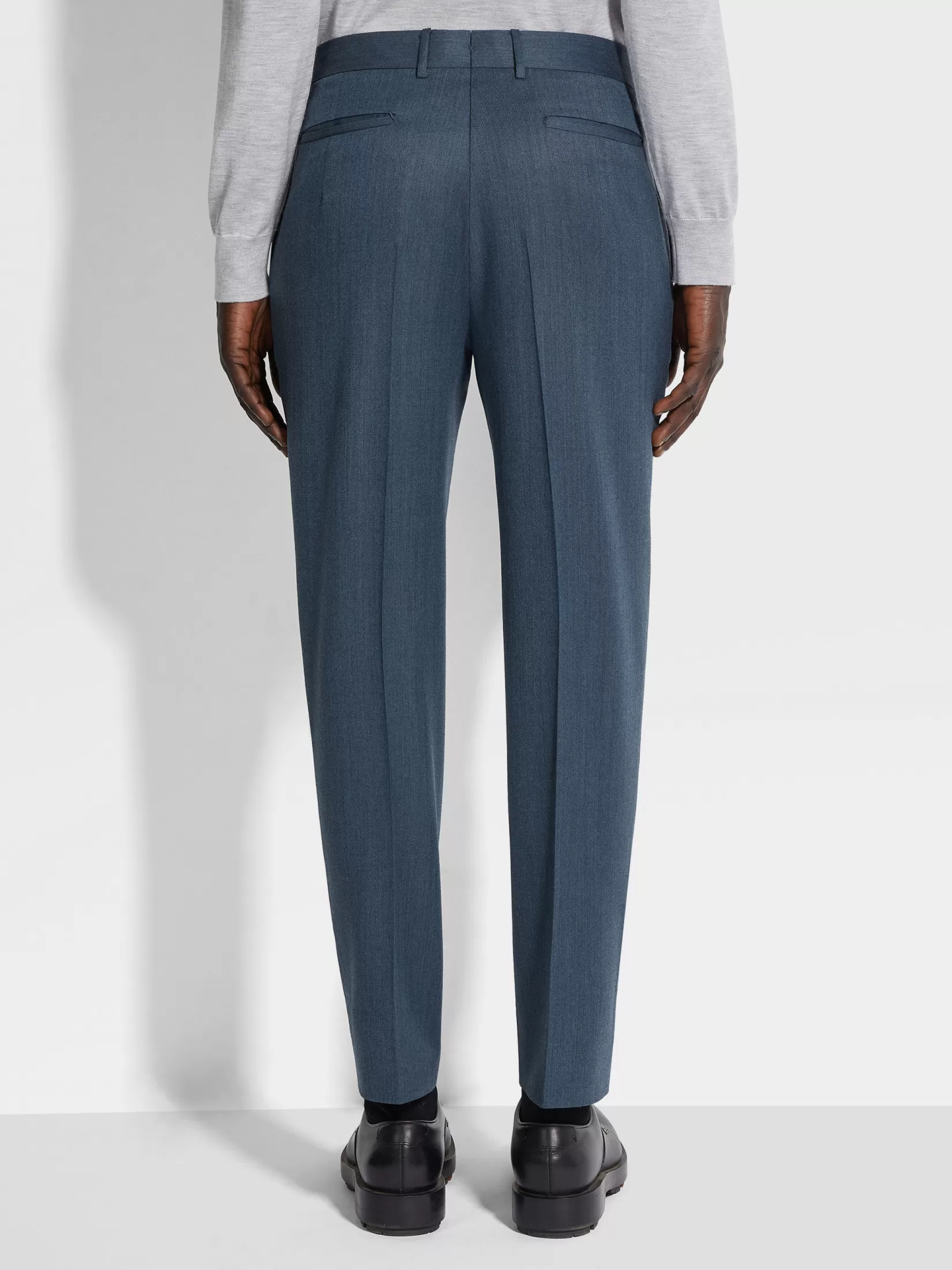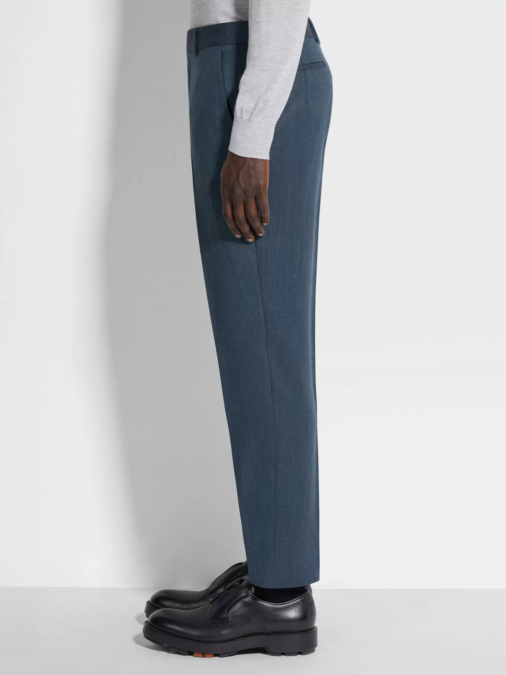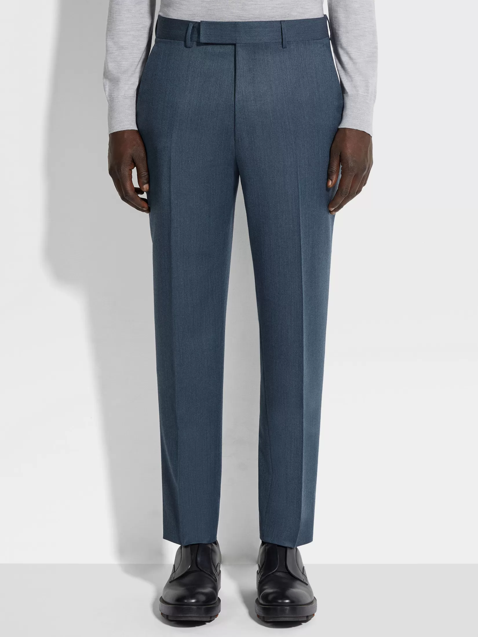 Las fibras más largas y elásticas de la lana Trofeo™ aportan a estos pantalones verde azulado claro un acabado más suave y liso. Este refinado tejido se combina con un corte entallado y la parte frontal lisa. Los pantalones están acabados con bolsillos oblicuos.