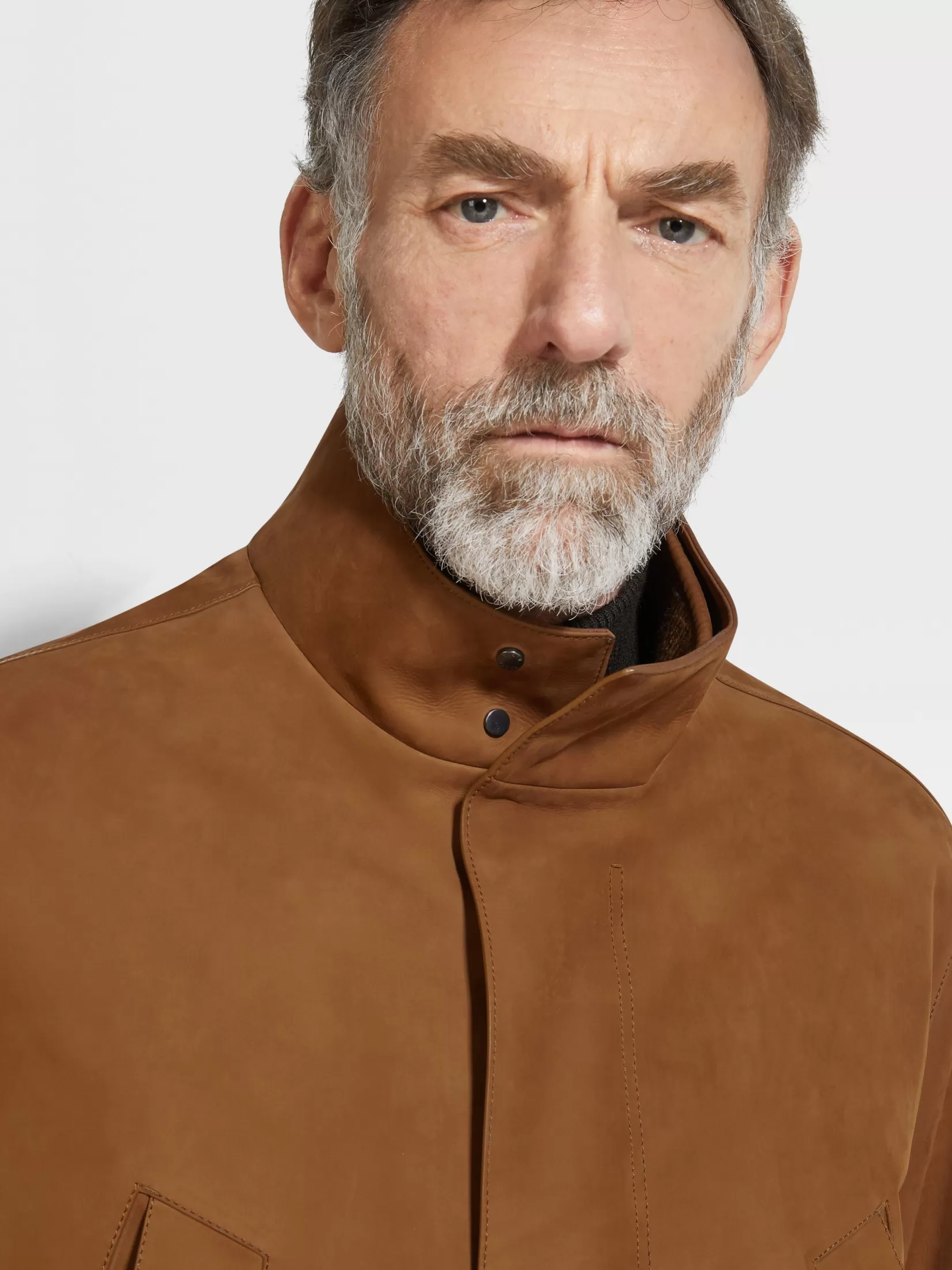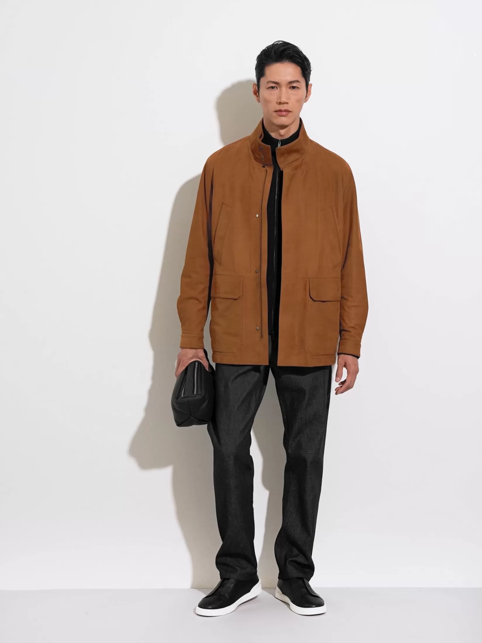 Confeccionado en nobuk de piel de becerro pura, el abrigo de tres cuartos en Foliage oscuro aporta un toque diferente a un clásico de la ropa de hombre. Esta prenda de abrigo está forrada con una mezcla suave de lana y está acolchado para que abrigue más. Está dotado de una capucha plegable, el cuello mao y varios bolsillos.