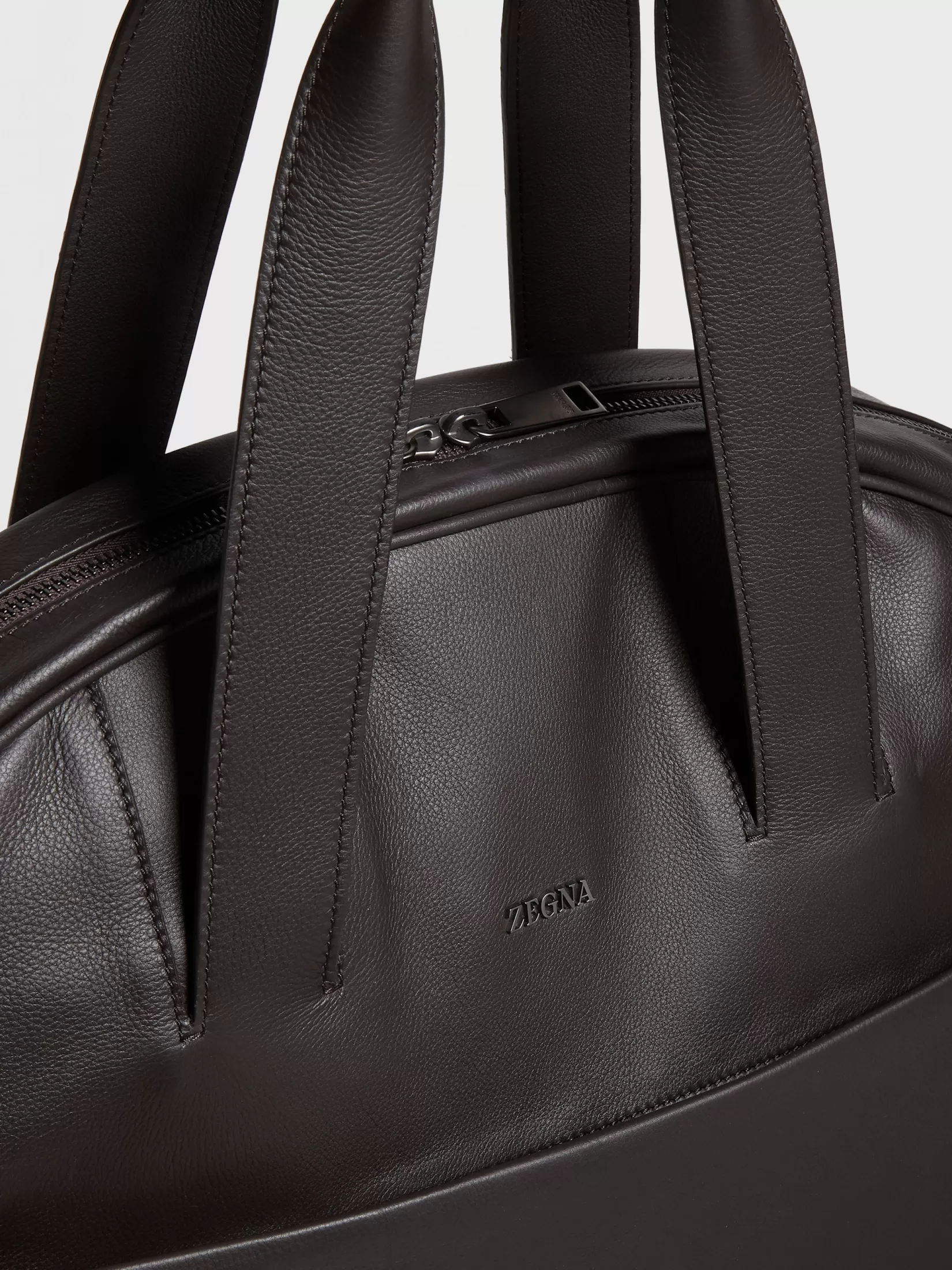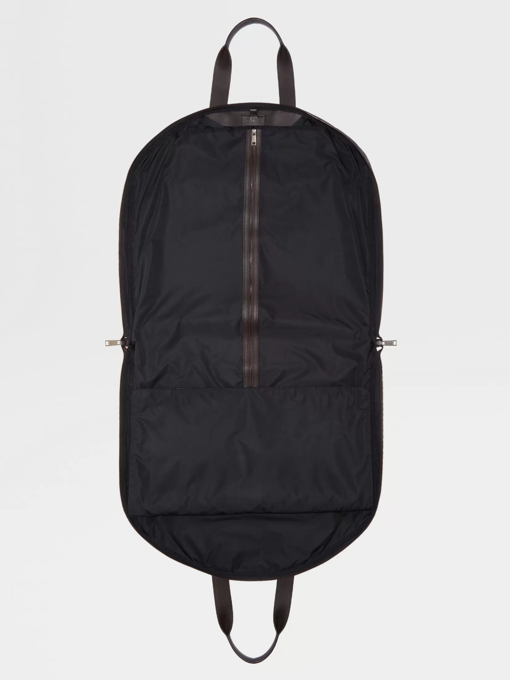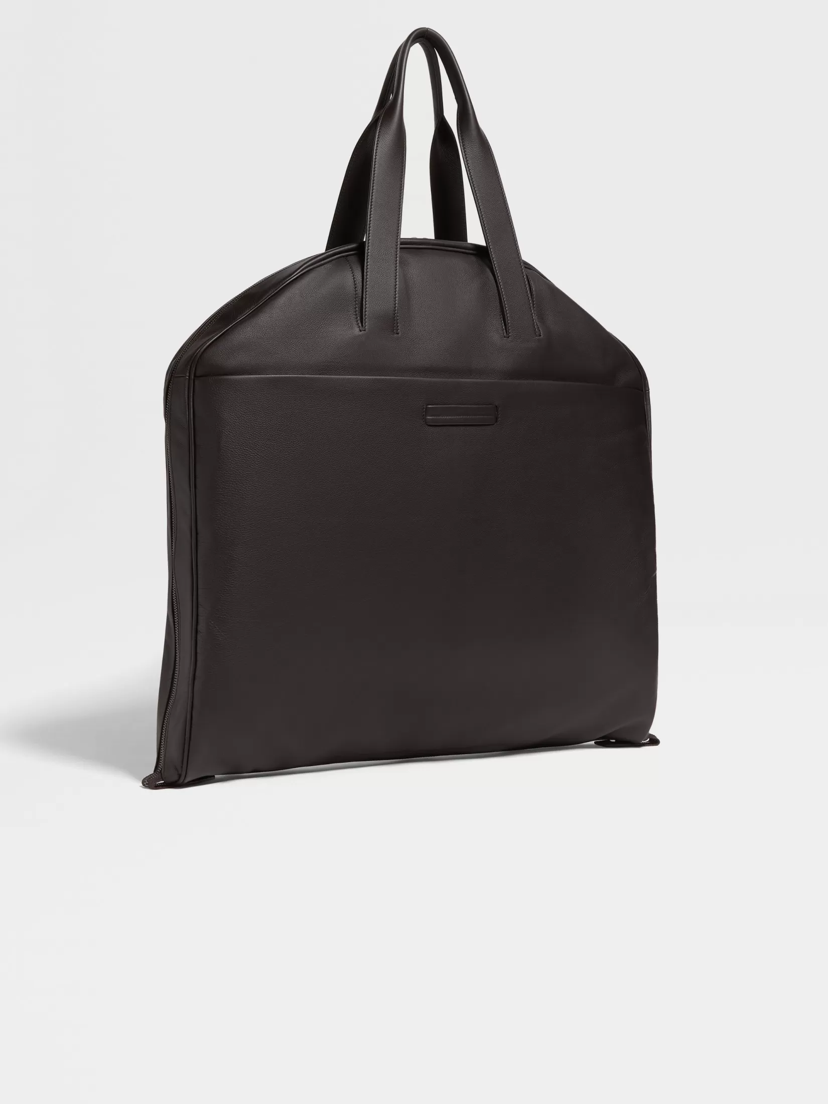 Flexible y resistente, la bolsa portatrajes marrón oscuro en SECONDSKIN protege su ropa más preciada mientras viaja. La parte externa en piel está forrada con poliéster resistente y los cierres de cremallera protegen sus prendas al máximo. Los detalles pulidos en ultranegro y el logo de Zegna acaban este modelo.
