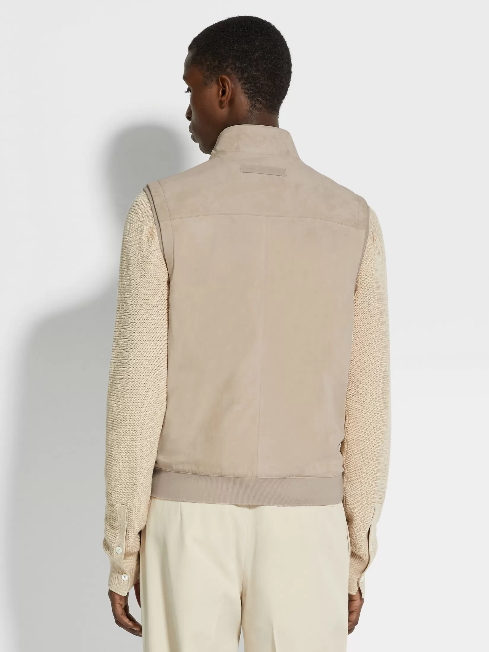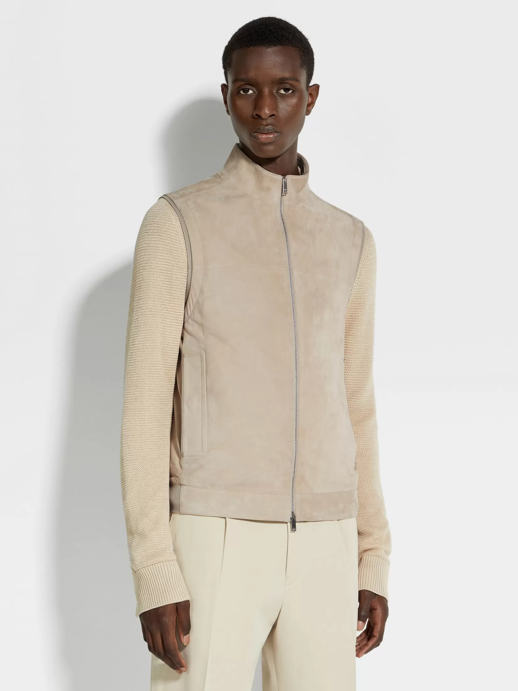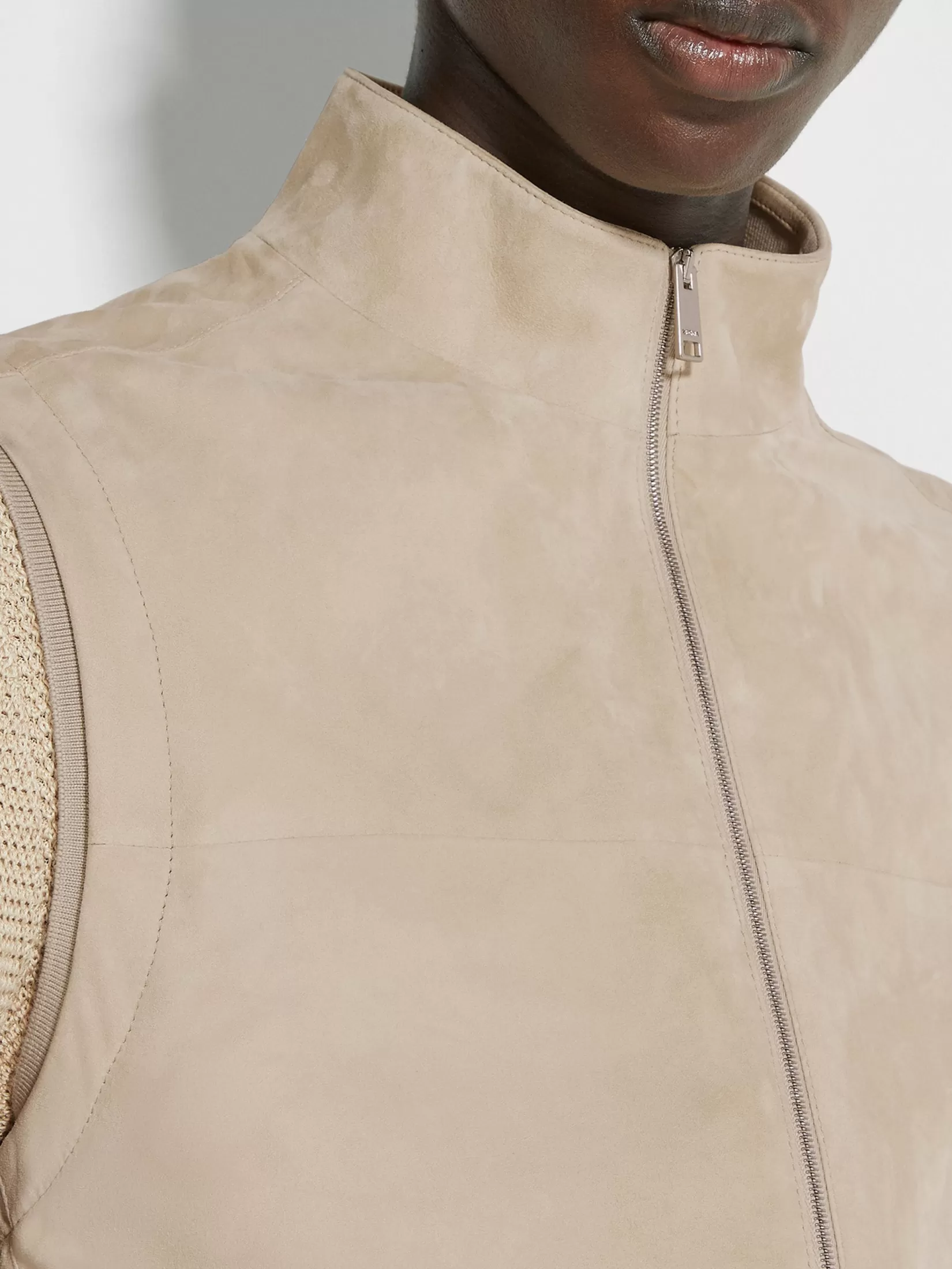 El lujoso ante de piel de cordero convierte este chaleco beige claro en una prenda de abrigo elegante. Este modelo sin m…