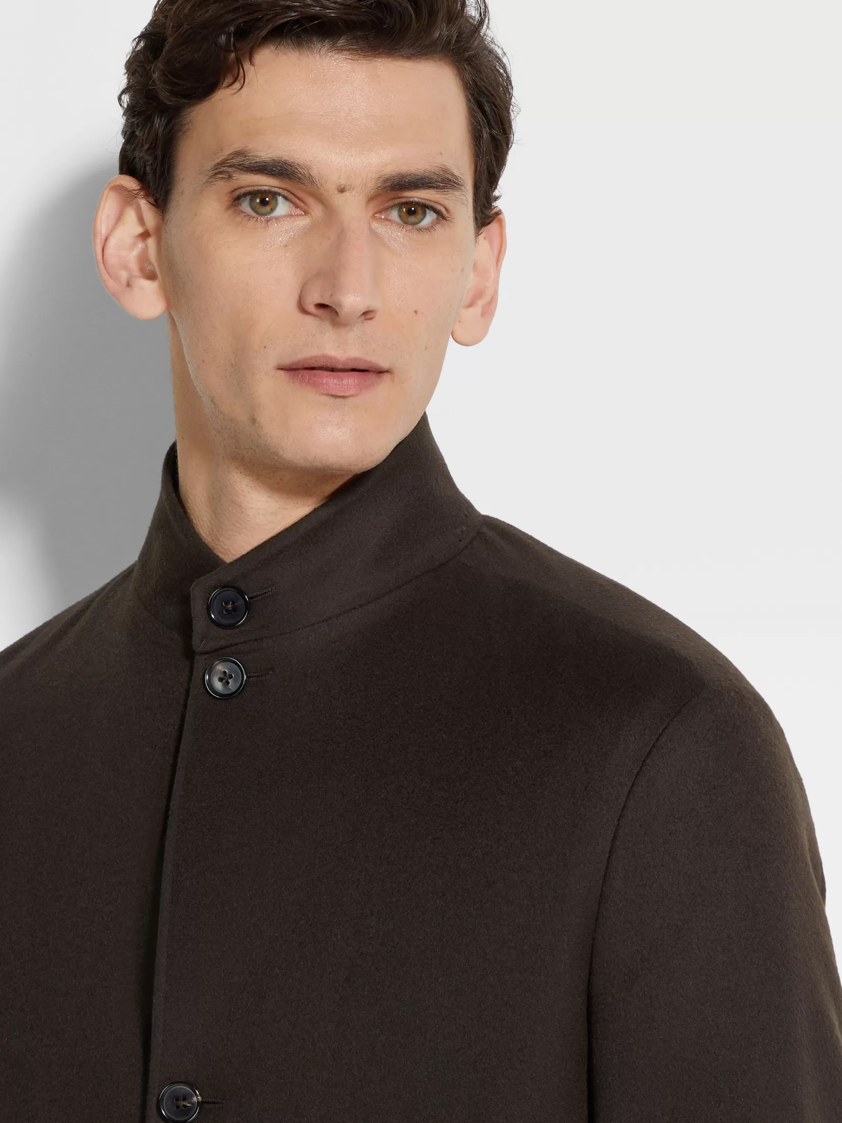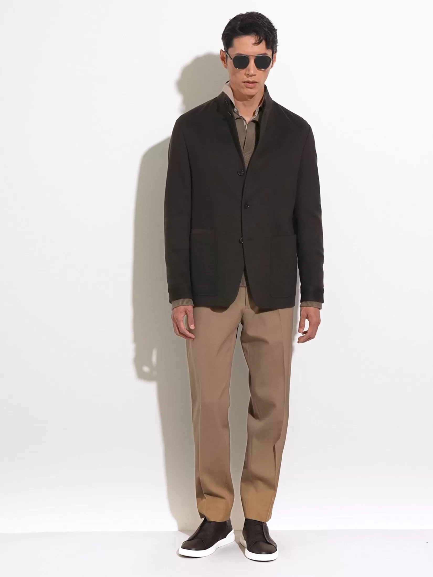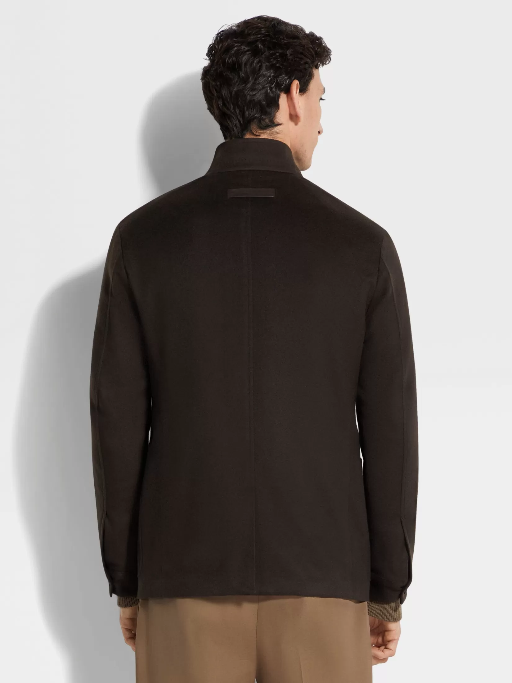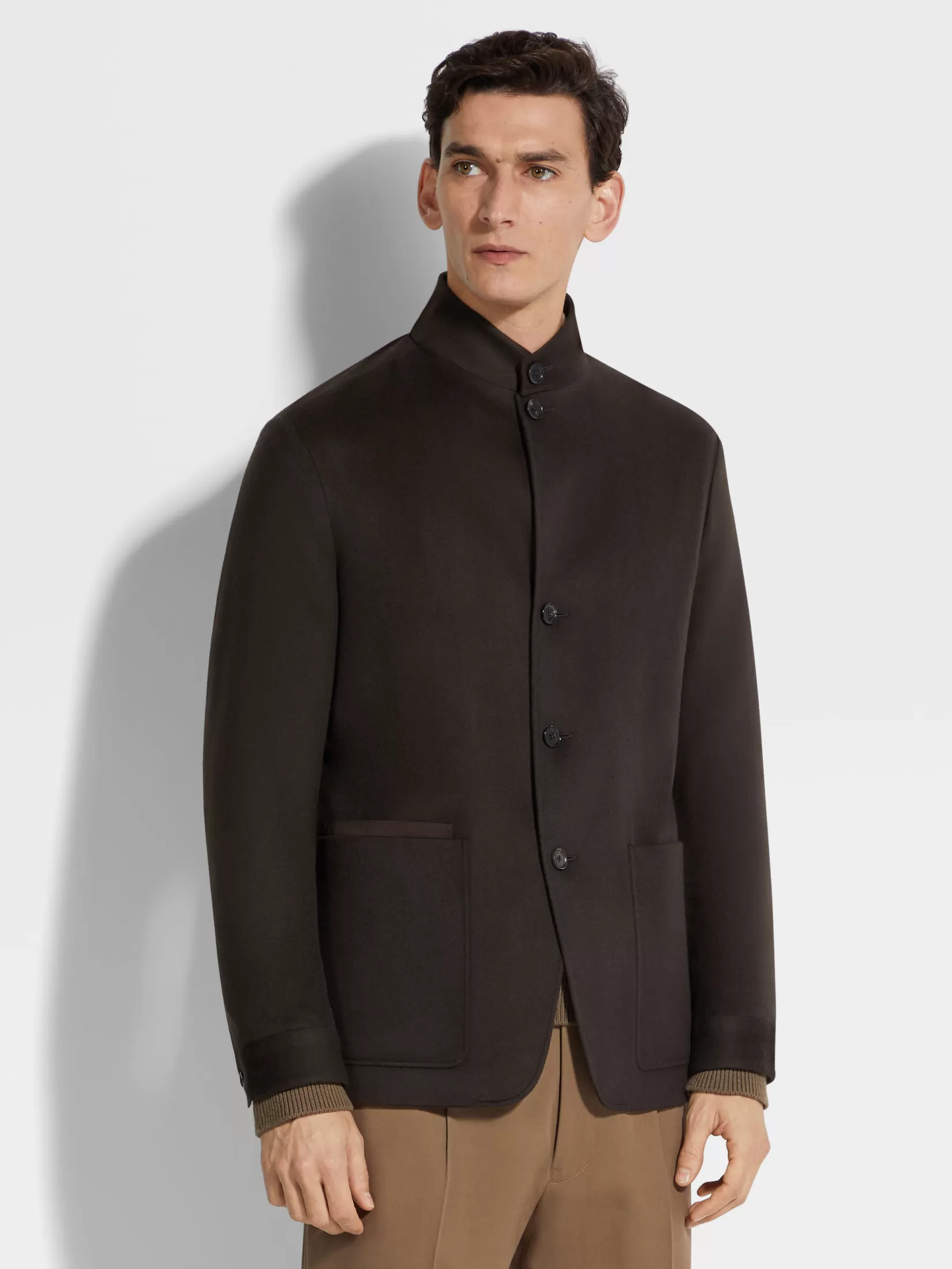 La chaqueta Chore Il Conte marrón oscuro está confeccionada con fibras de cachemira selectas que dan forma al tejido Oasi Cashmere. Su diseño versátil y práctico está acabado con cuello mao. El minibolsillo de piel en la parte derecha y la insignia Zegna 232 Road Brand Mark de piel firman este modelo.