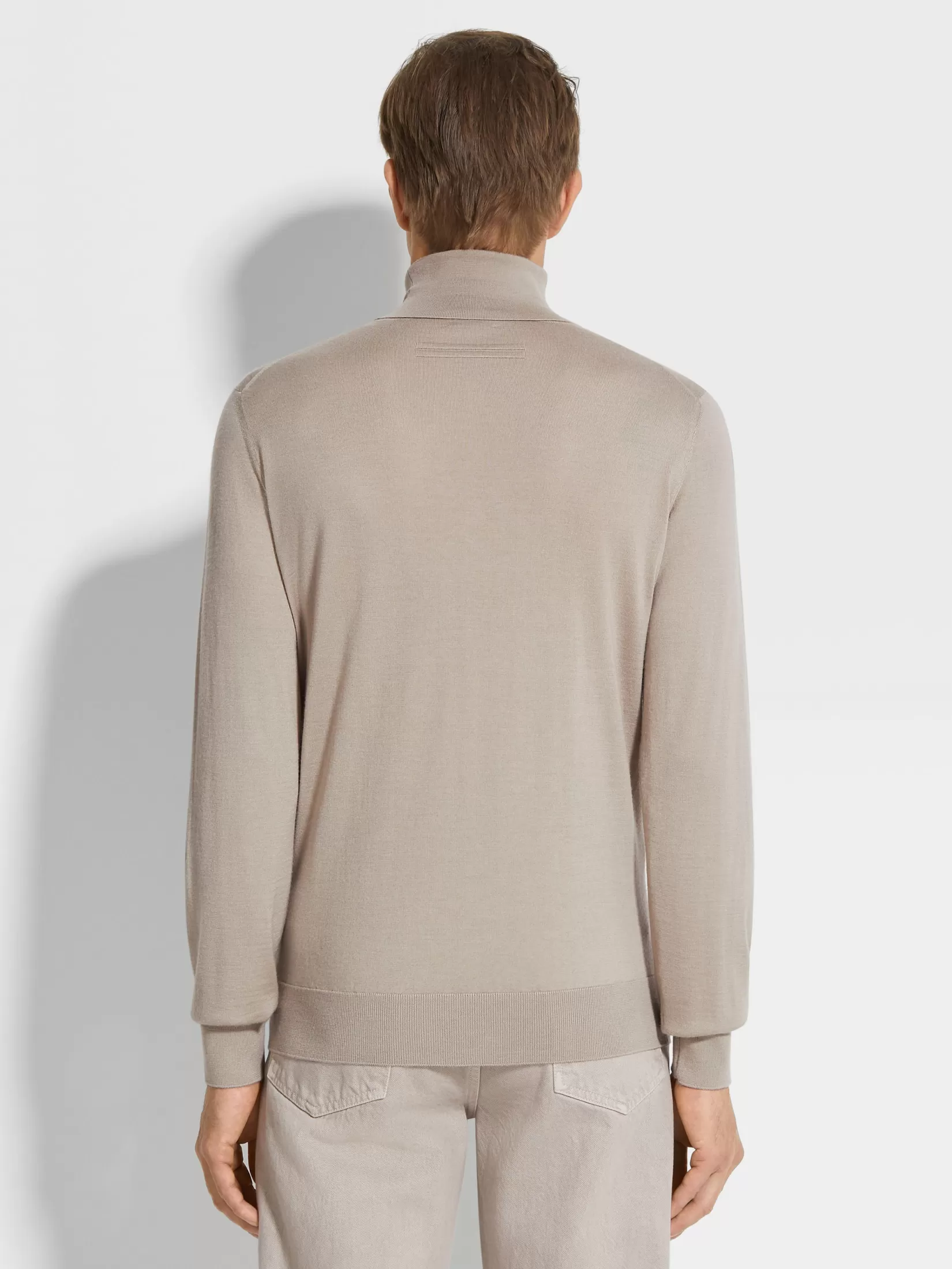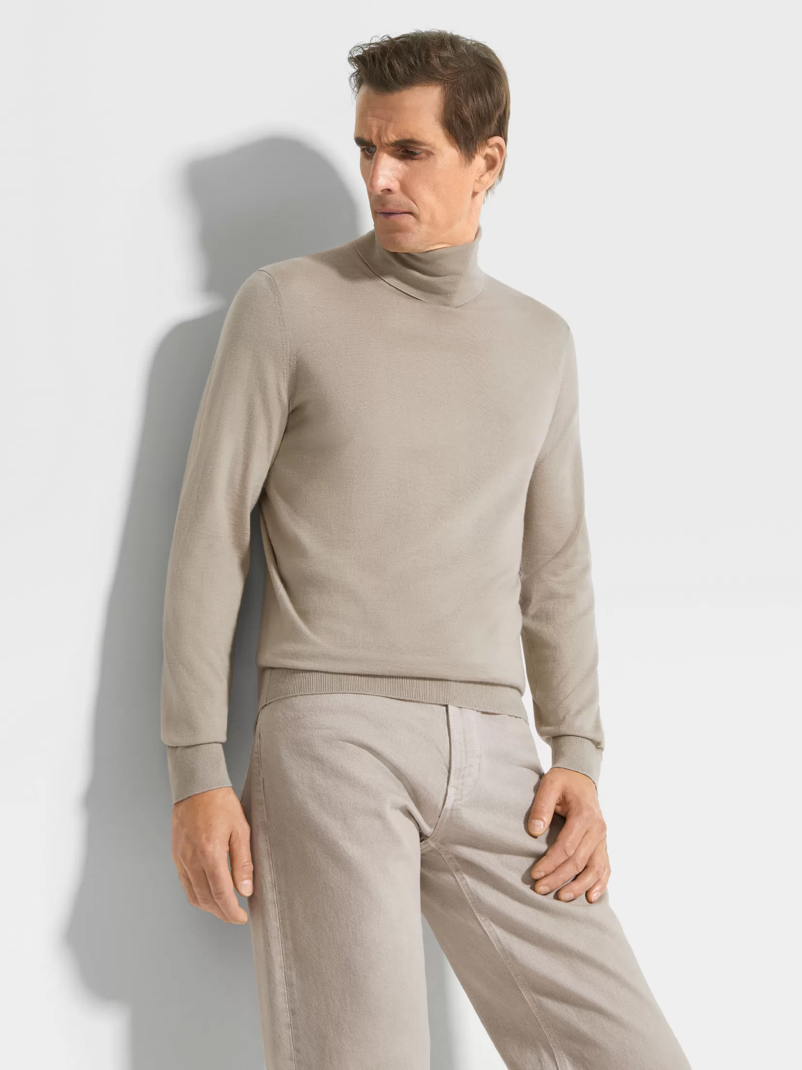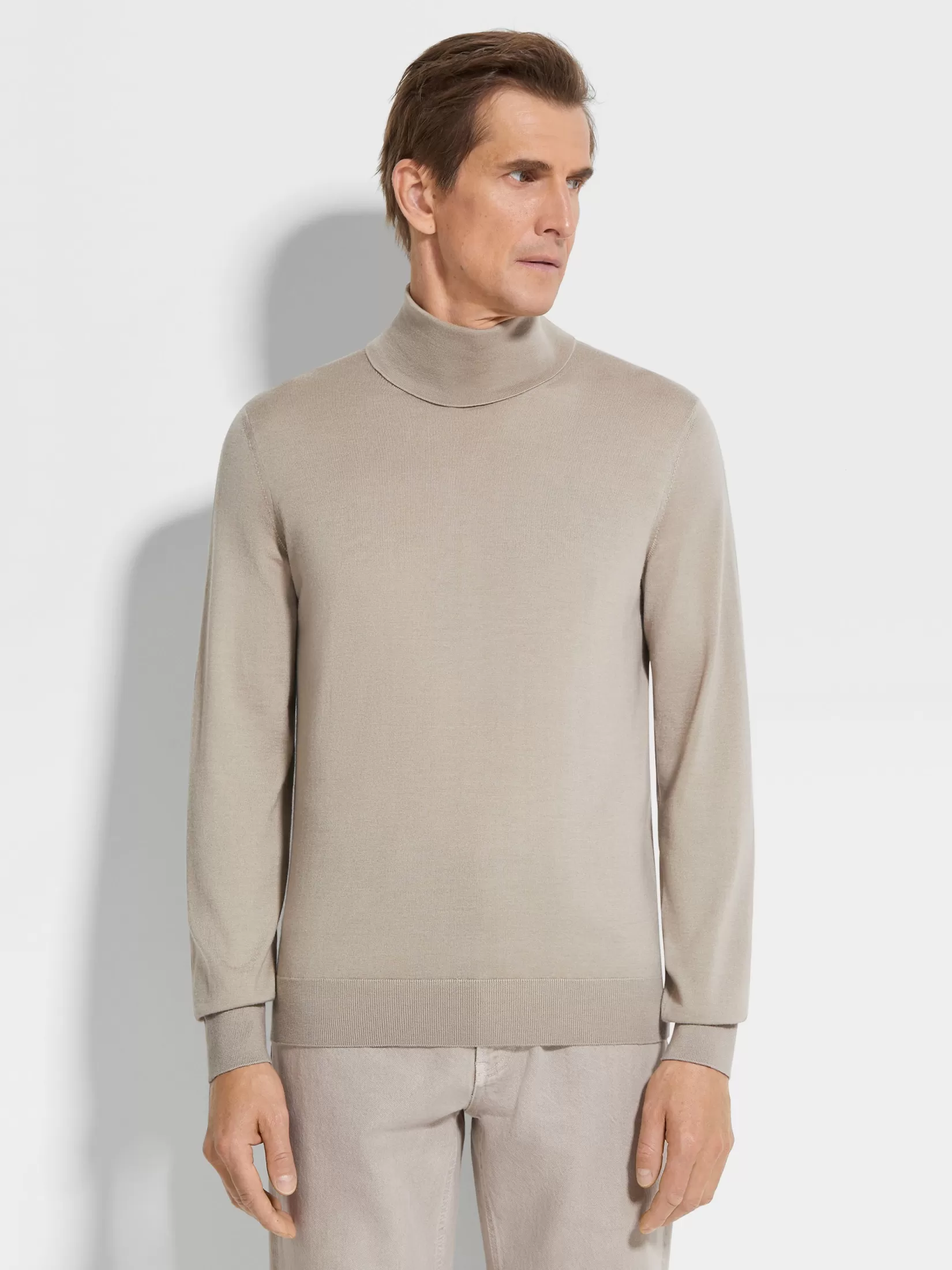La refinada y lujosa mezcla de cachemira y seda de Zegna, Cashseta, otorga a este jersey gris pardo claro de cuello vuelto un acabado distinguido. Este tejido especial se compone de hilo teñido, de modo que crea variaciones sutiles en cada prenda. Este jersey de cuello vuelto tiene unas líneas esbeltas que son ideales para un conjunto de ropa sofisticado.