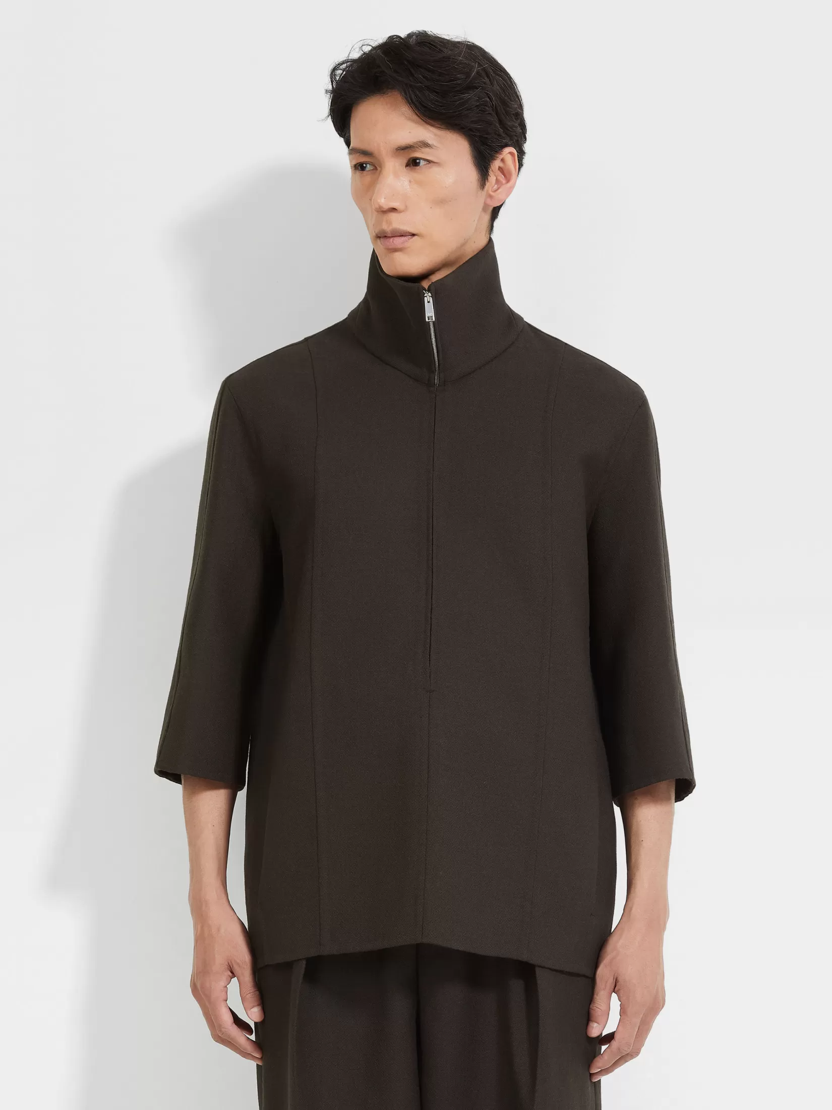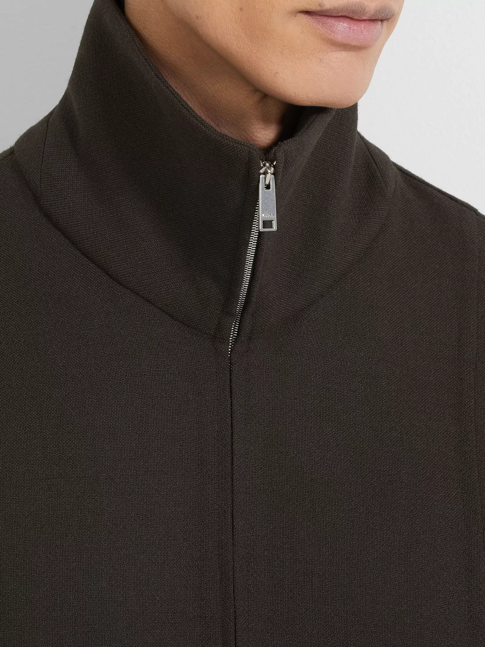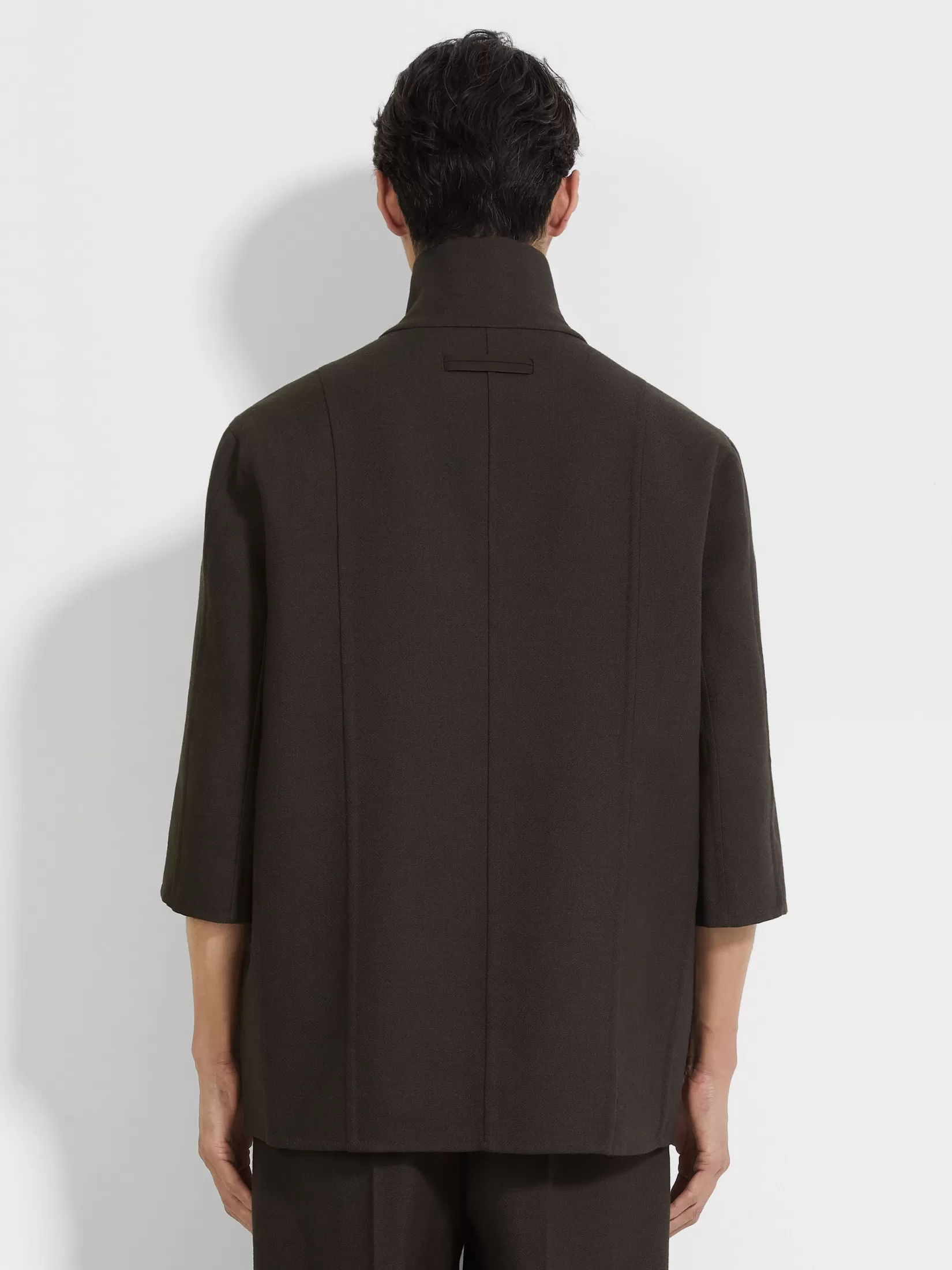 Una confección de lujo convierte esta sobrecamisa marrón oscuro en Trofeo™ Cashmere en un básico elegante de la ropa informal. La sobrecamisa está acabada con un cuello mao alto que se complementa con el cierre de cremallera y su diseño esbelto. Esta sobrecamisa se presentó en el desfile de Zegna y luce la insignia Zegna 232 Road Brand Mark en forma de parche de piel por detrás.
