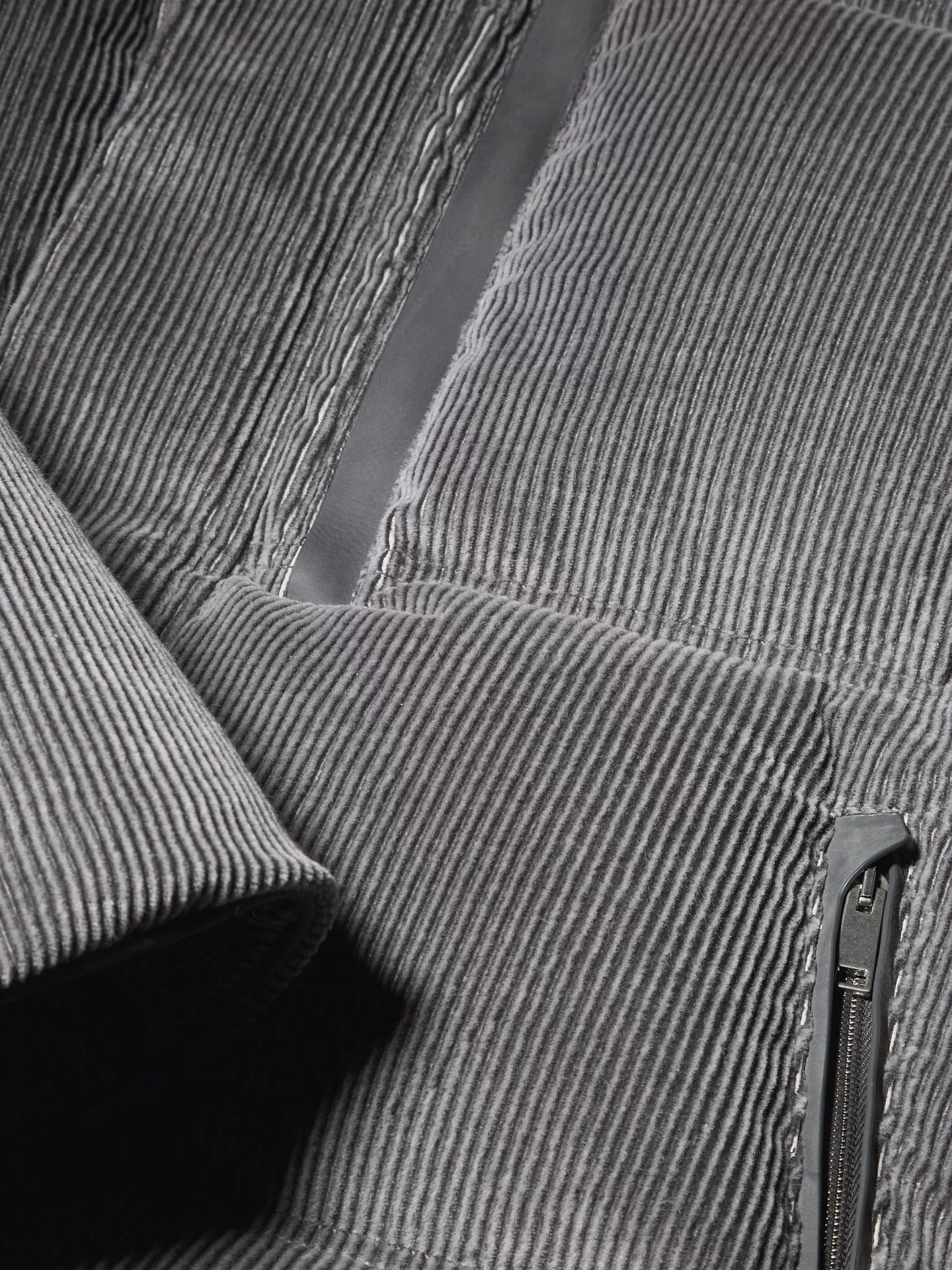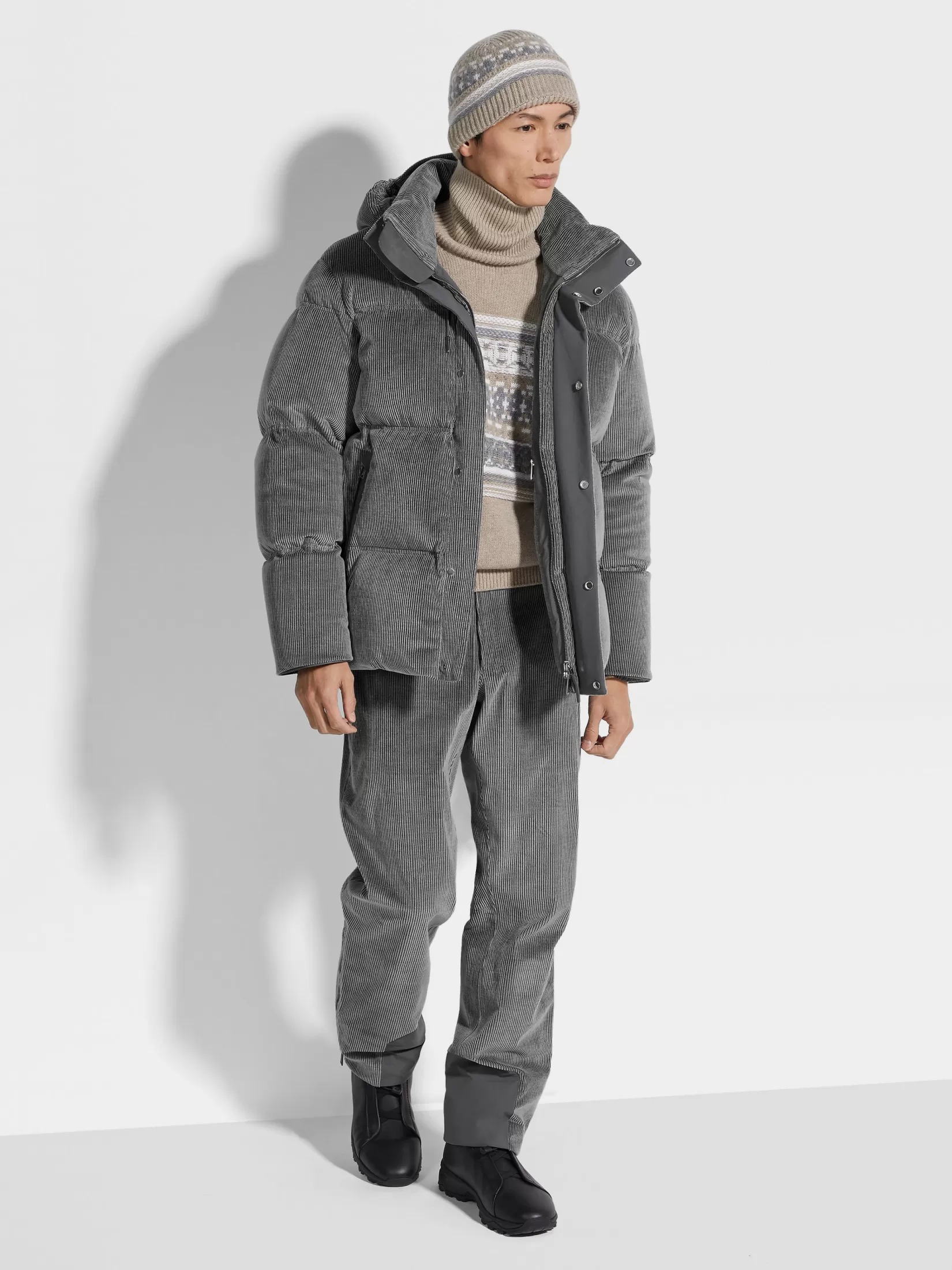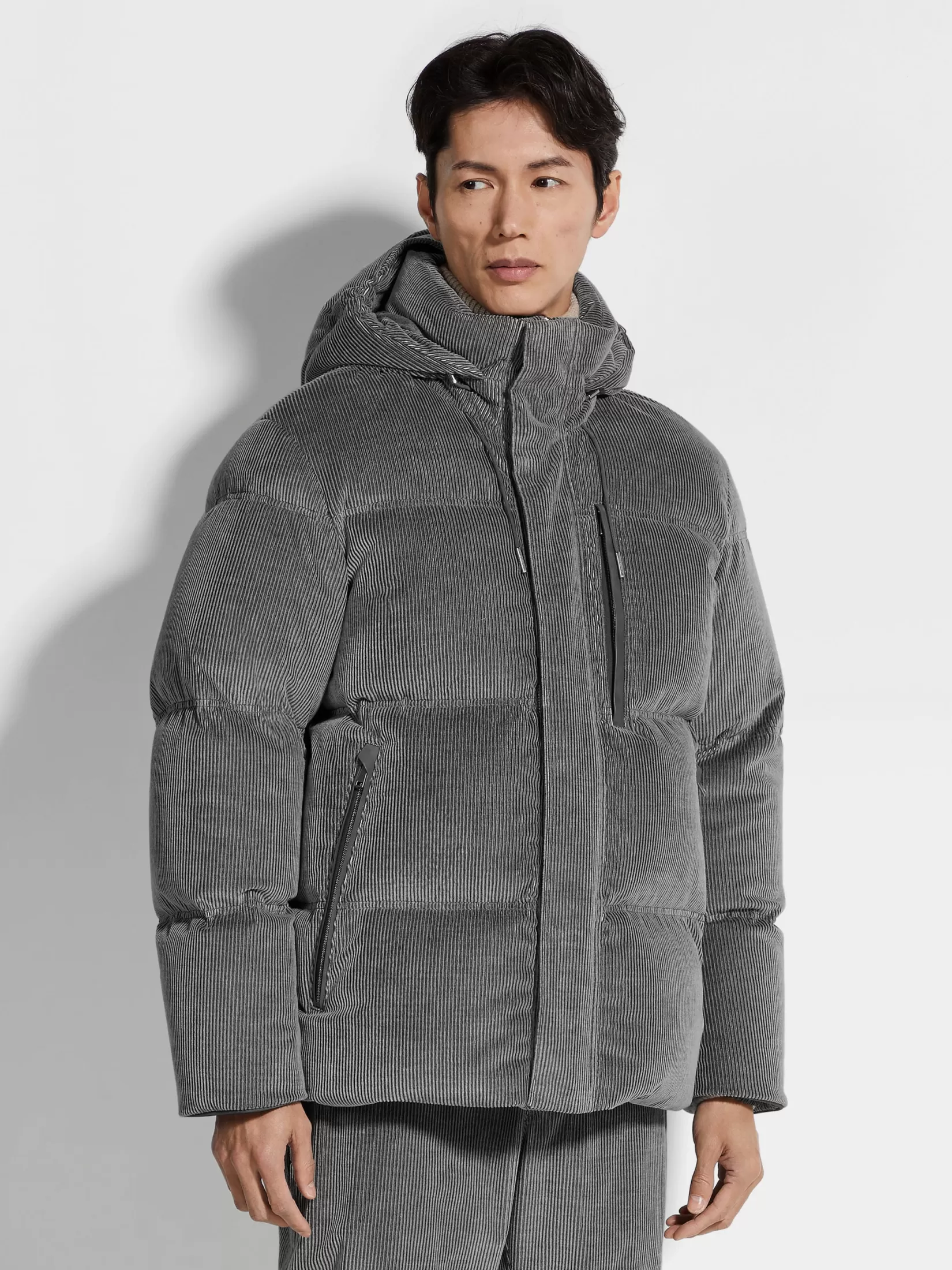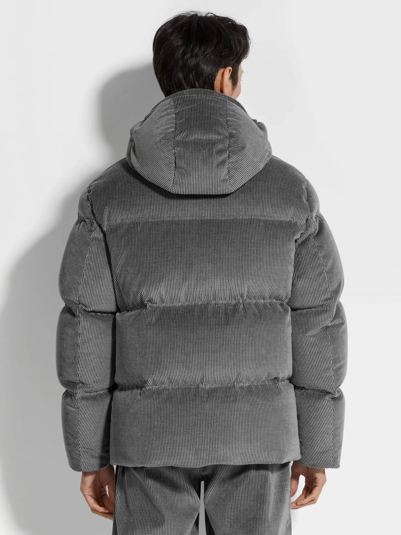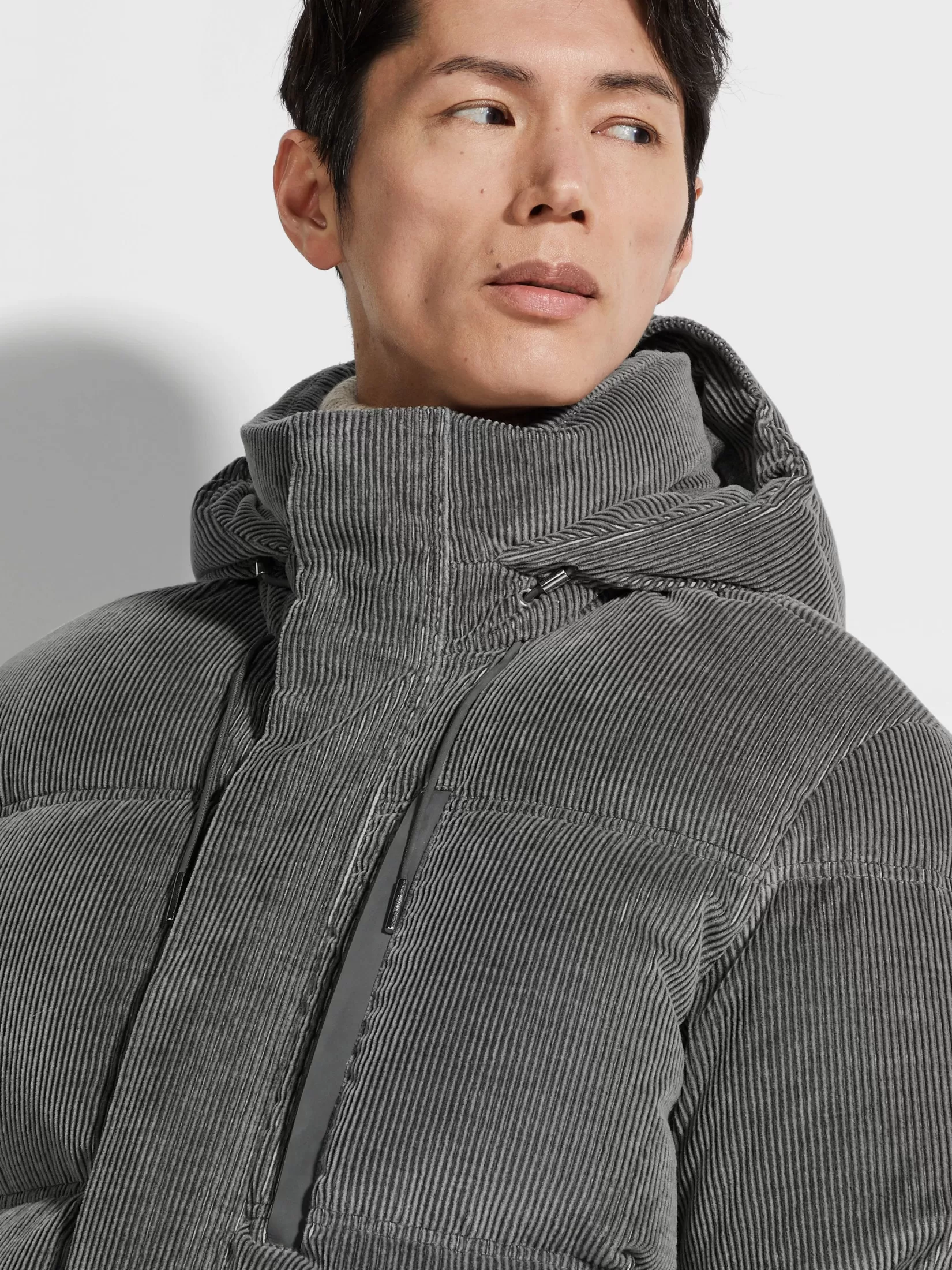 La parte externa, suave y acanalada, de esta chaqueta fina en Cashco gris mixto se combina con prestaciones avanzadas: es impermeables, resistente al viento y está acolchada con plumón de oca y plumas. Esta chaqueta con cremallera tiene una capucha, cordones en el bajo y puños regulables. Los detalles de piel realzan sus líneas deportivas.