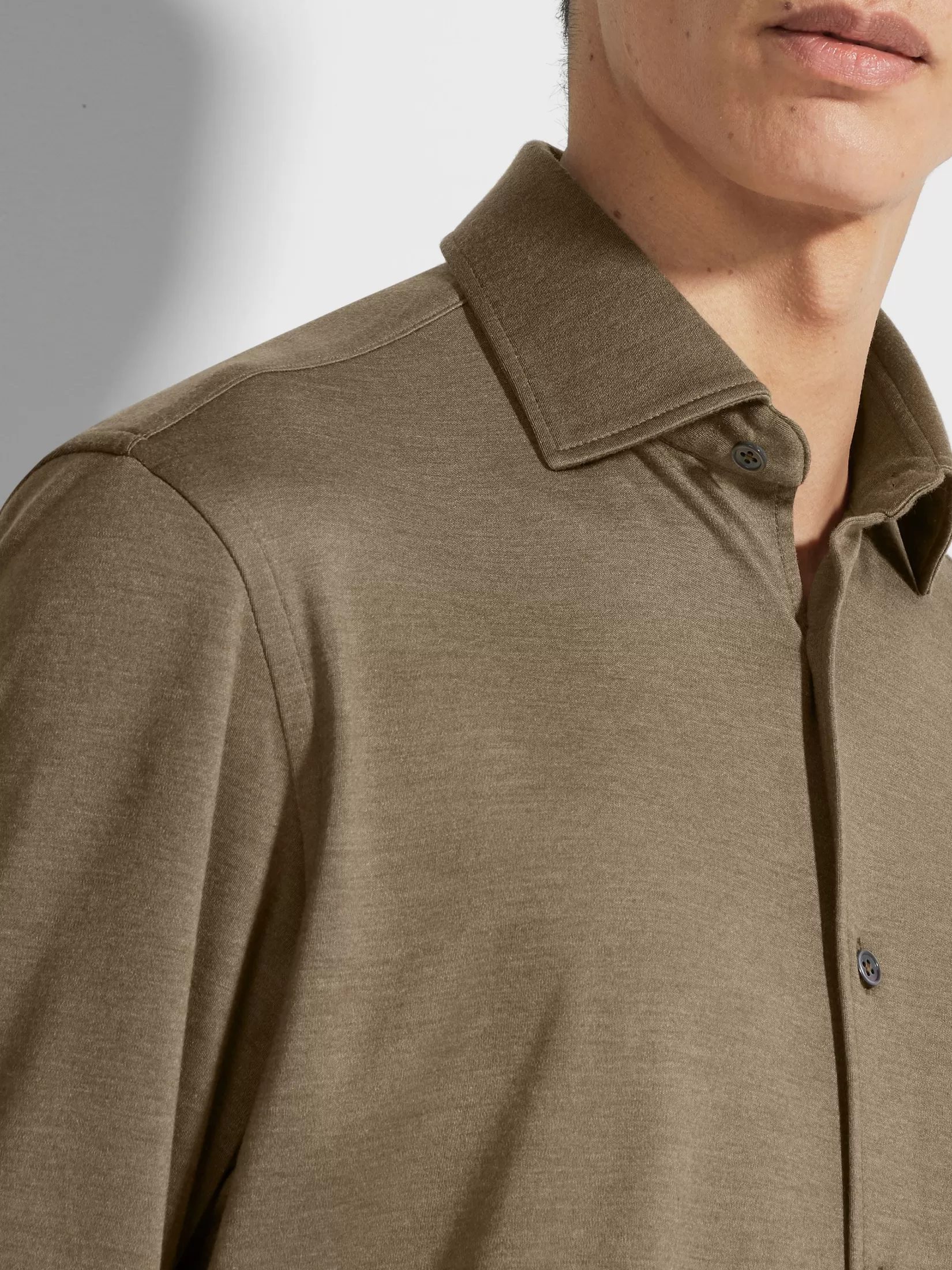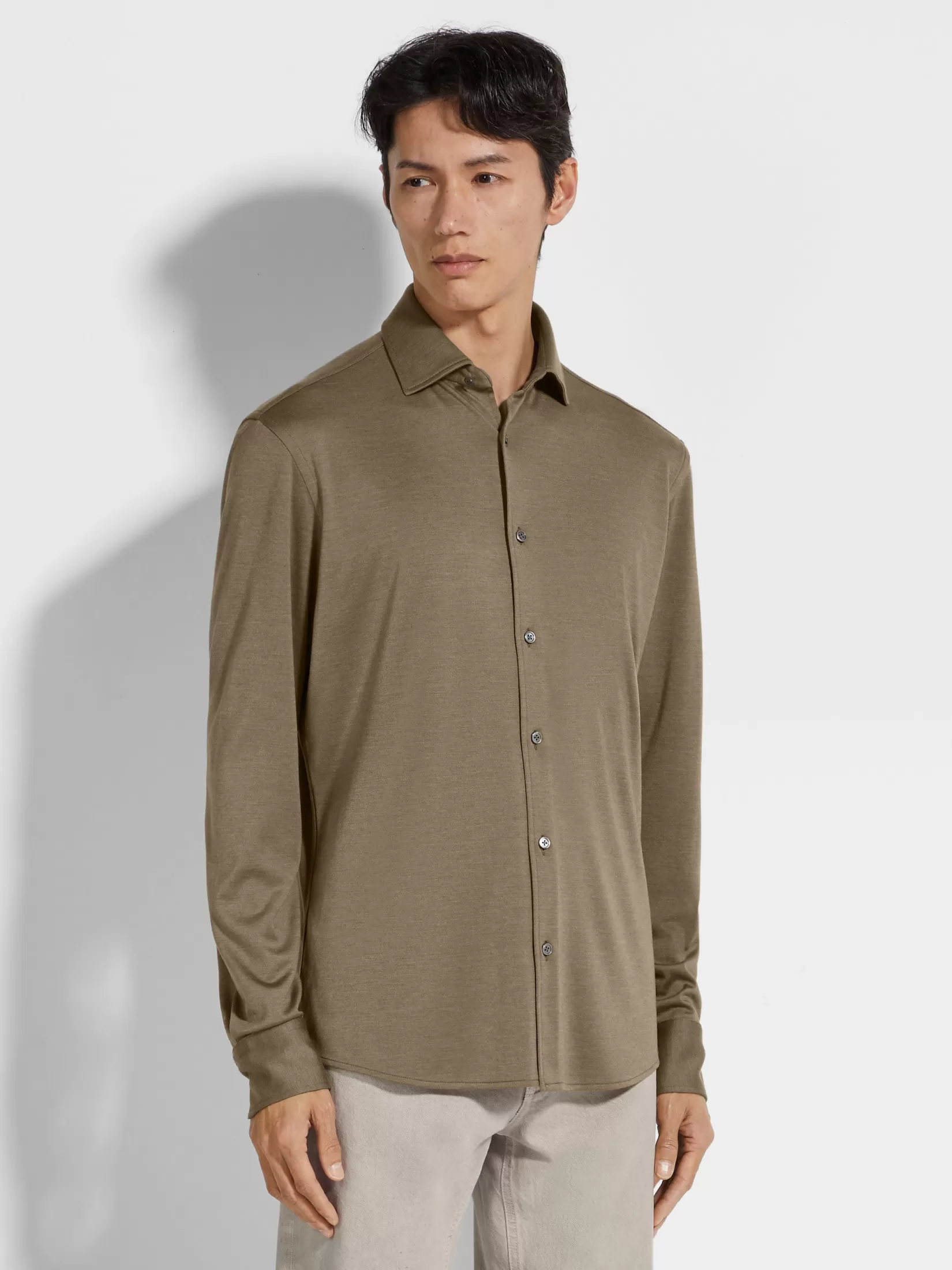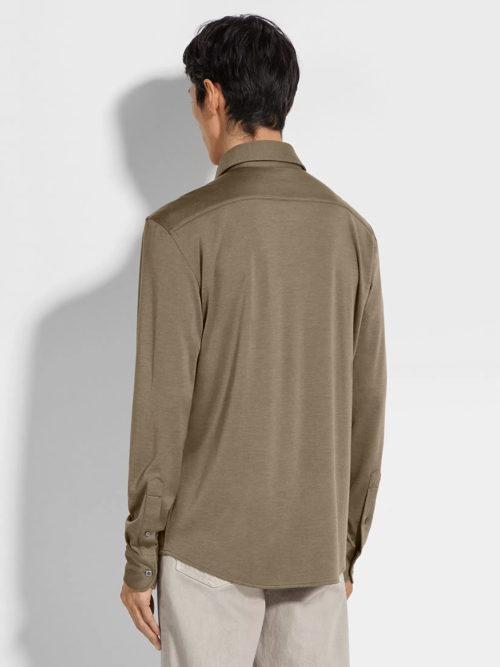 Los tejidos de lujo marcan la diferencia en la ropa informal pero elegante, como en esta camisa caqui oscuro que combina la bonita cachemira y la seda ligera en un diseño cómodo. Esta camisa de manga larga está acabada con el clásico cuello y los puños de camisa.