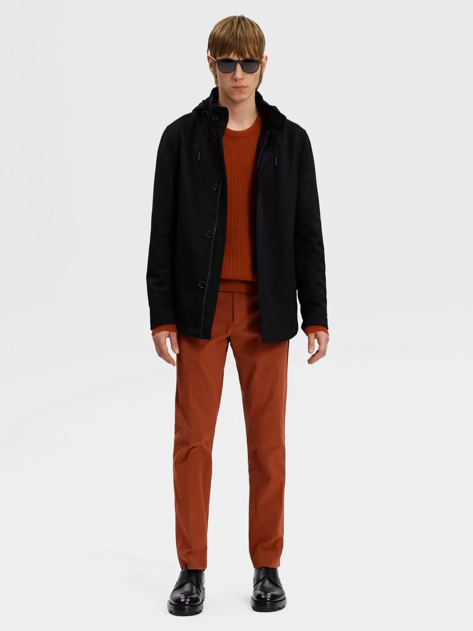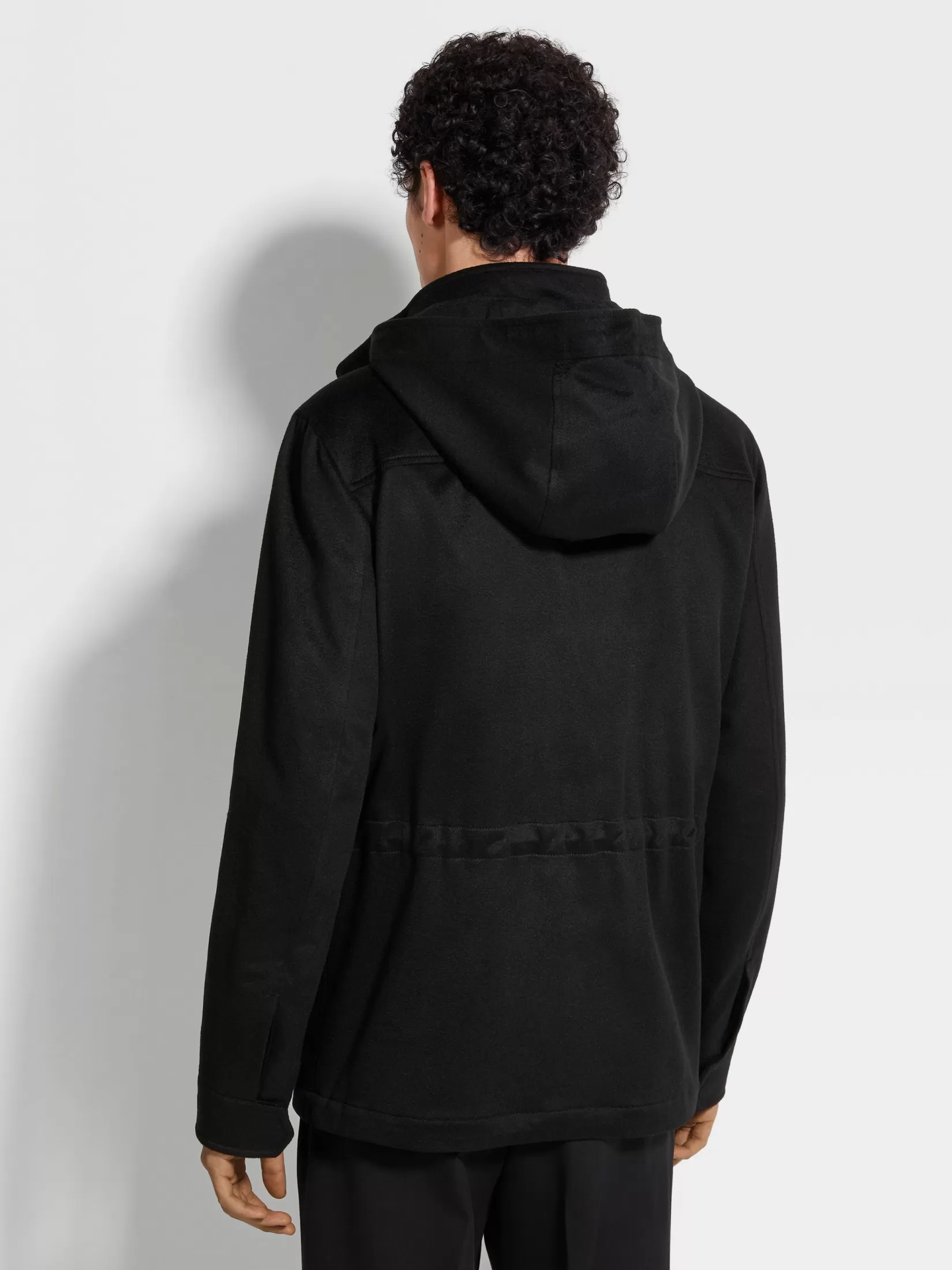El sobretodo Cima en negro está confeccionado con el innovador tejido de Zegna, Oasi Cashmere Elements, que se compone de cachemira exclusiva y una membrana impermeable, por lo que resiste al clima inclemente. Su acabado suave le regala un estilo elegante y listo para sus aventuras. El cuello mao con capucha, los bolsillos ribeteados y los detalles en piel complementan su esbelto diseño.
