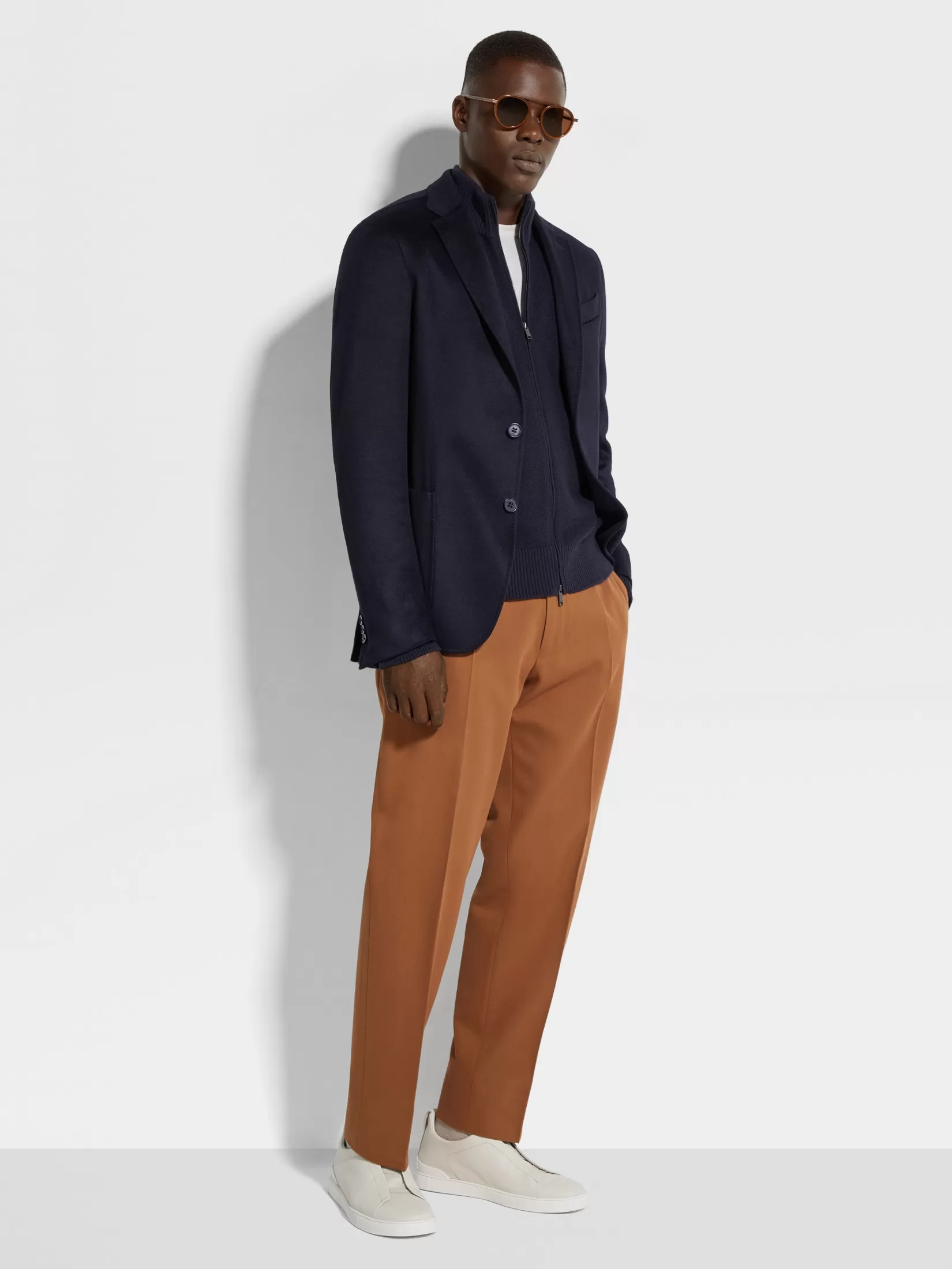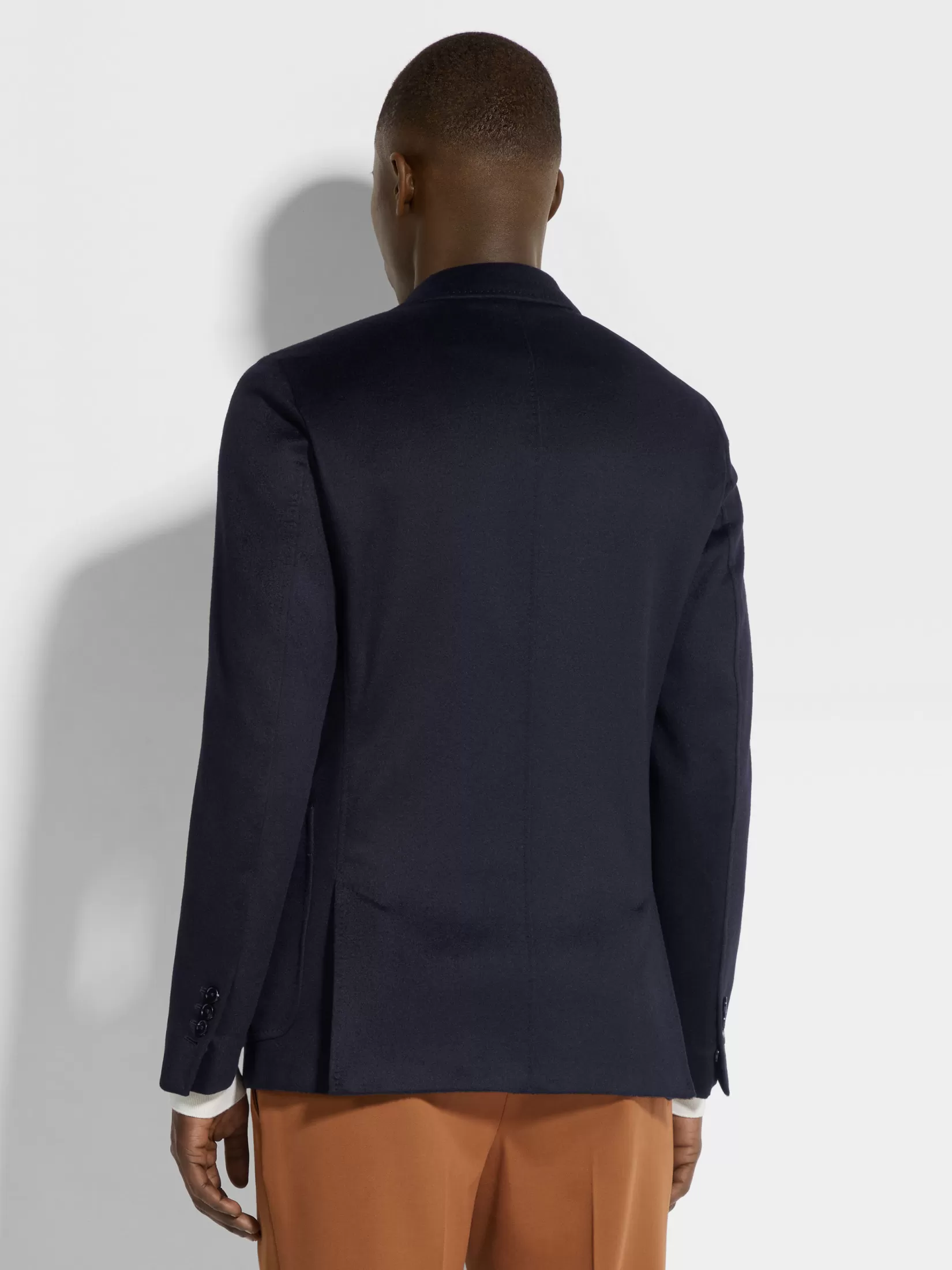 La chaqueta en Oasi Cashmere azul marino es la última creación de la amplia gama de ropa elegante para hombre. El corte entallado de esta chaqueta le brinda unas líneas esbeltas que se adaptan a un conjunto informal pero elegante. Los detalles de piel y los bolsillos de parche completan este modelo.
