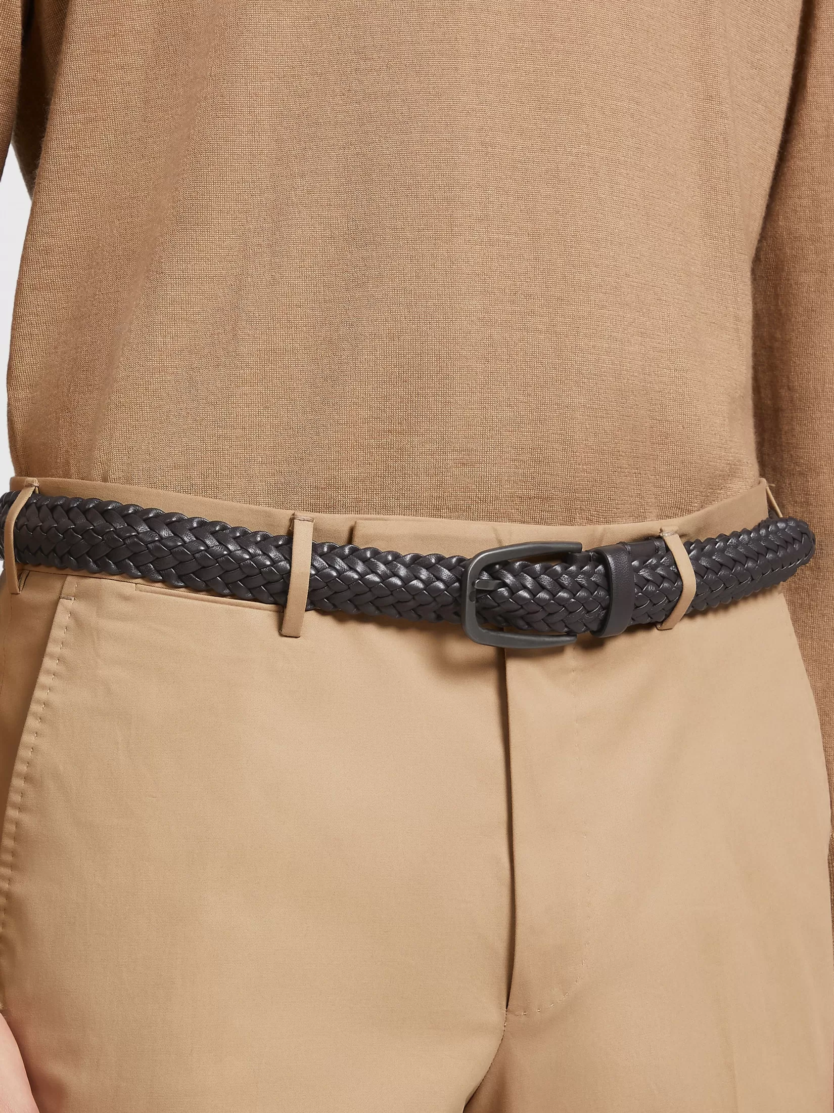 Este cinturón marrón oscuro trenzado es una opción clásica que resalta la belleza natural de la piel de cordero de alta calidad. La hebilla de metal con acabado PVD cepillado en negro aporta un toque moderno.