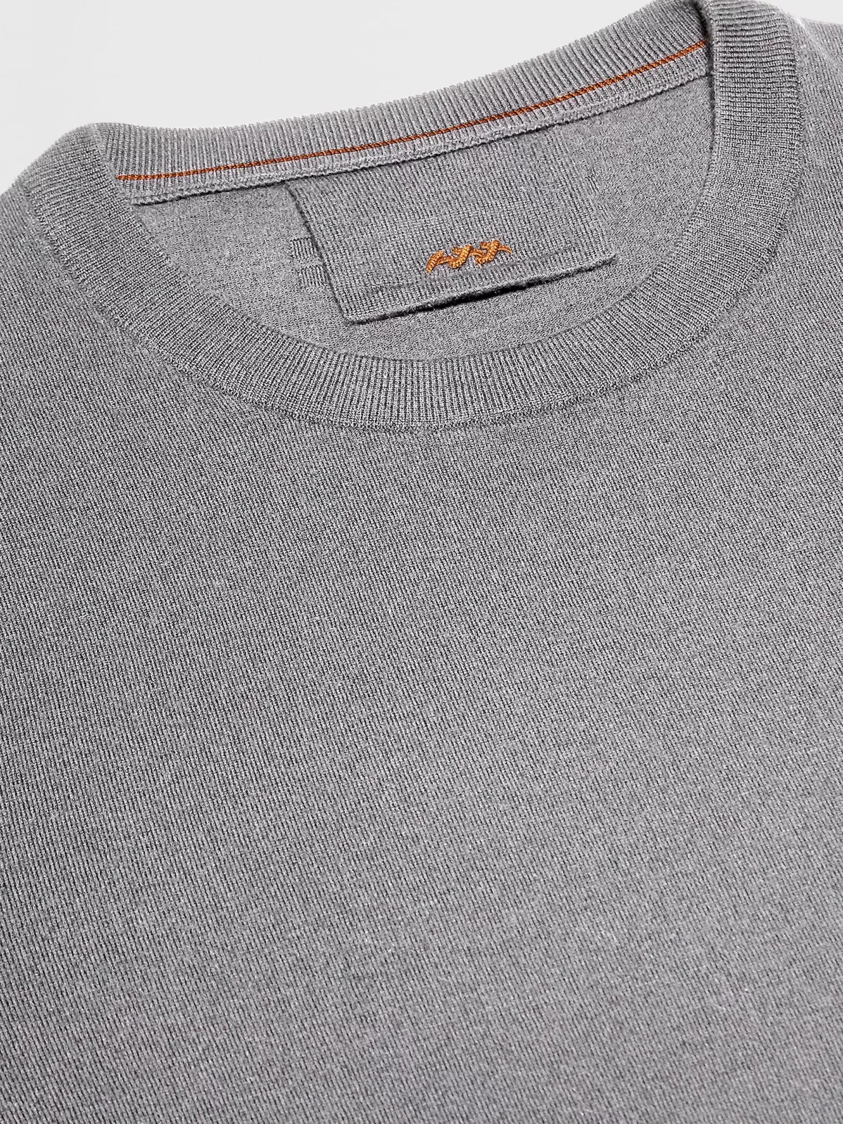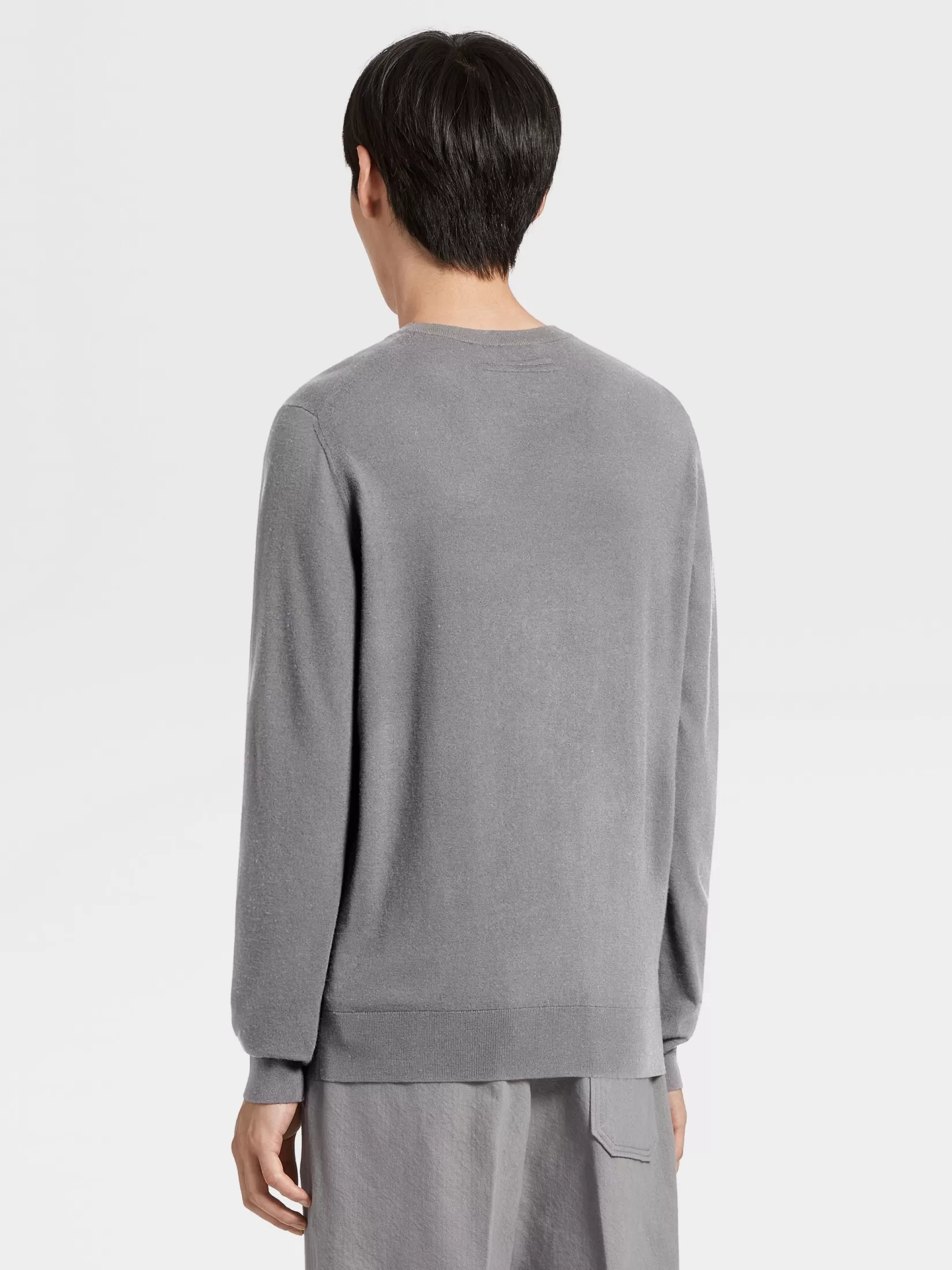 Combinando una línea clásica y simple con lana 12milmil12 superfina, el jersey de cuello redondo gris oscuro es desenfadadamente sofisticado. El borde acanalado enmarca la construcción lujosamente suave, mientras que el corte entallado lo mantiene estructurado y dinámico.