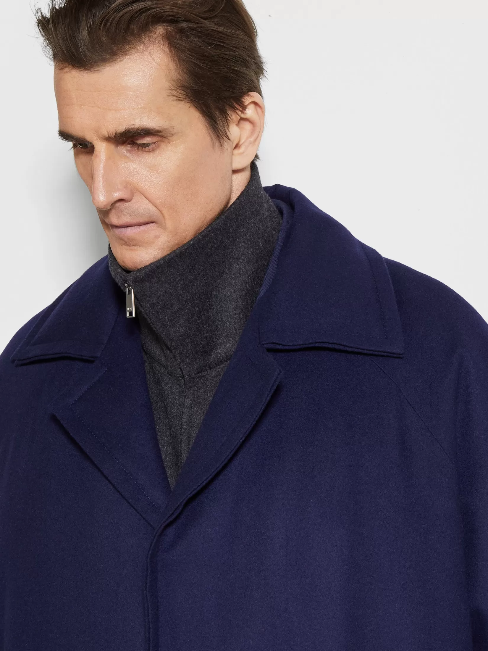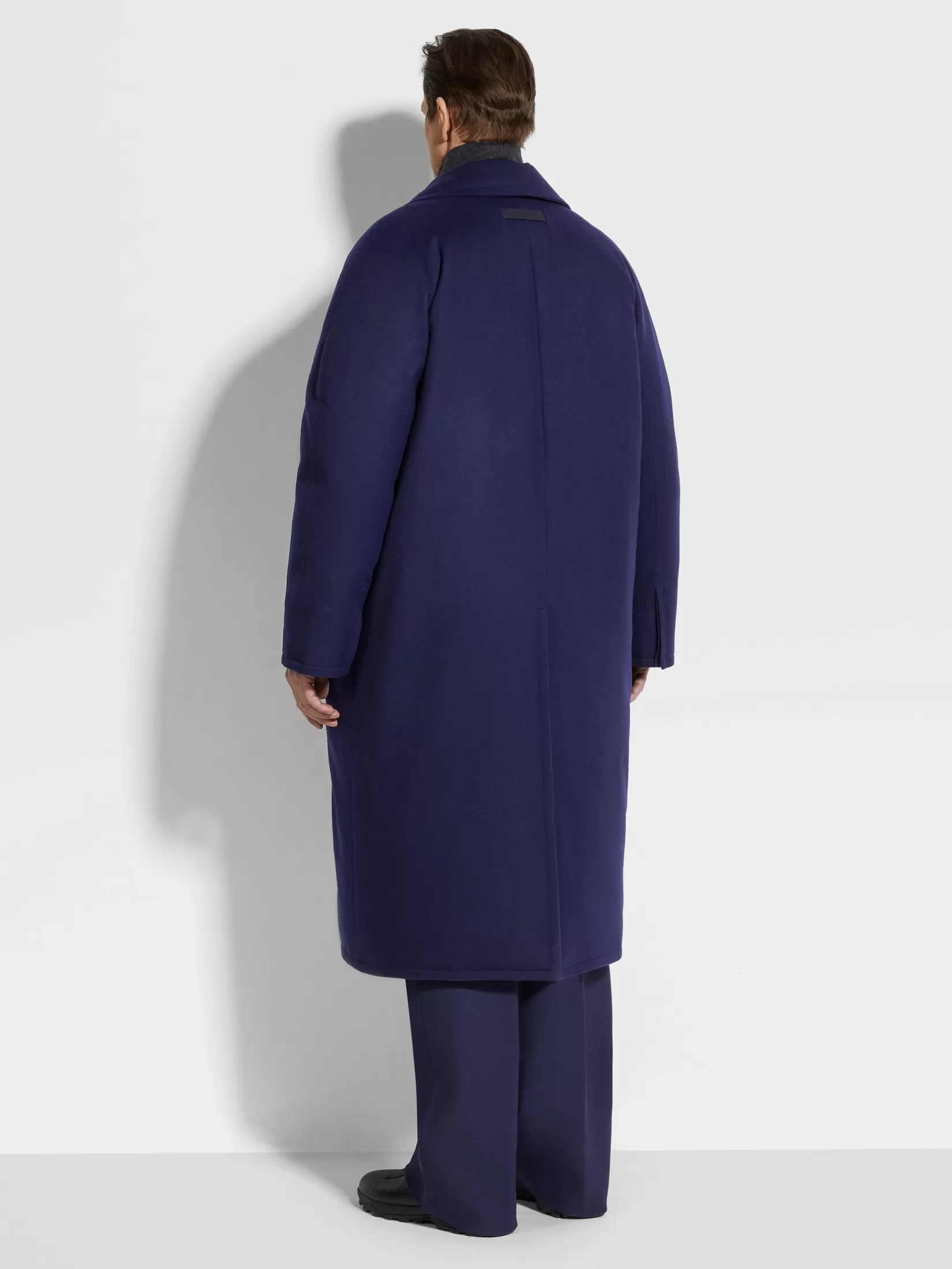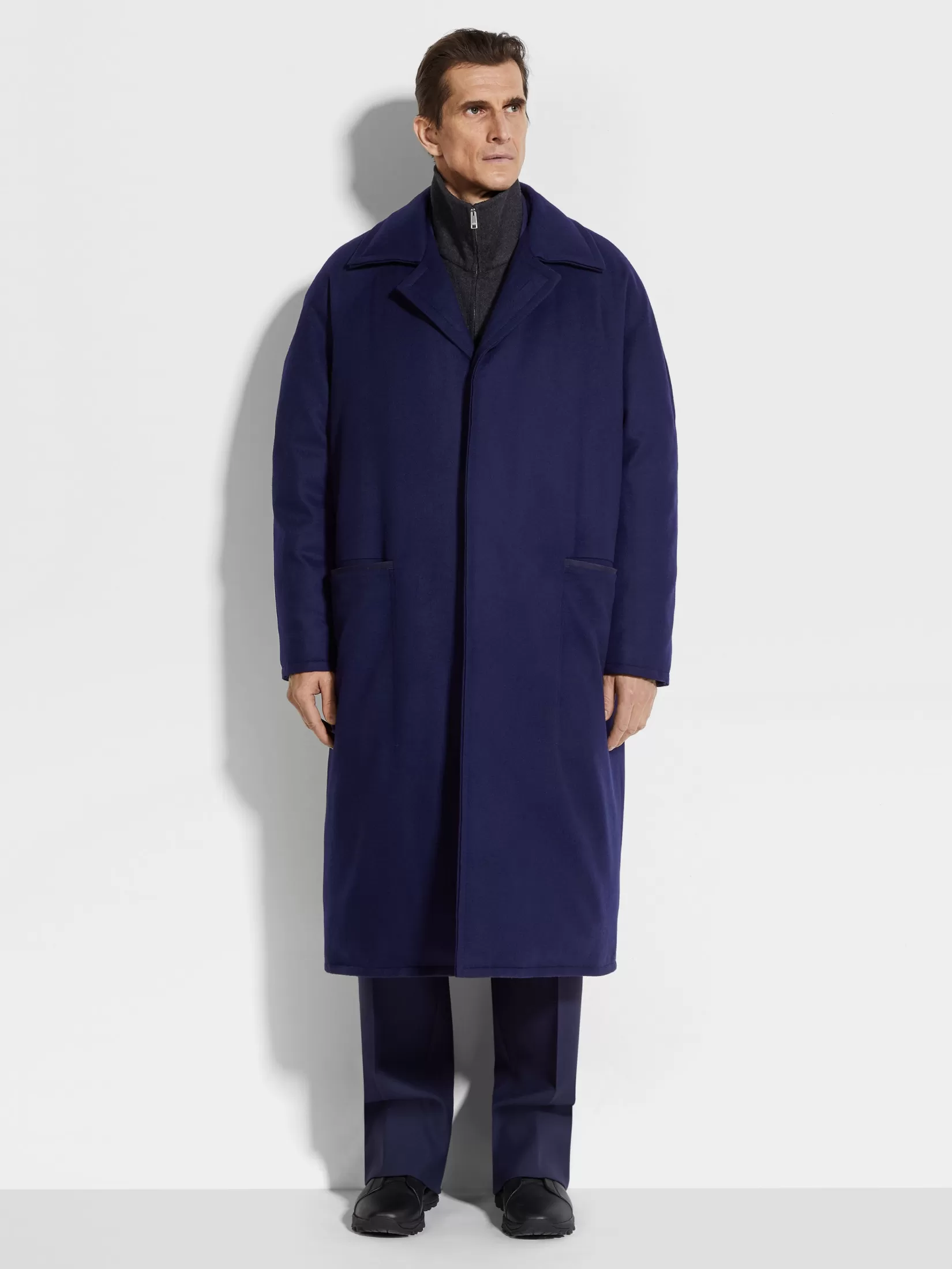 Presentado en el desfile de Zegna, este abrigo azul tinta en Oasi Cashmere Elements refleja el compromiso de la marca con la innovación en el sector textil de lujo. Este tejido avanzado de cachemira se combina con el acolchado de plumón de oca y plumas para abrigarle mejor. El abrigo está acabado con una tapeta frontal con los botones ocultos y detalles de piel.