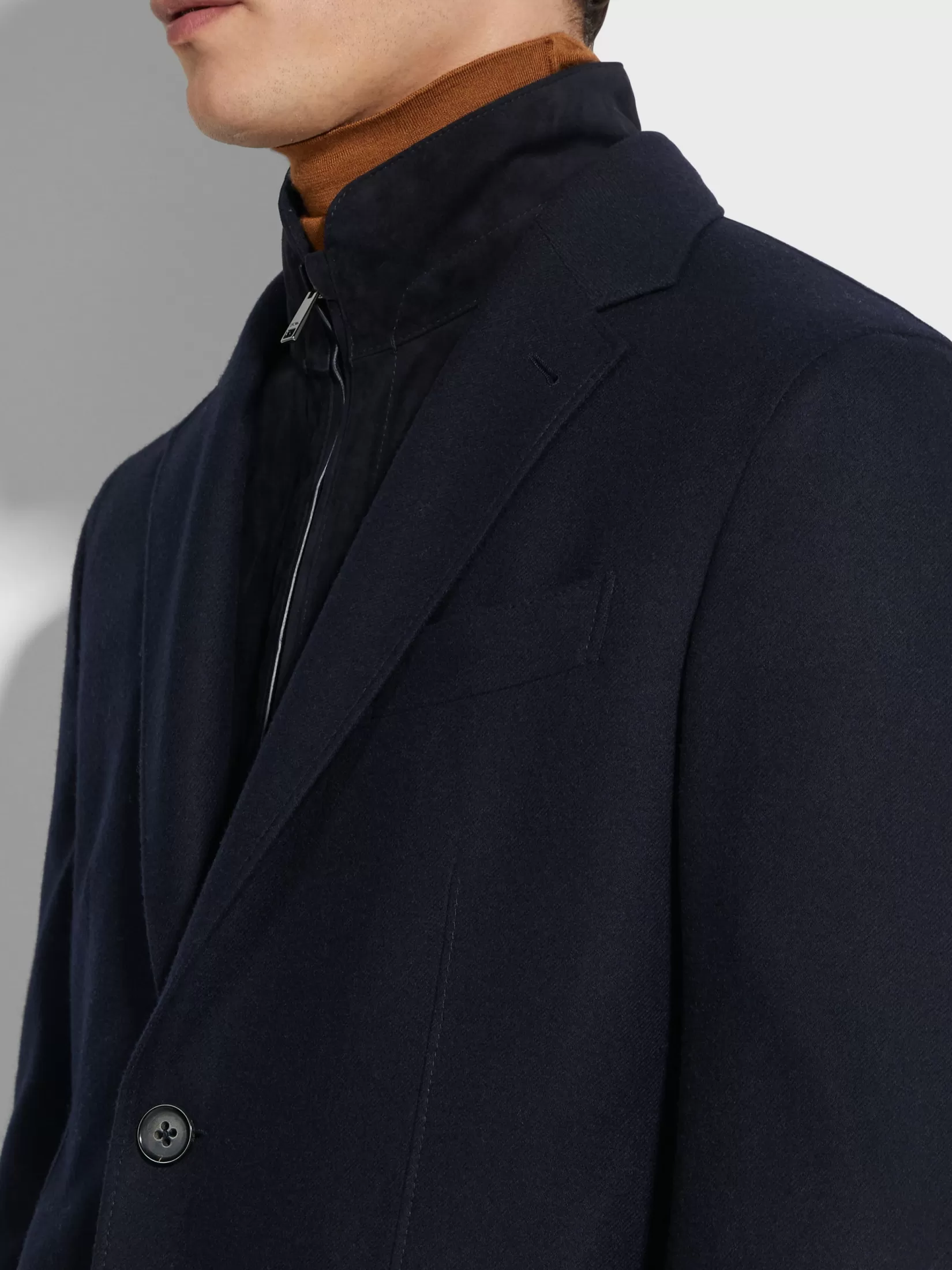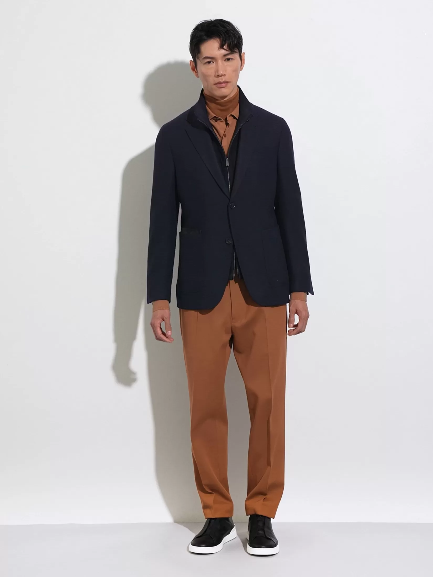 La lana merino australiana, propiedad de Zegna, brilla en esta chaqueta azul marino, confeccionada en Trofeo™ Cashmere. Sus fibras extralarga y resistentes se mezclan con una pizca de cachemira para conseguir un resultado más suave y brillante. Esta versátil chaqueta está acabada con un corte entallado, bolsillos de parche y una pechera removible.