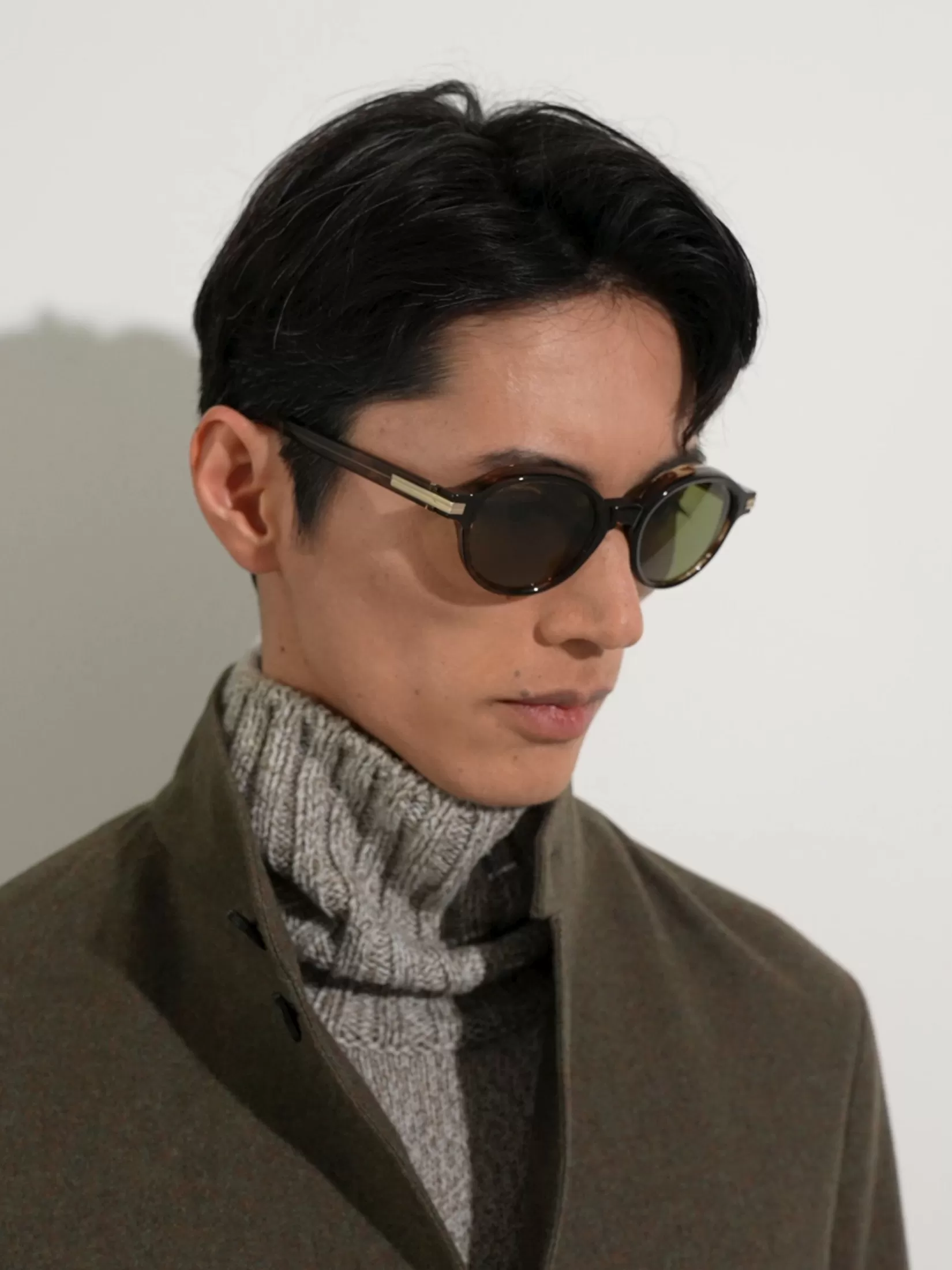 Las gafas de sol en acetato marrón oscuro habana transparente exhiben una montura brillante con puente simple. Los volúmenes redondeados en el frente añaden profundidad y las almohadillas adherentes en los terminales le proporcionan un ajuste firme. El logo Zegna 232 Road Brand Mark en las esquinas regala un toque distinguido, mientras que la combinación de materiales y formas brinda a esta montura un estilo moderno y espectacular.