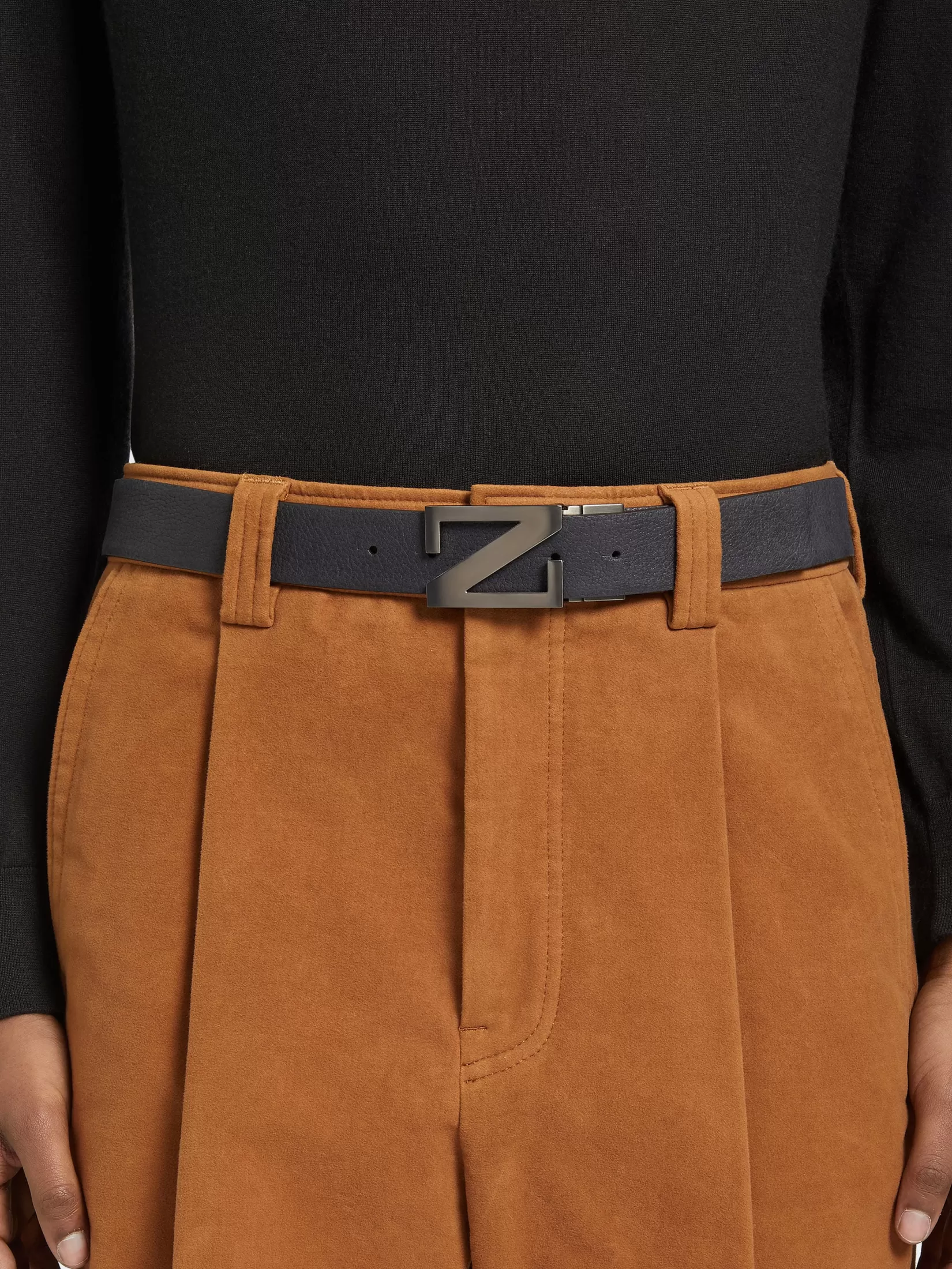 Este cinturón se puede combinar con cualquiera de sus conjuntos, con un lado en piel de color negro y el otro en piel martillada de color azul marino. Puede elegir el color y la textura que prefiera para complementar cualquiera de sus pantalones. La hebilla Zegna Monogram, esmaltada en ultranegro, acaba este modelo.