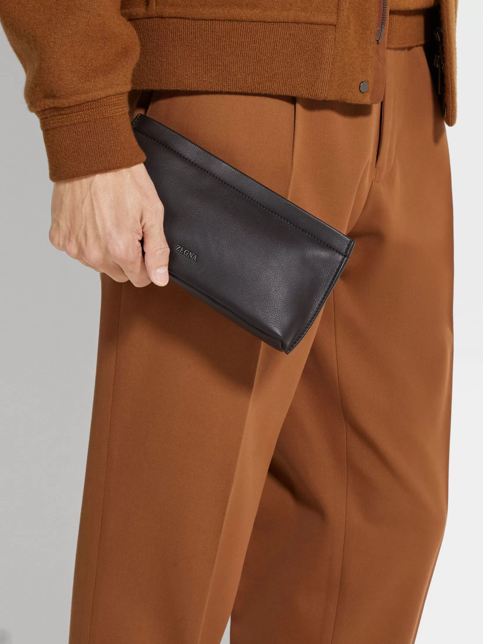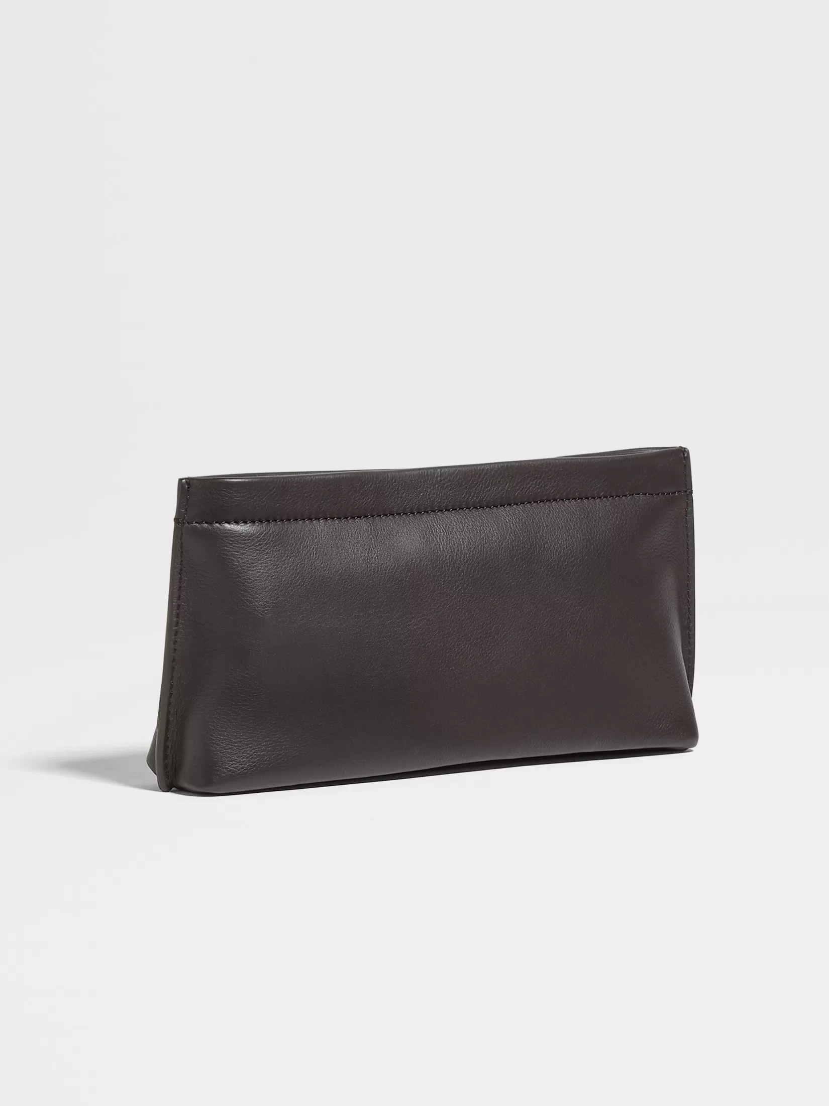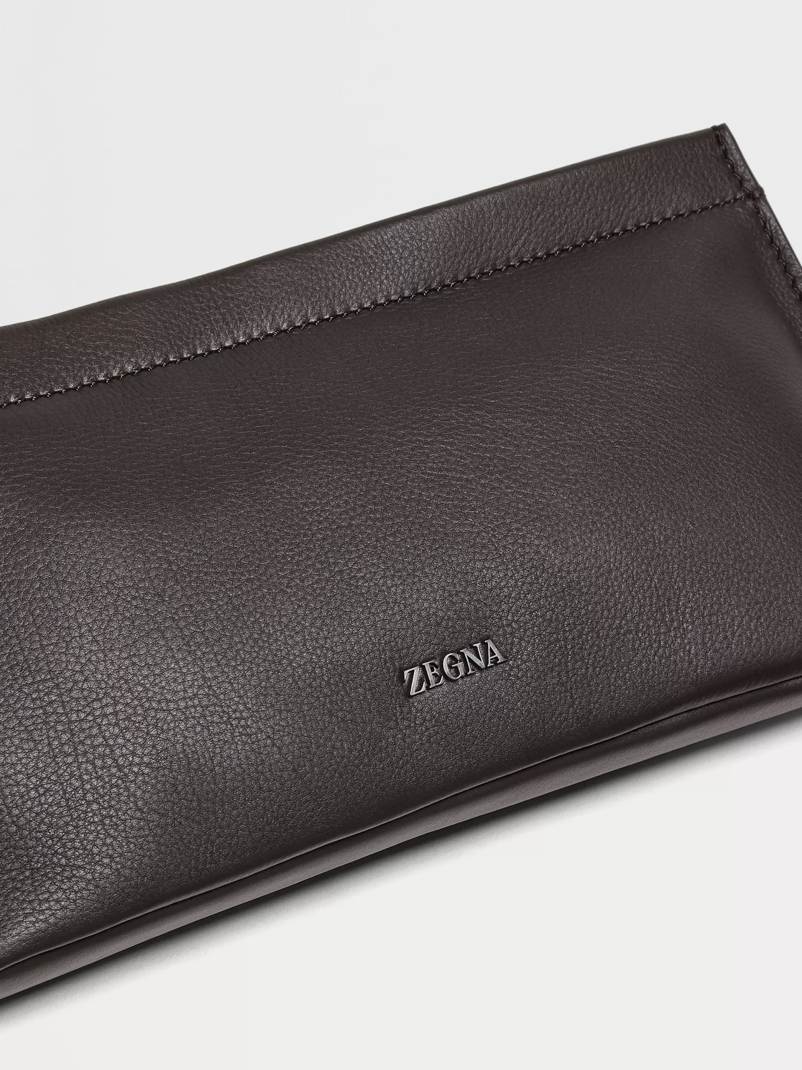 Gracias a su parte externa flexible y resistente, esta cartera de mano pequeña en SECONDSKIN marrón oscuro se adapta a cualquier situación. Su diseño vertical mantiene sus objetos personales protegidos. Está forrada en algodón y su confección en piel de becerro suave está acabada con los detalles pulidos en ultranegro y el logo Zegna.