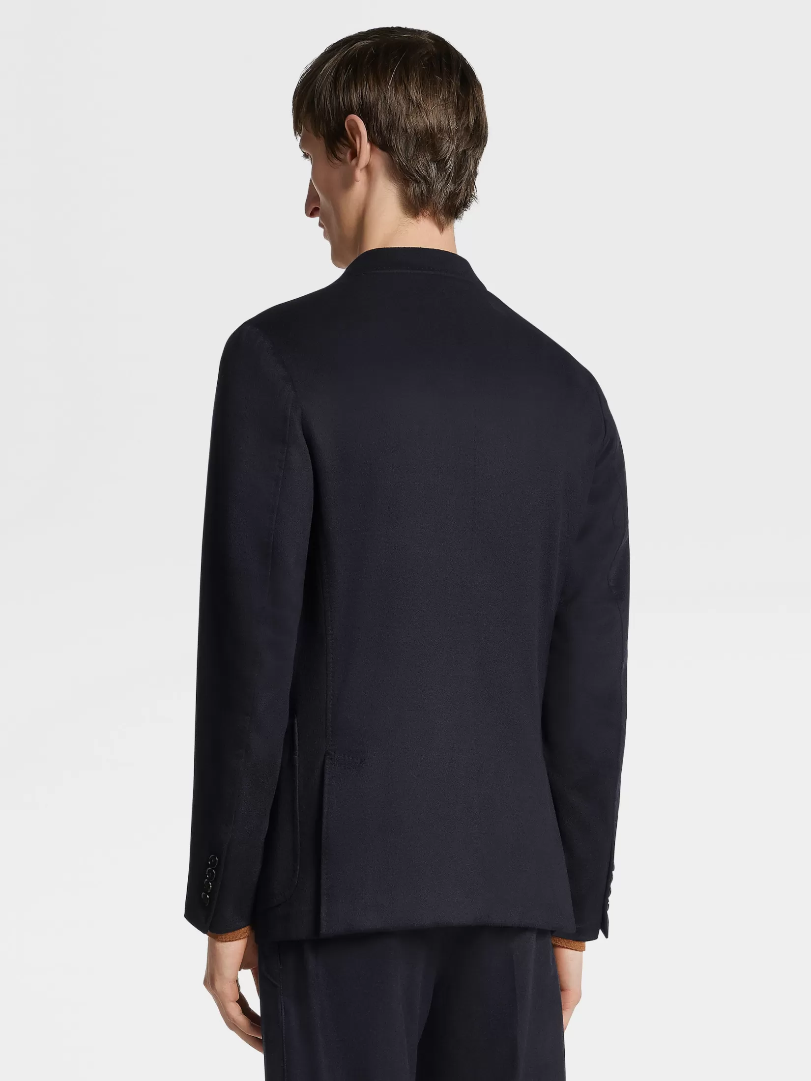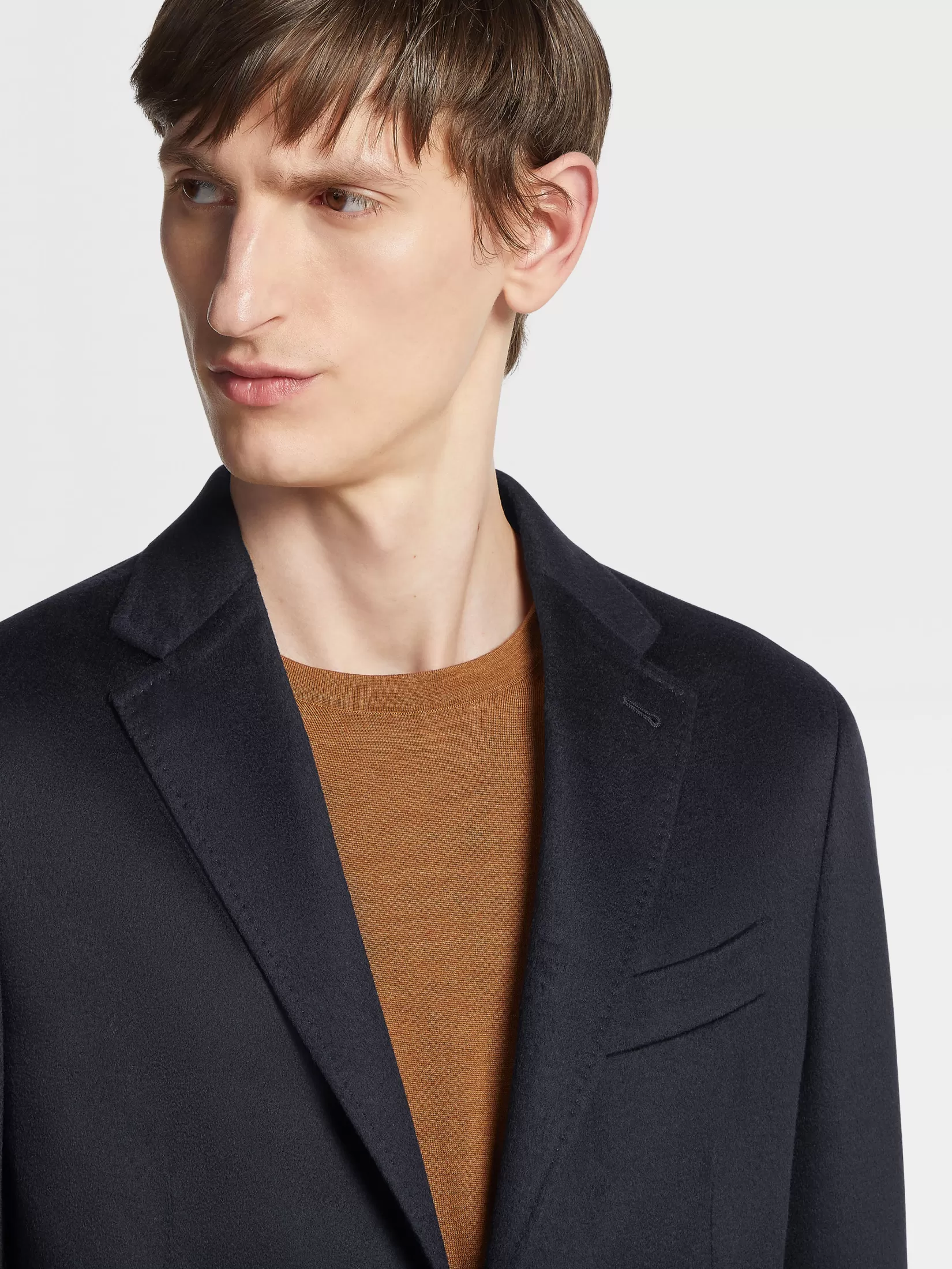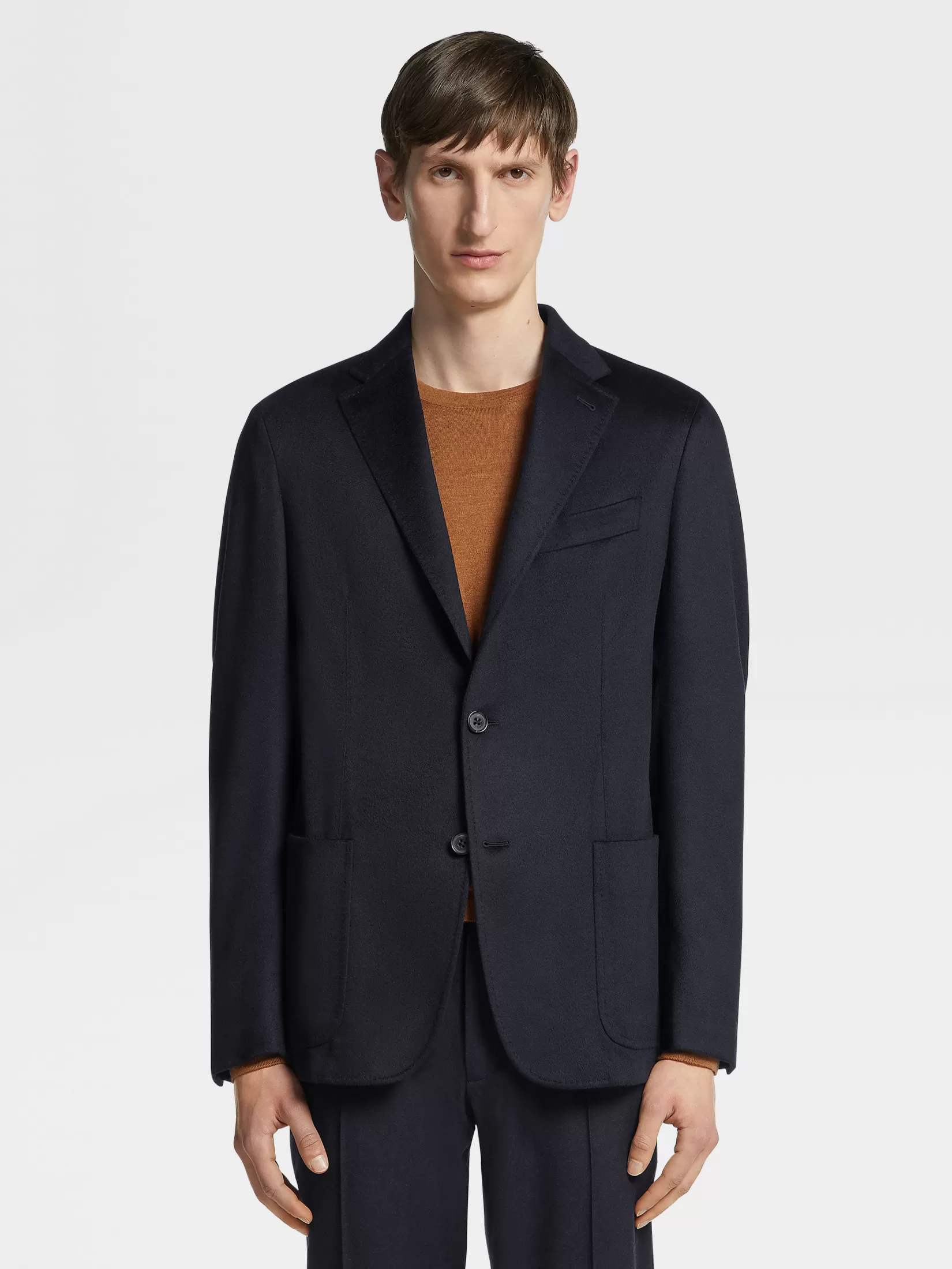 Esta chaqueta camisera azul marino está confeccionada con uno de los tejidos más exclusivos de la marca, Oasi Cashmere, que demuestra cómo se puede elegantizar una prenda mediante una confección lujosa. Esta chaqueta tiene un tacto muy suave y presenta sutiles detalles en piel. Su discreto diseño se complementa con bolsillos de parche.