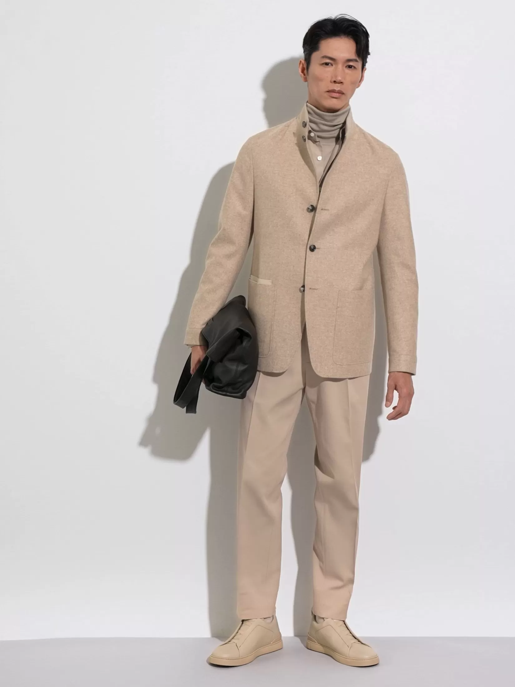 La chaqueta Chore Il Conte gris pardo claro jaspeado está confeccionada con fibras de cachemira selectas que dan forma al tejido Oasi Cashmere. Su diseño versátil y práctico está acabado con cuello mao. El minibolsillo de piel en la parte derecha y la insignia Zegna 232 Road Brand Mark de piel firman este modelo.