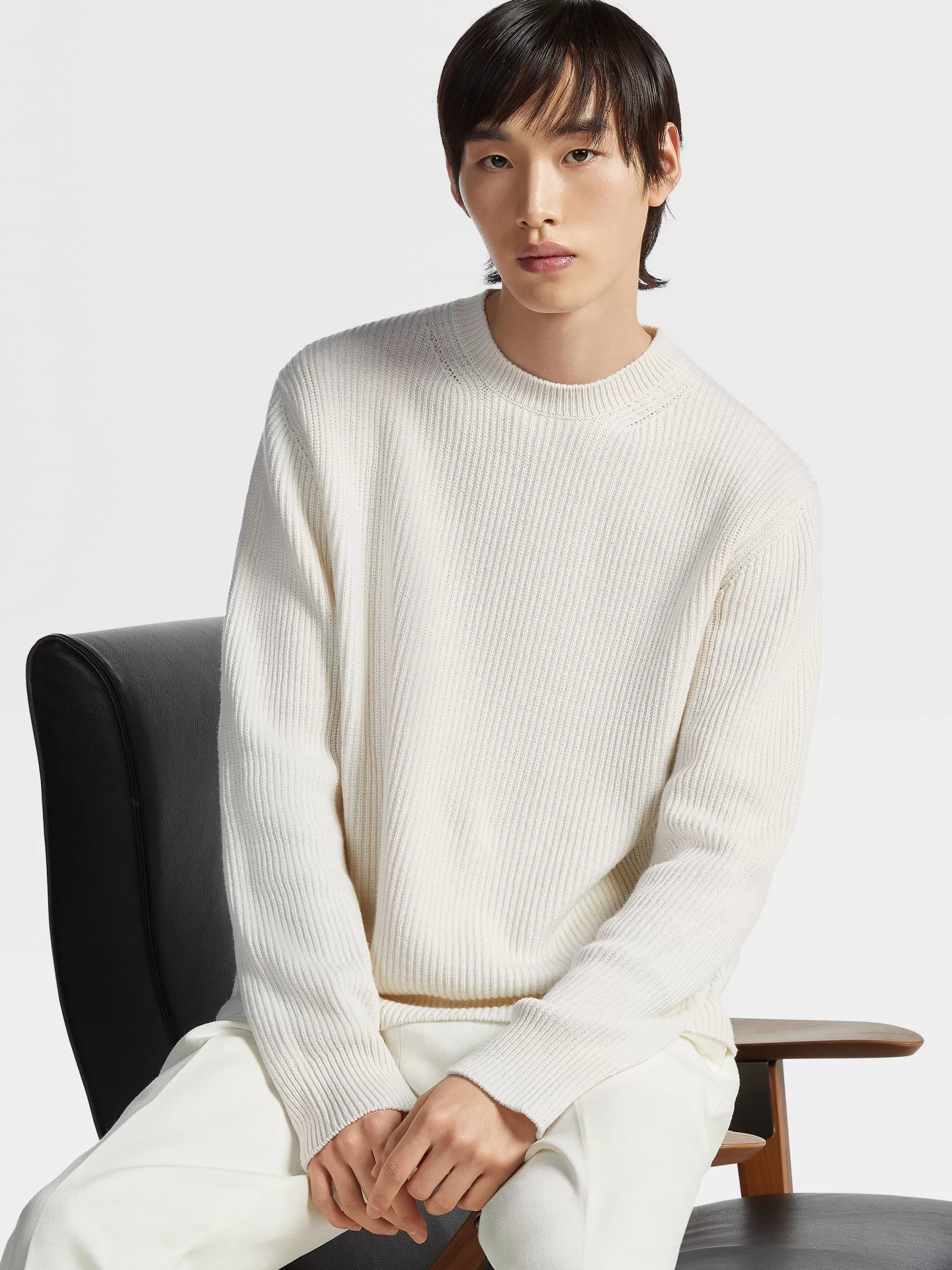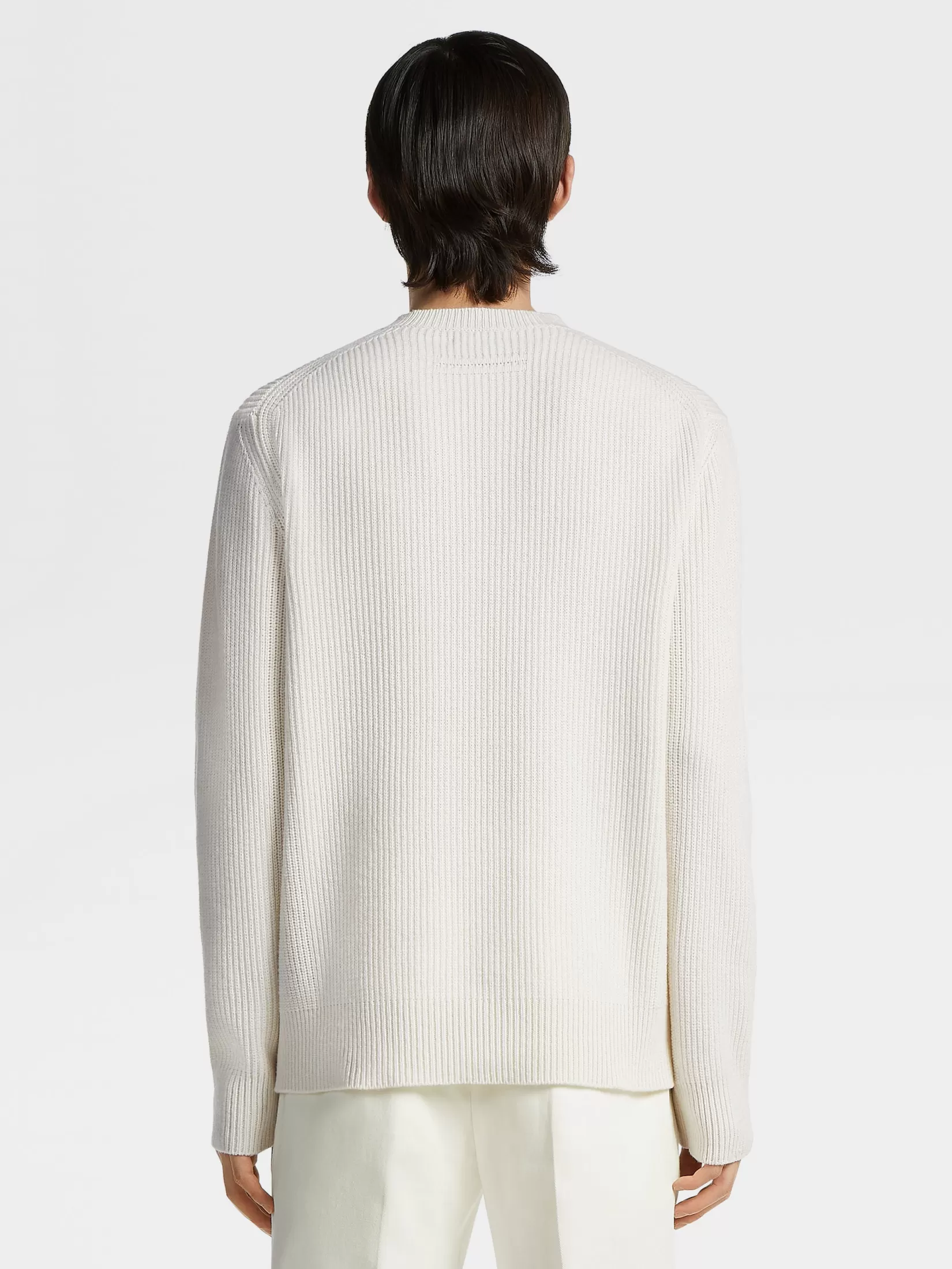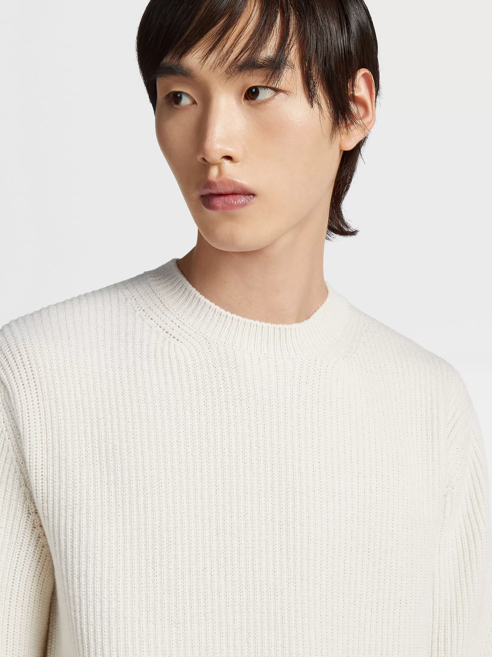 Este jersey de cuello redondo, blanco mixto, está confeccionado con uno de los tejidos más finos y preciados de Zegna, Oasi Cashmere, para reflejar el enfoque medioambiental de la marca en cuanto a los tejidos lujosos. El discreto color de este jersey se puede conjuntar con muchas prendas. El clásico cuello redondo y el borde acanalado completan este modelo.